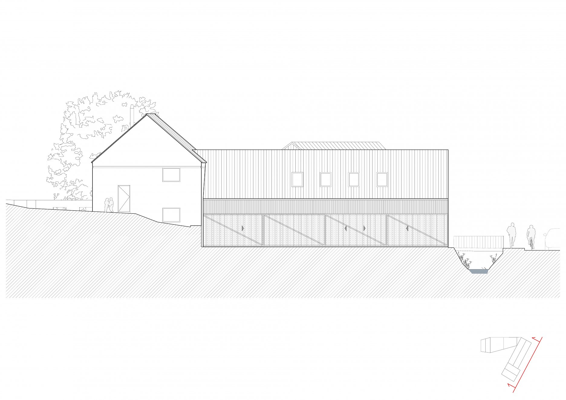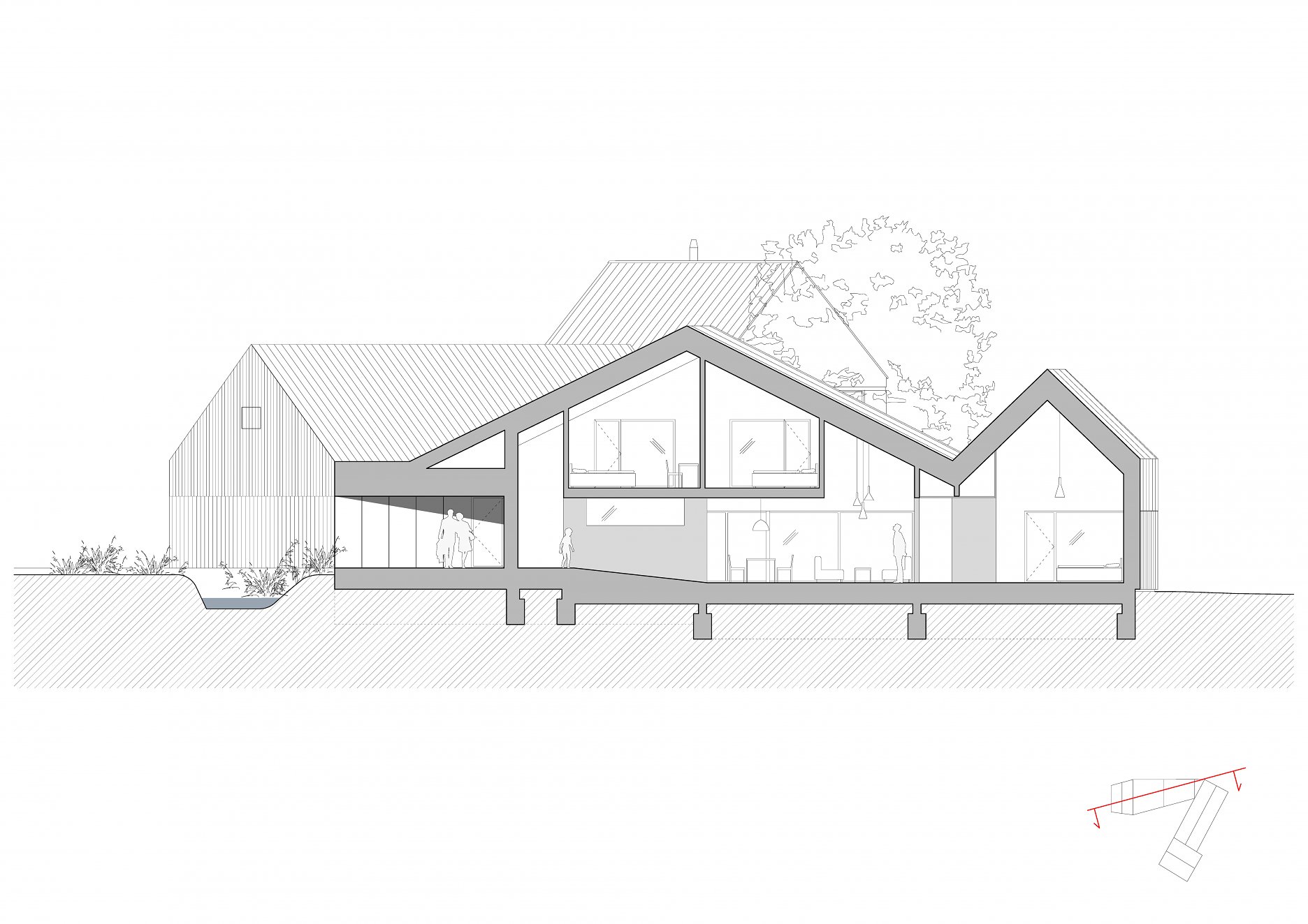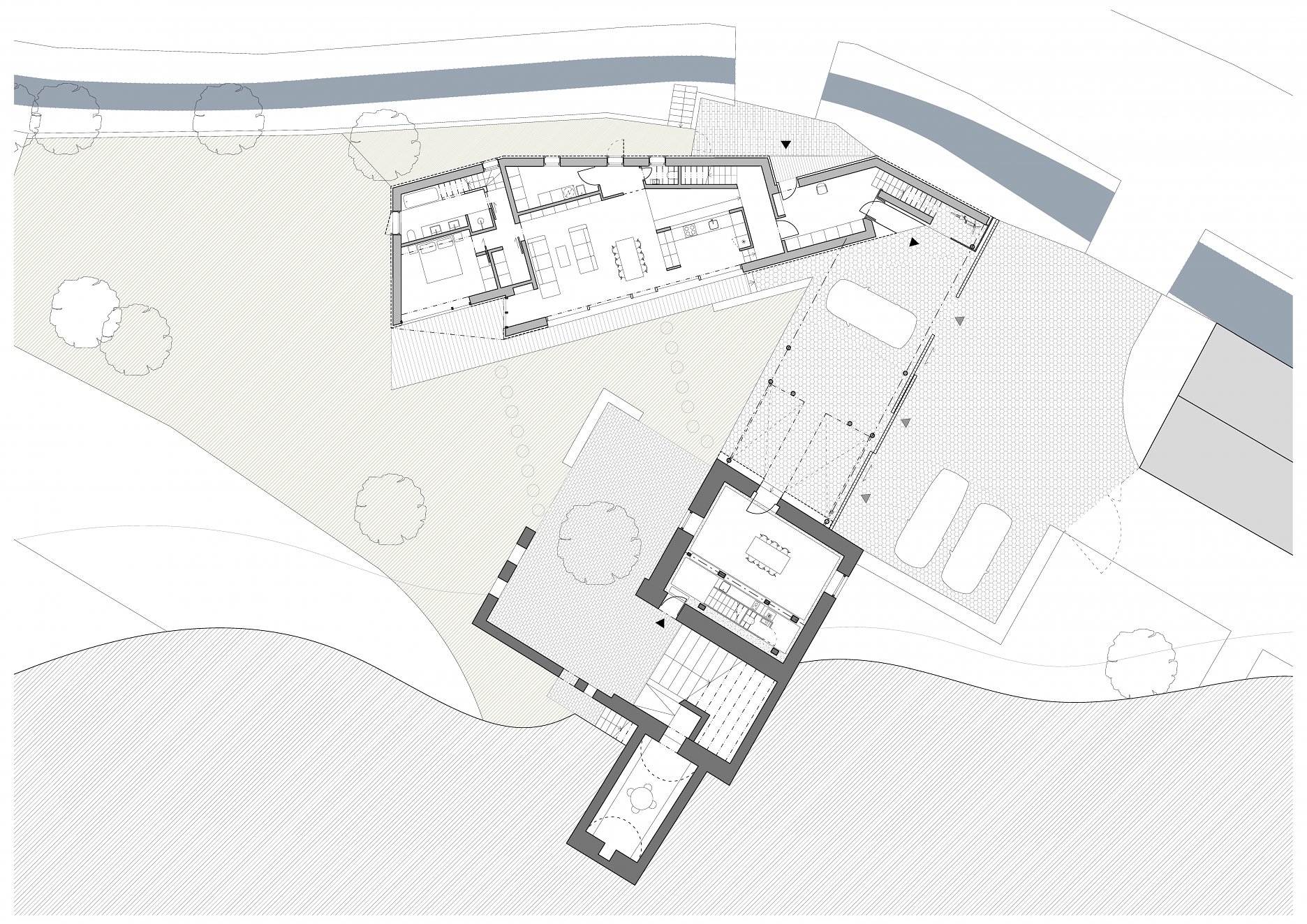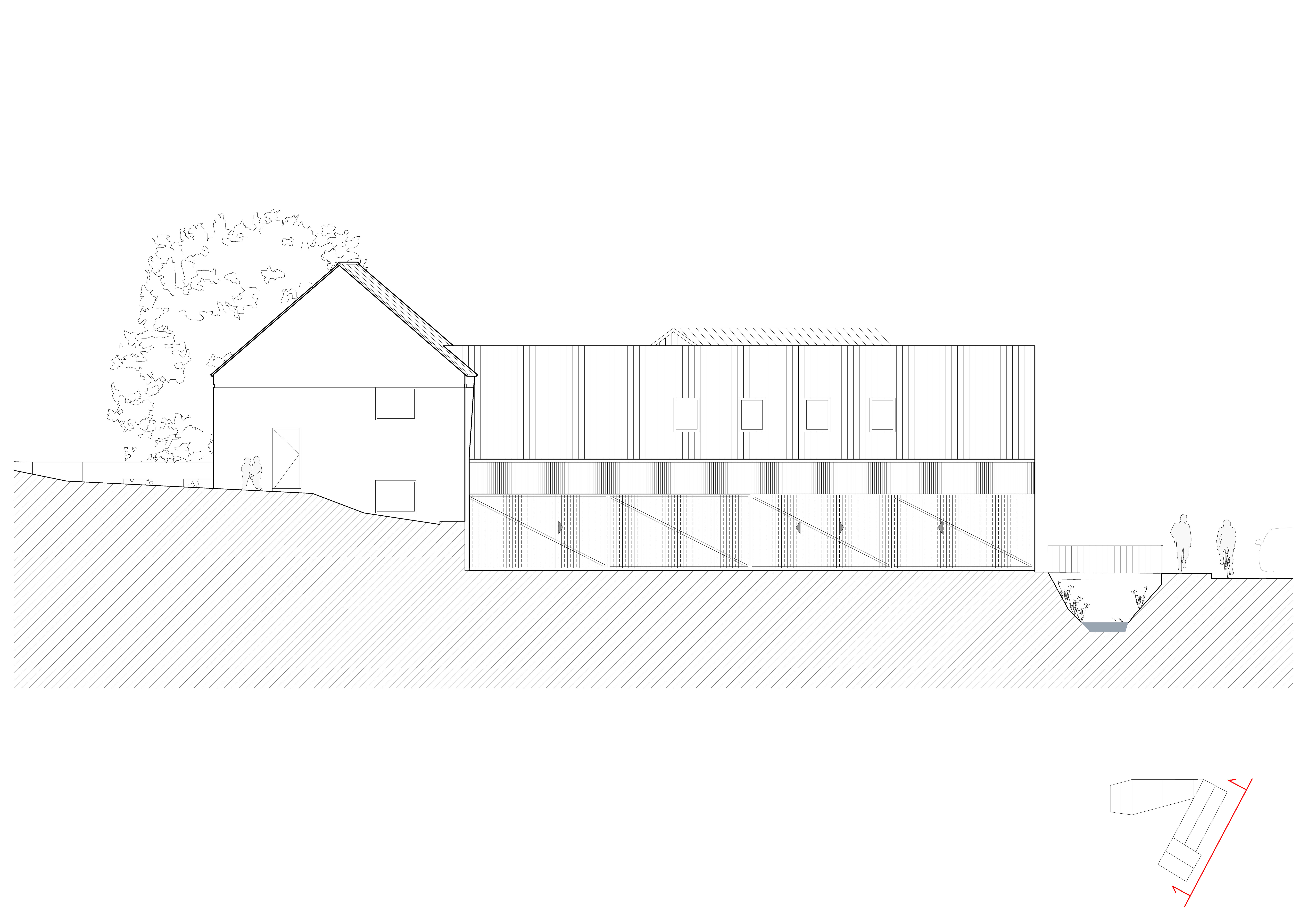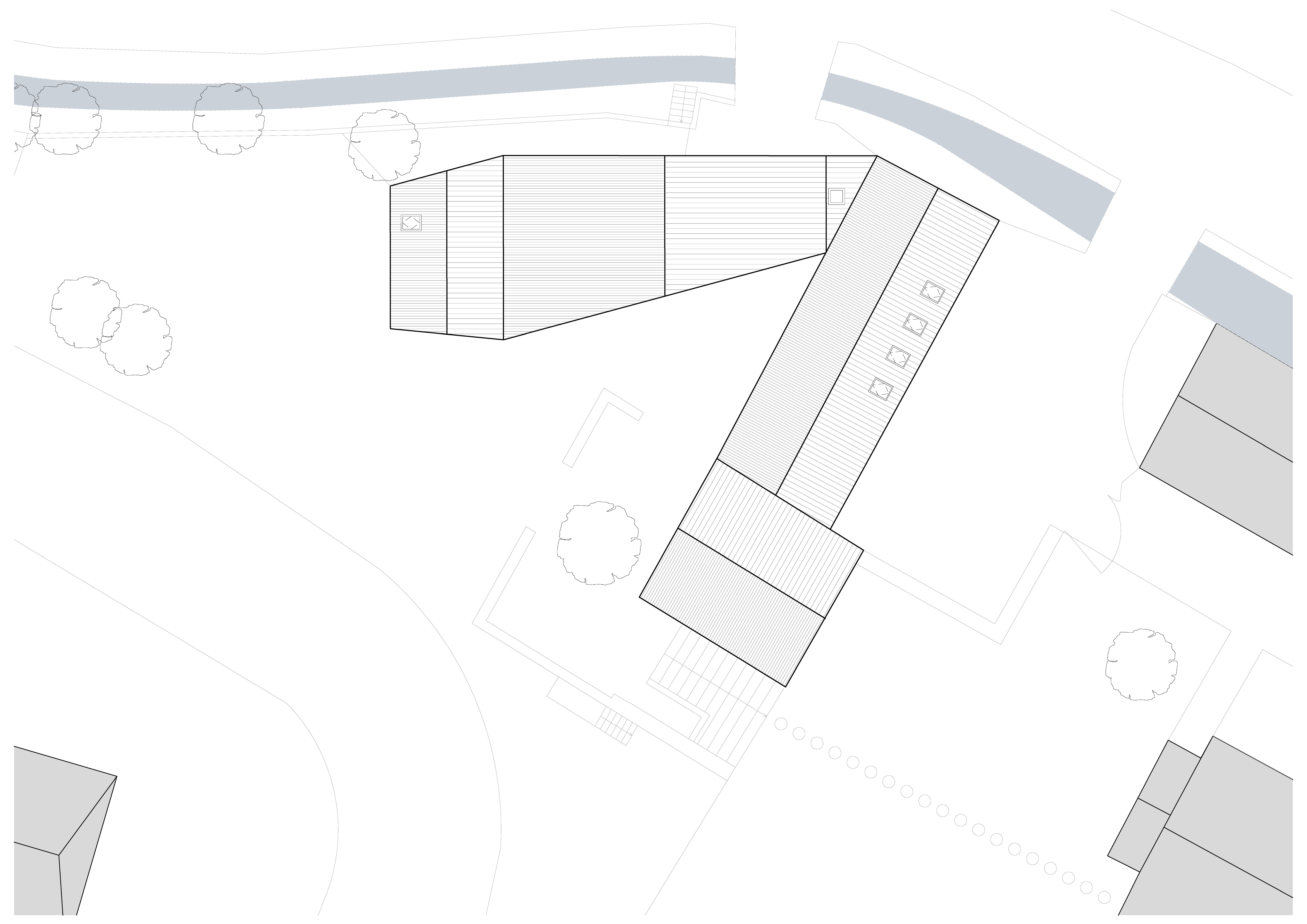 Tvar parcely je komplikovaný. Velkou část pozemku zabírá mlýn a jeho pozdější dostavby. Nehodnotná zemědělská stavení jsou u potoka. Tyto malé objekty a dostavby demolujeme. Výsledným řešením je usedlost tvořená třemi hmotami. Mlýnem, který částečně zachováváme, novostavbou rodinného domu, která zaujímá prostor u potoka a zastřešení parkovacích stání, které oba objekty spojuje. Mezi těmito třemi hmotami vzniká příjemný, částečně uzavřený prostor zahrady a dvora.