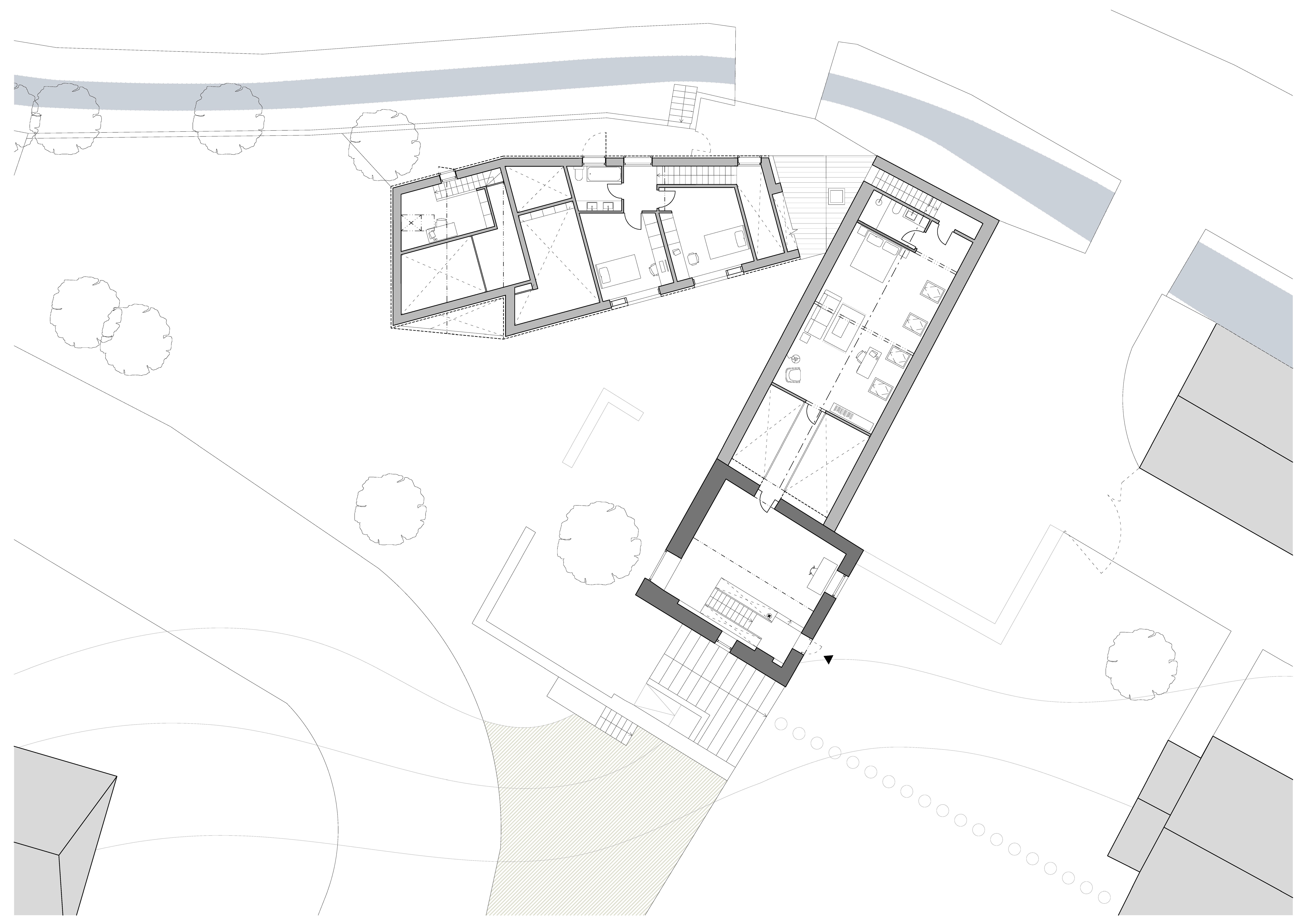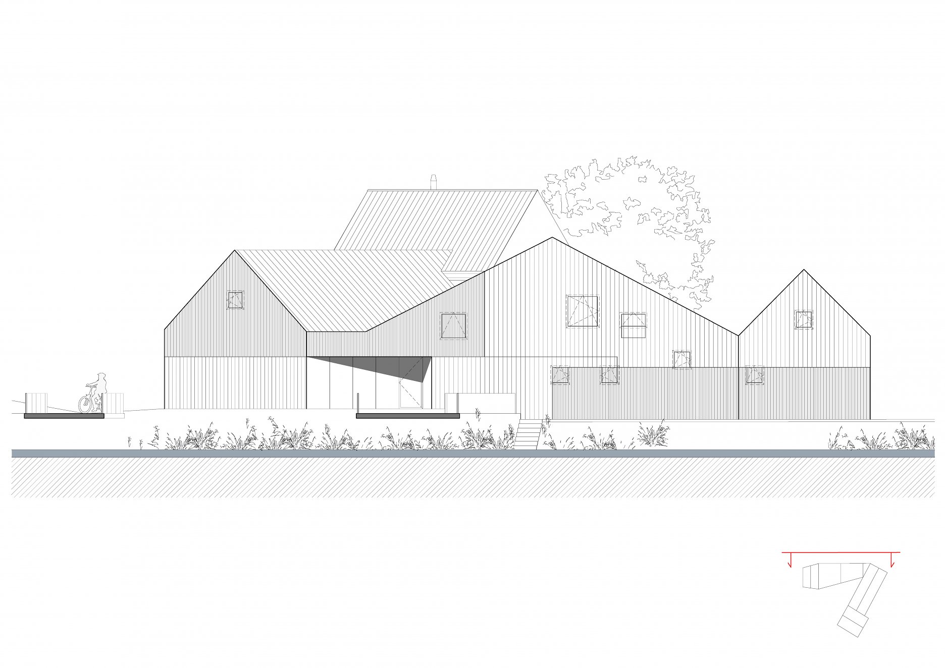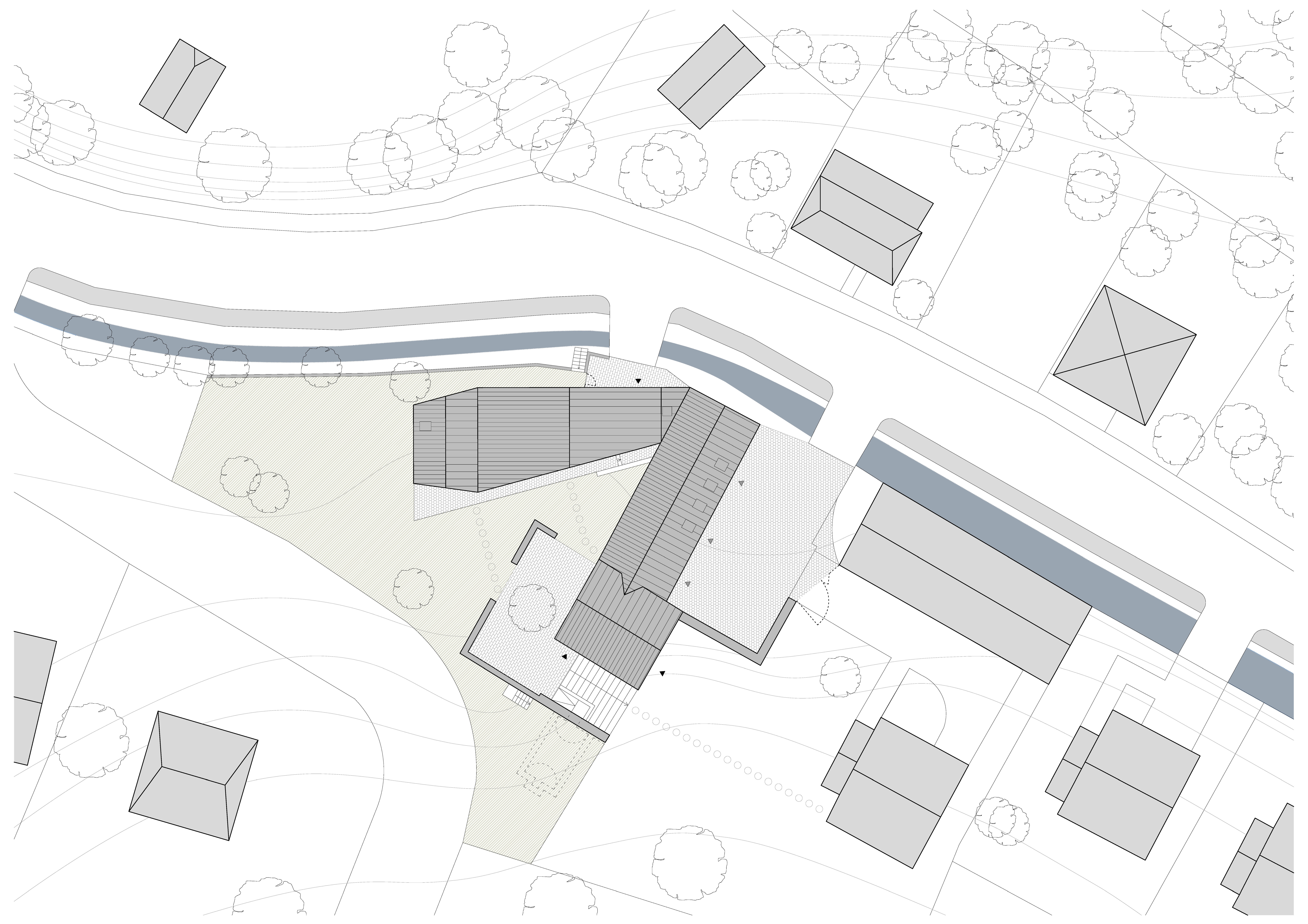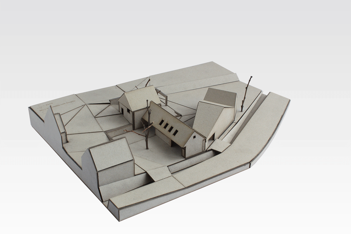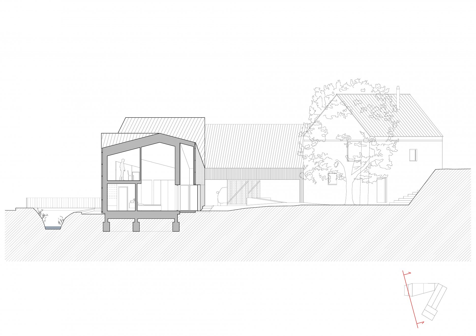 Tvar parcely je komplikovaný. Velkou část pozemku zabírá mlýn a jeho pozdější dostavby. Nehodnotná zemědělská stavení jsou u potoka. Tyto malé objekty a dostavby demolujeme. Výsledným řešením je usedlost tvořená třemi hmotami. Mlýnem, který částečně zachováváme, novostavbou rodinného domu, která zaujímá prostor u potoka a zastřešení parkovacích stání, které oba objekty spojuje. Mezi těmito třemi hmotami vzniká příjemný, částečně uzavřený prostor zahrady a dvora.