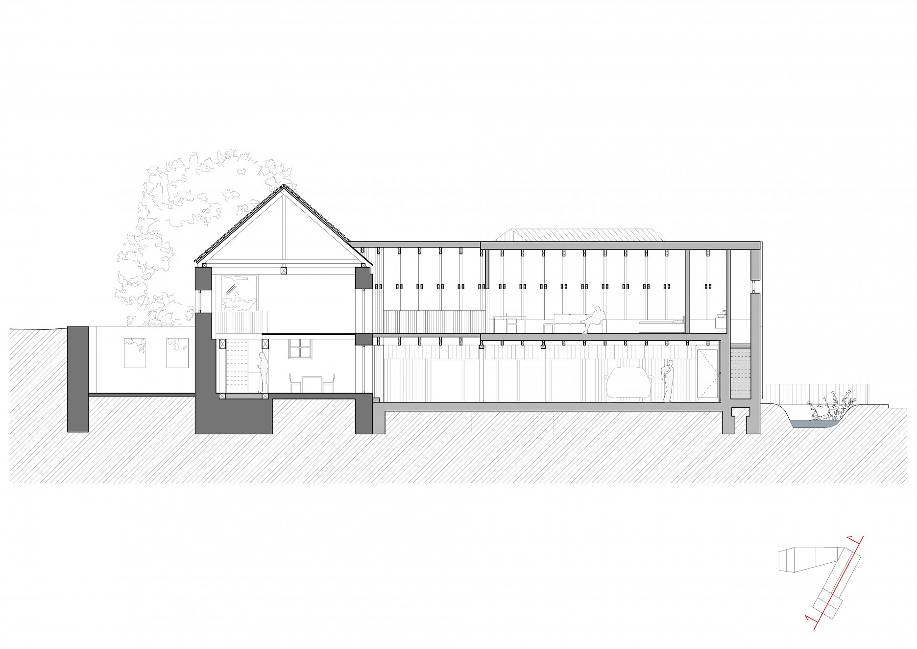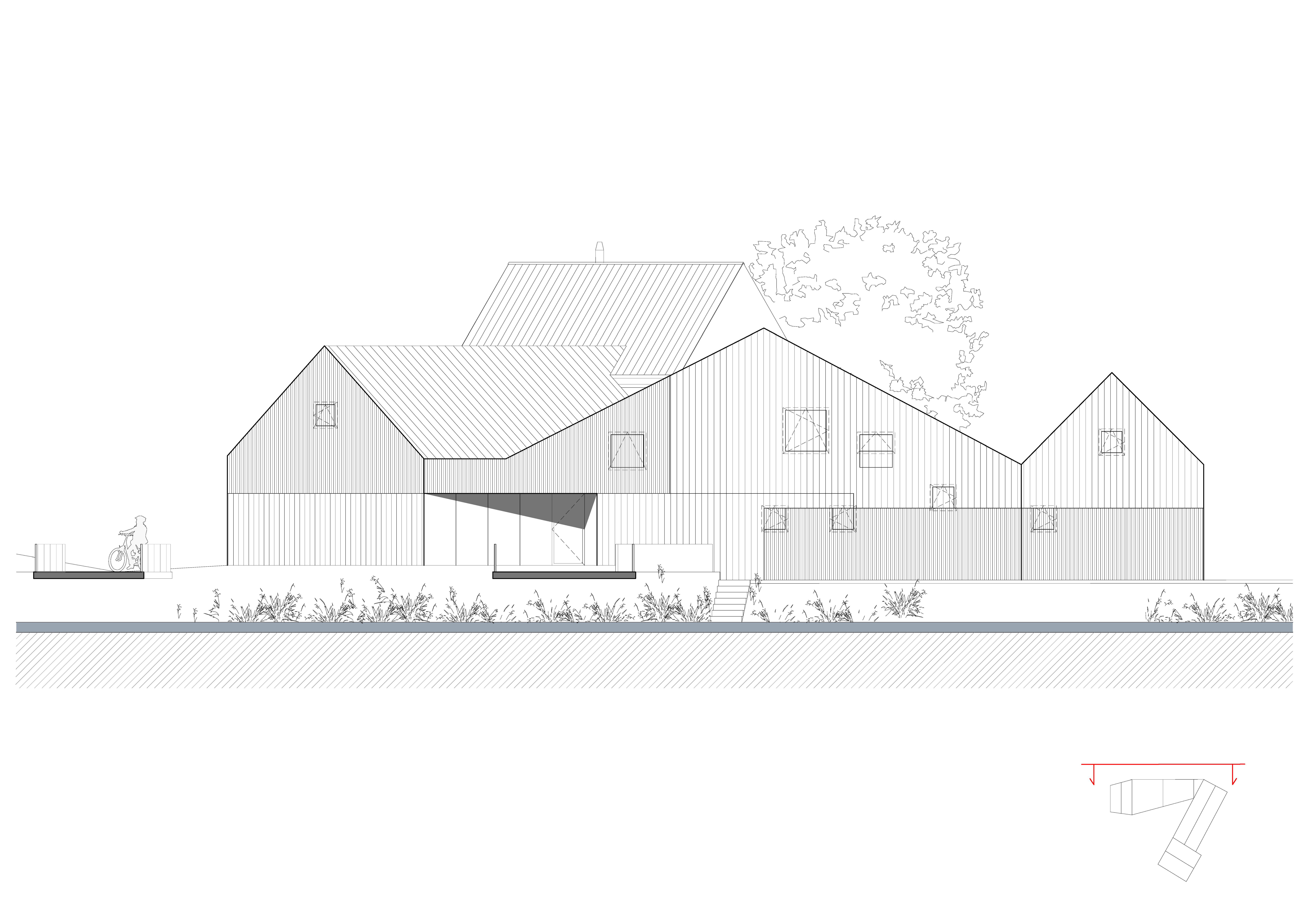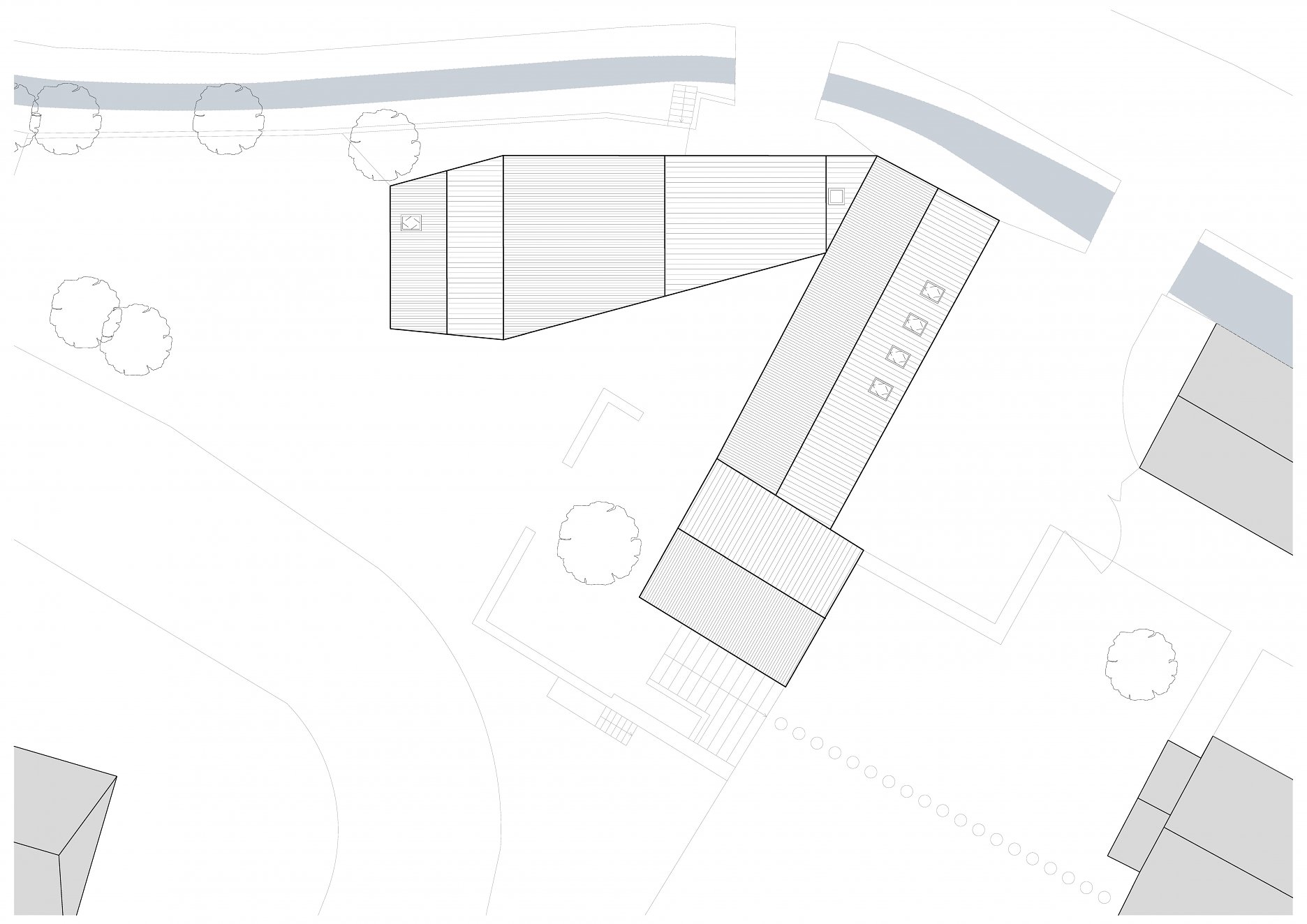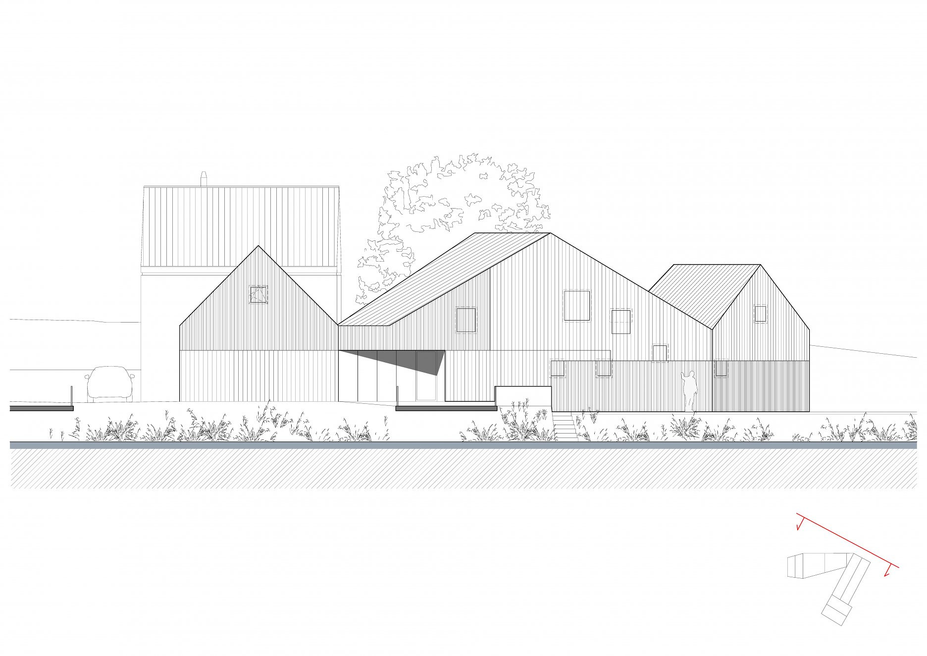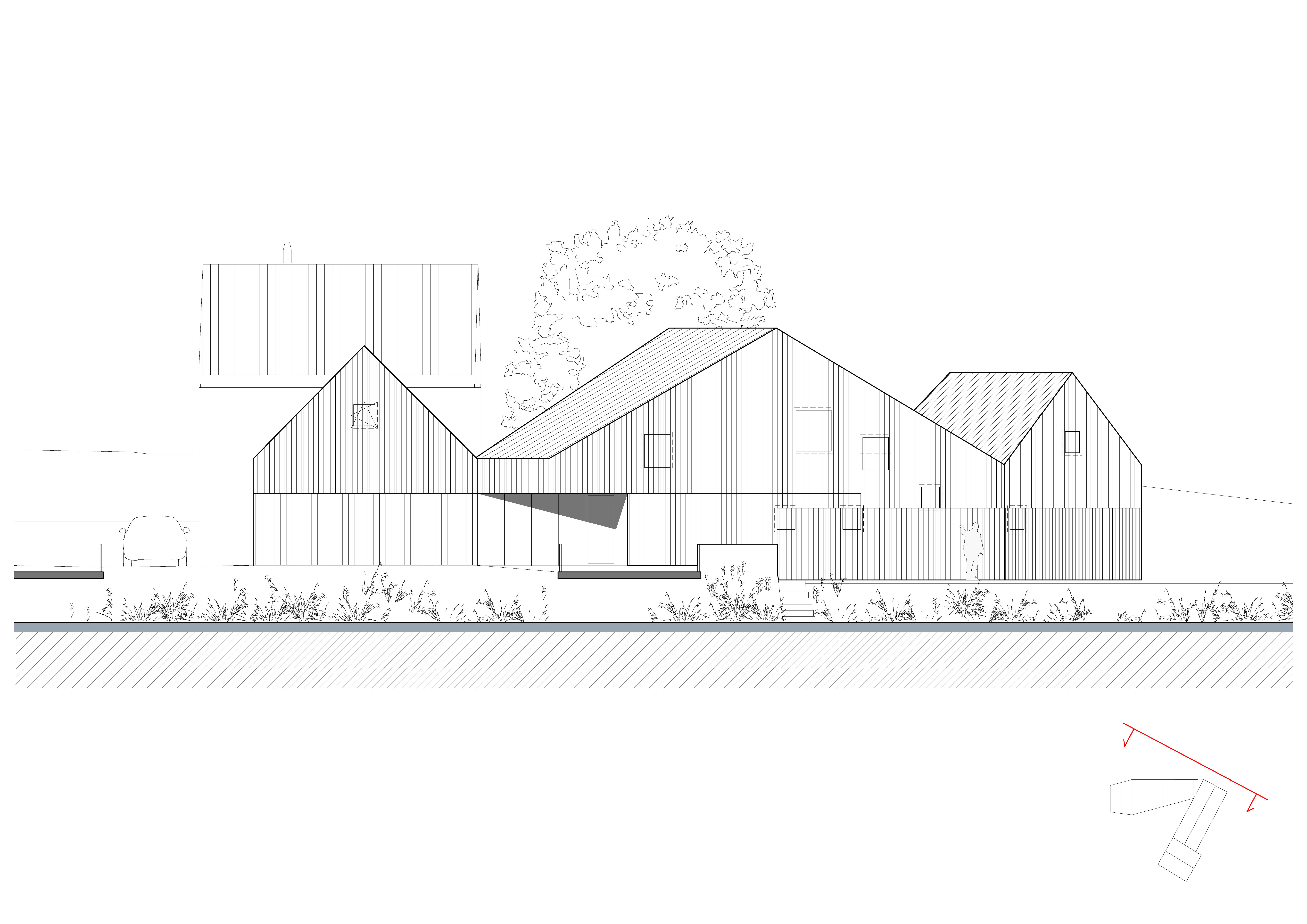 Tvar parcely je komplikovaný. Velkou část pozemku zabírá mlýn a jeho pozdější dostavby. Nehodnotná zemědělská stavení jsou u potoka. Tyto malé objekty a dostavby demolujeme. Výsledným řešením je usedlost tvořená třemi hmotami. Mlýnem, který částečně zachováváme, novostavbou rodinného domu, která zaujímá prostor u potoka a zastřešení parkovacích stání, které oba objekty spojuje. Mezi těmito třemi hmotami vzniká příjemný, částečně uzavřený prostor zahrady a dvora.