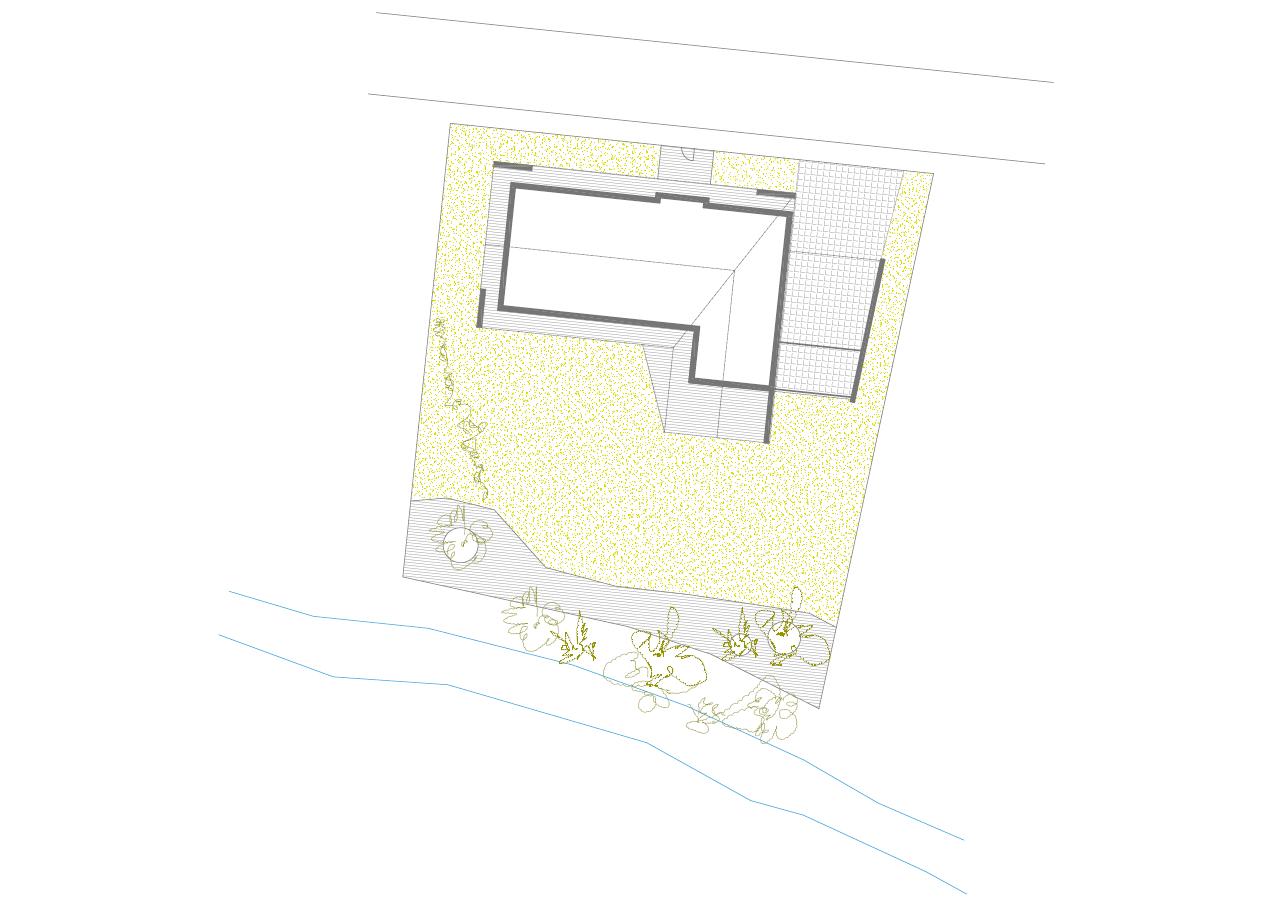 Všetky obytné miestnosťi sú orientované na juh, pričom z každej izby sa dá výjsť na terasu. Terasa „levituje“ nad terénom, okolie domu je ponechané a upravené v prirodzenej podobe, lúčny trávnik prechádza na mólo nad potokom.