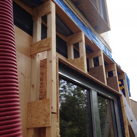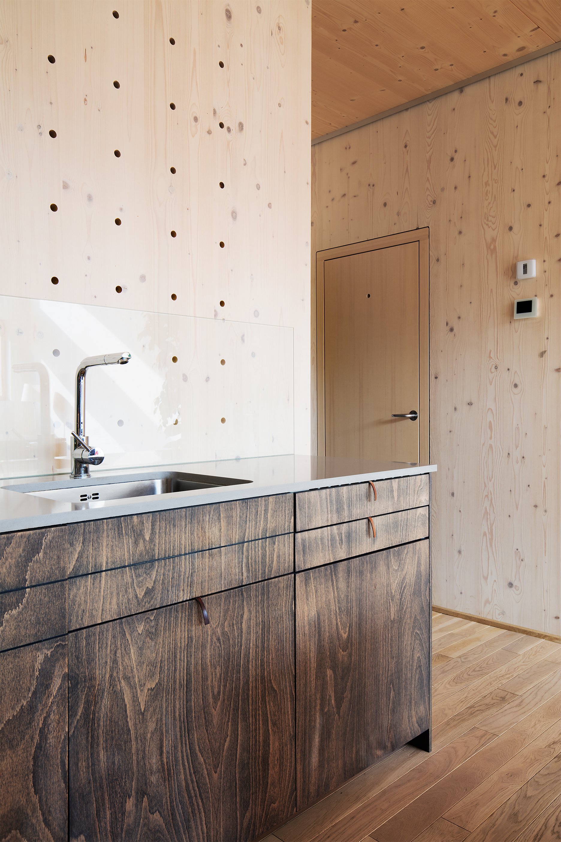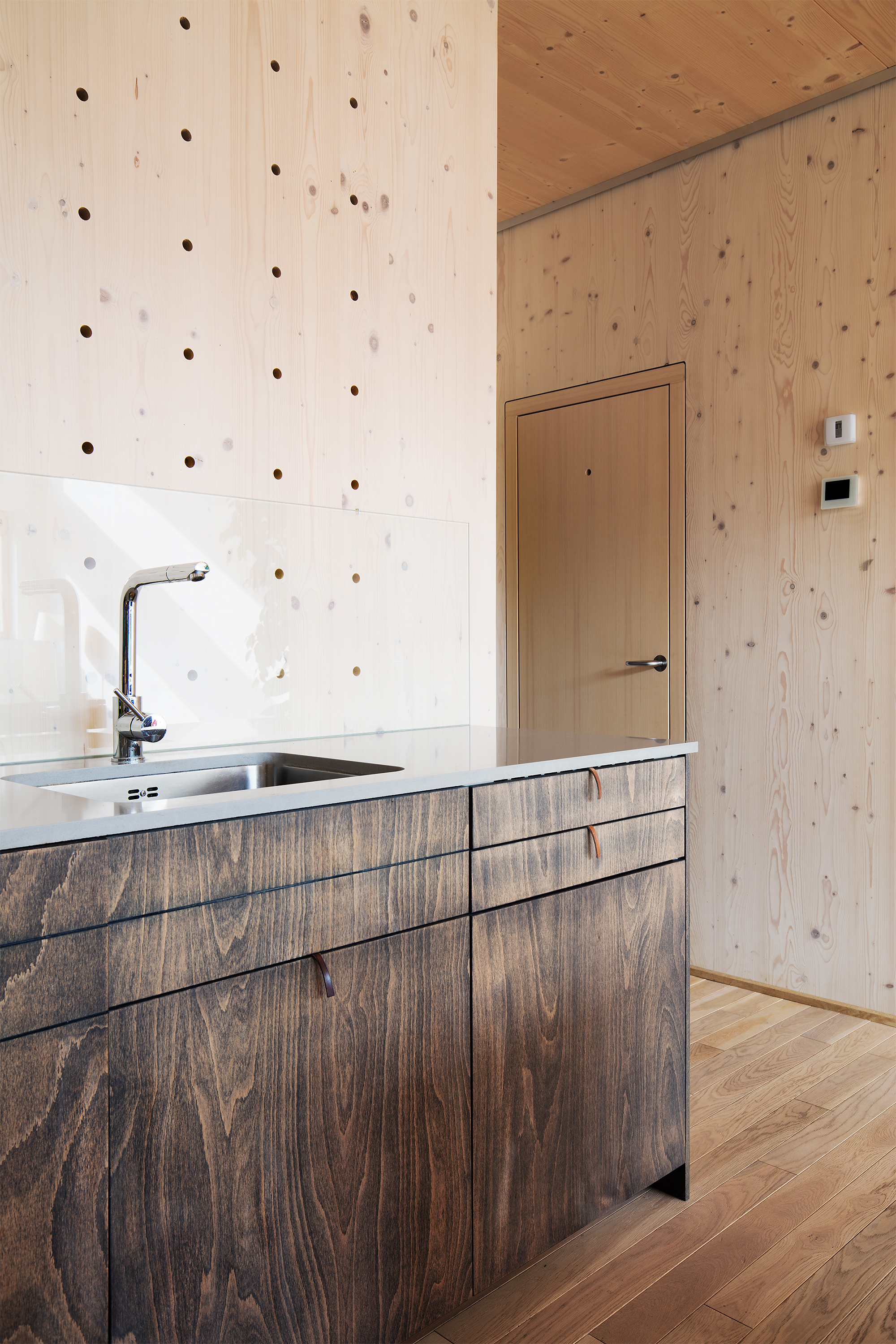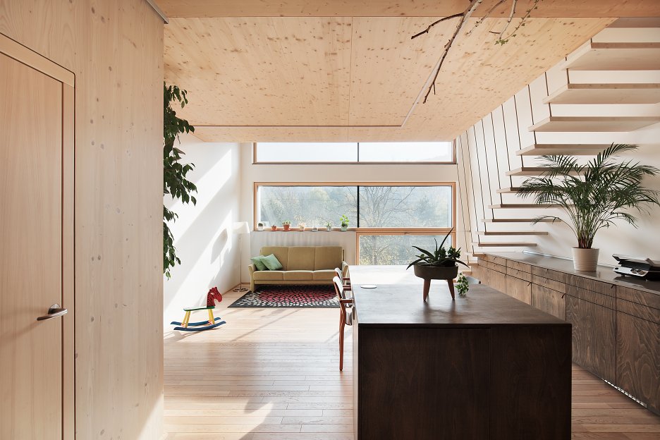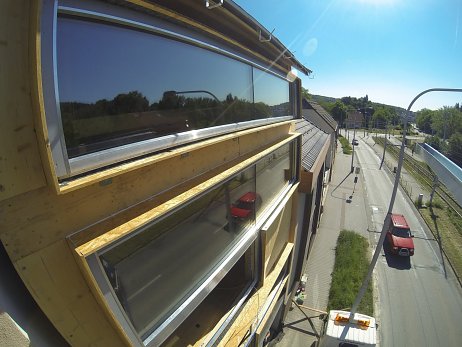 Vzhľad uličnej fasády definuje veľkoplošné zasklenie so skrytými rámami a obklad z ručne opaľovaného smrekovcového dreva, ktorá nepotrebuje ďalšie chemické ošetrenie. Použitie prírodných materiálov pokračuje aj pri voľbe tepelnej izolácie. Obvodové steny sú obalené do drevovláknitej izolácie hrúbky 240 mm. Autori naplno využili vlastnosti CLT panelov, kedy konštrukčný materiál vytvára priamo pohľadovú vrstvu v interiéri.
