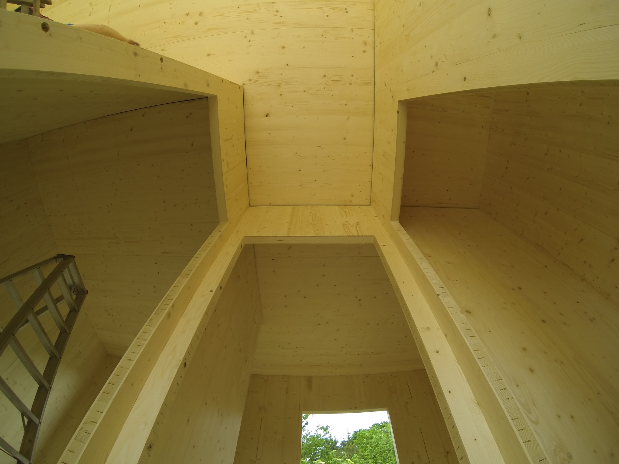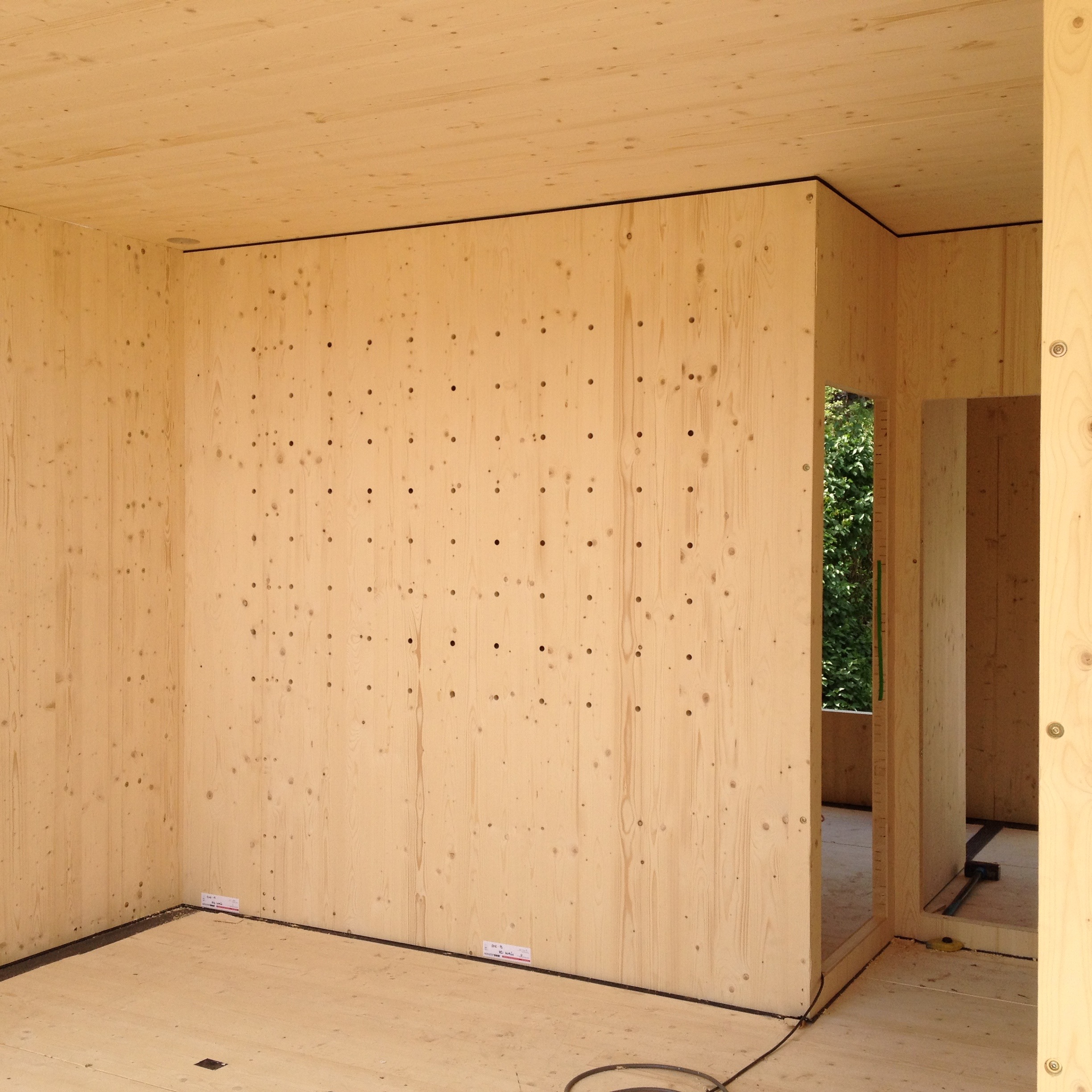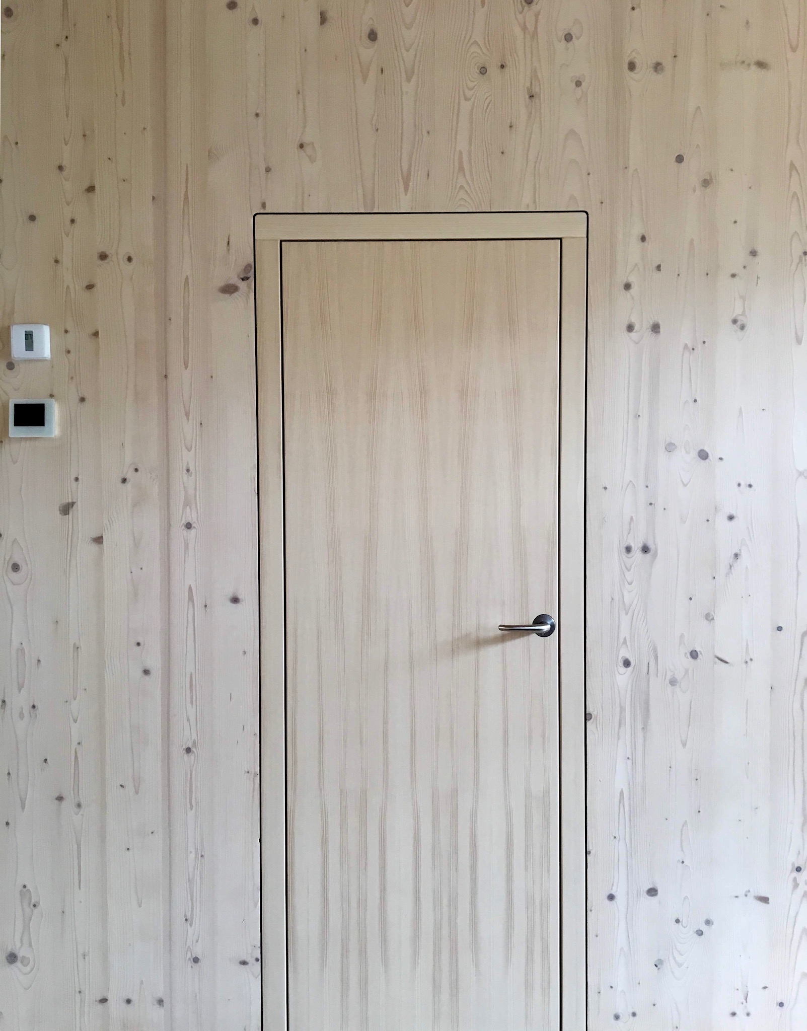 Vzhľad uličnej fasády definuje veľkoplošné zasklenie so skrytými rámami a obklad z ručne opaľovaného smrekovcového dreva, ktorá nepotrebuje ďalšie chemické ošetrenie. Použitie prírodných materiálov pokračuje aj pri voľbe tepelnej izolácie. Obvodové steny sú obalené do drevovláknitej izolácie hrúbky 240 mm. Autori naplno využili vlastnosti CLT panelov, kedy konštrukčný materiál vytvára priamo pohľadovú vrstvu v interiéri.