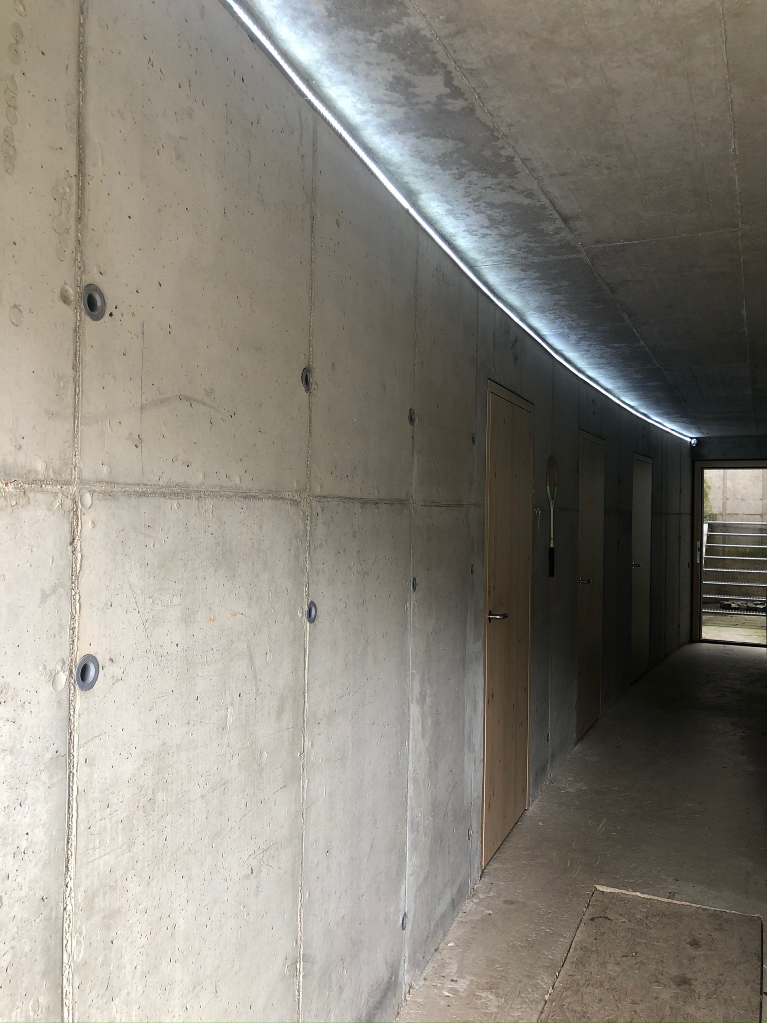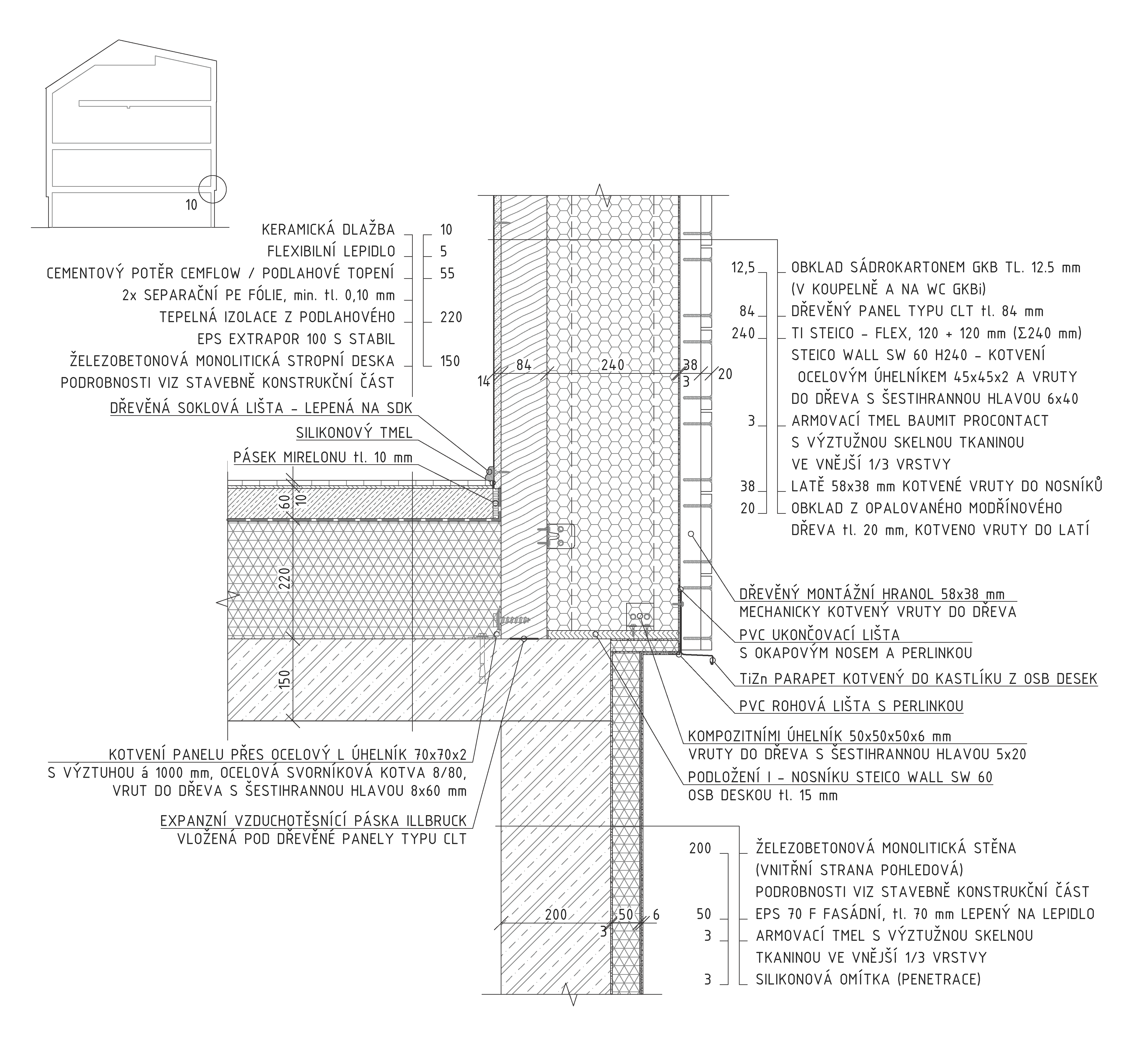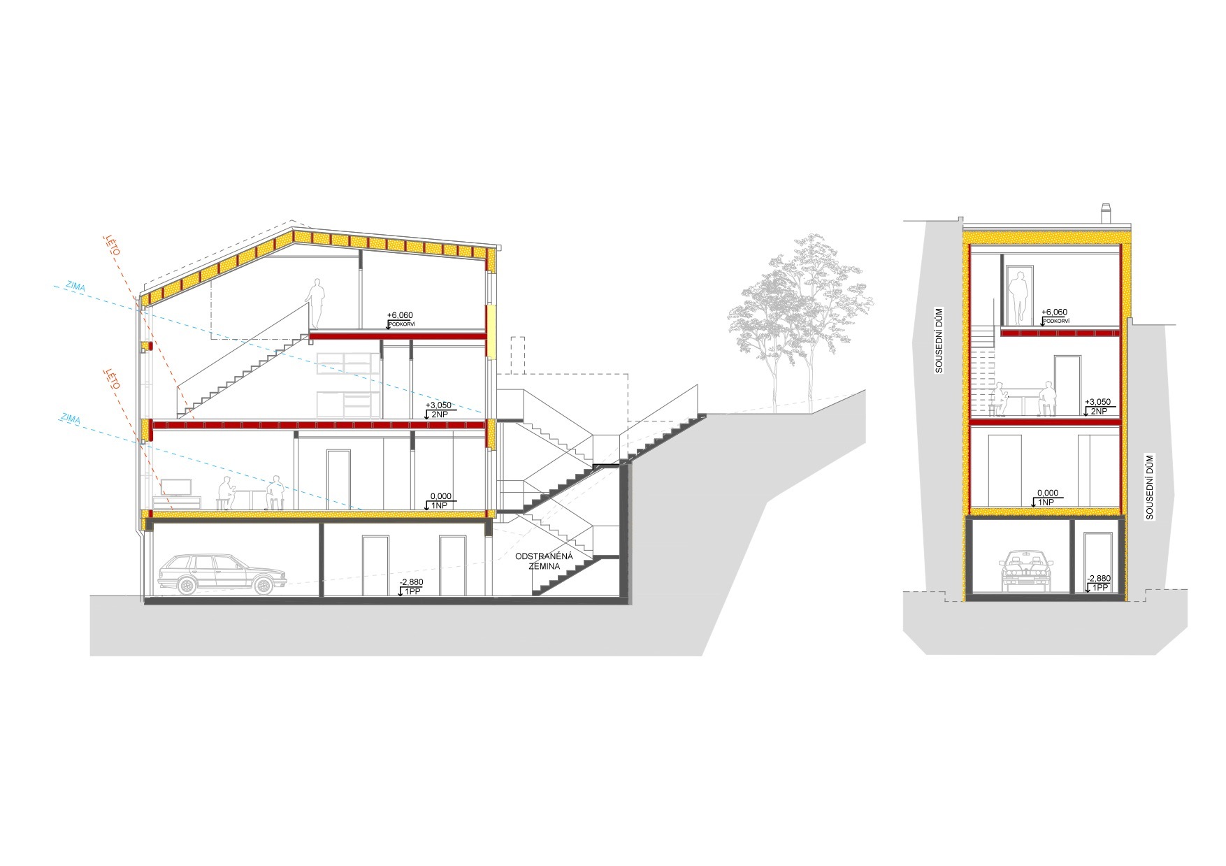 Ako základ pre obytnú stavbu slúži technické podlažie, v ktorom je situovaná garáž a kotolňa. Nevykurovaný suterén je realizovaný ako monolitická konštrukcia z pohľadového betónu. Zo západnej a východnej strany uzatvárajú prieluku štítové steny susedných domov. Uličná fasáda, do ktorej smerujú rozmerné presklené plochy obytných miestností, má ideálnu južnú orientáciu. Severnú stranu parcely ohraničuje prudko stúpajúci svah, v rámci ktorého vyriešili autori vertikálne prepojenie priestorov domu a samostatné vstupy do bytových jednotiek. Spomínané východiská boli kľúčové pre výslednú energetickú bilanciu domu. Monolitický suterén nesie ľahkú konštrukciu obytných podlaží. Vzhľadom na obmedzený priestor v prieluke zvolili architekti konštrukčný systém z CLT panelov. Dosky s hrúbkou 84 mm vo výsledku ušetrili aj voči subtílnej úspornej murovanej konštrukcii 7,3 m2 využiteľnej podlahovej plochy.