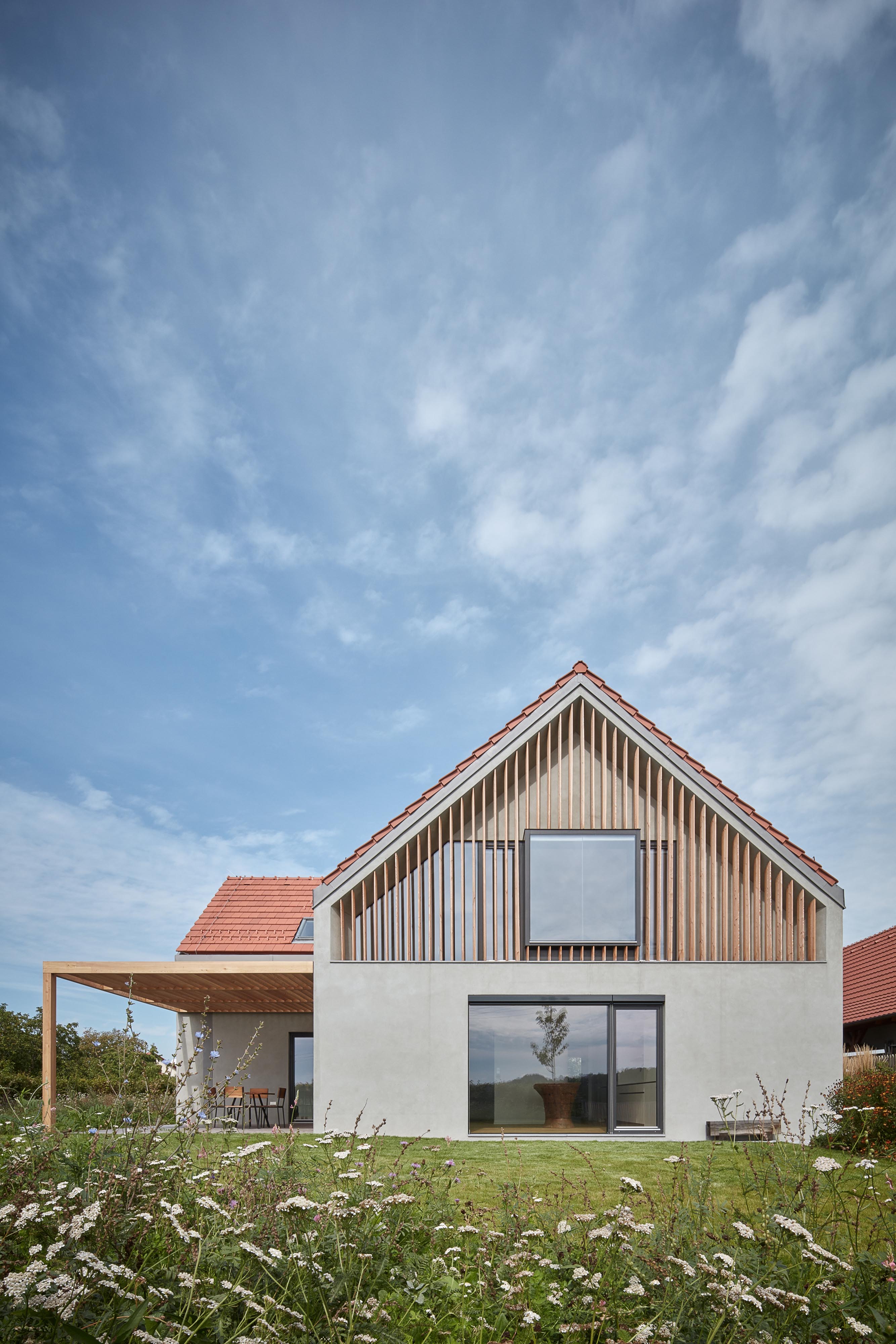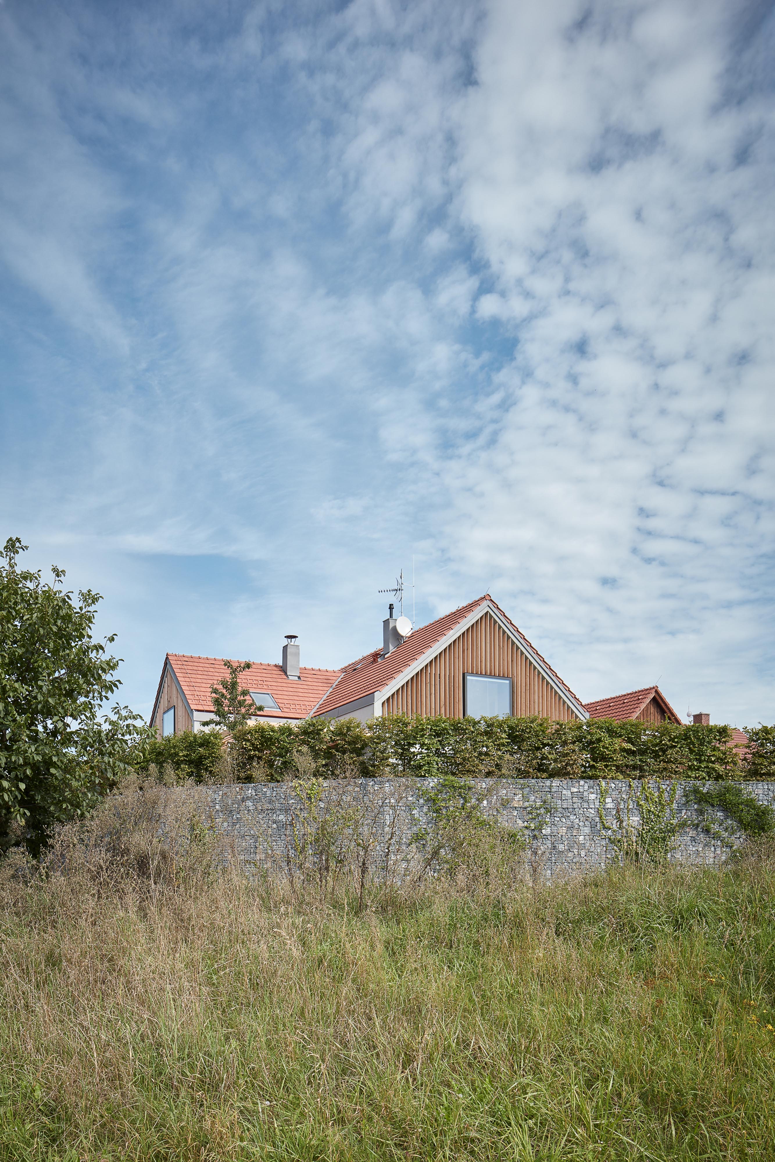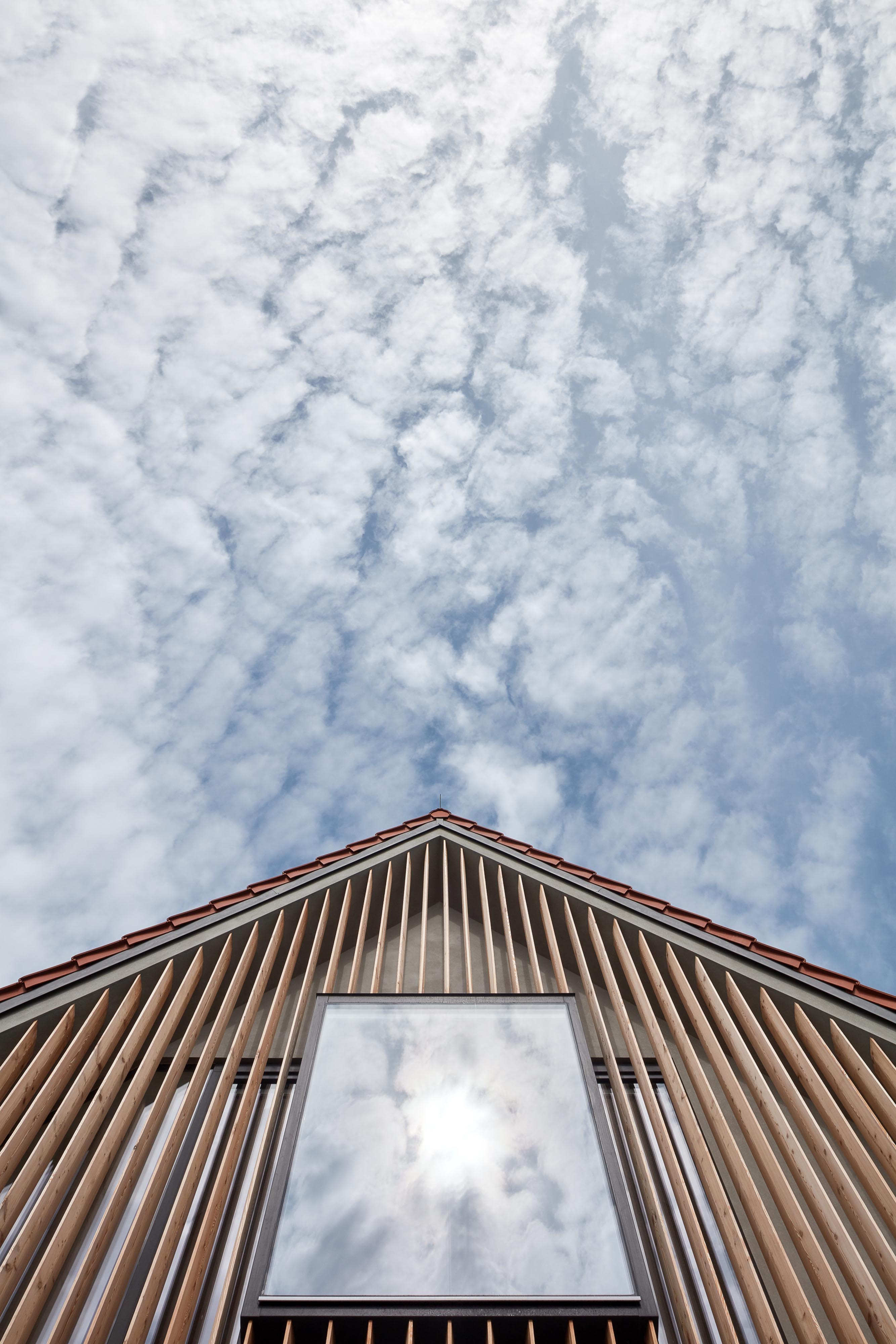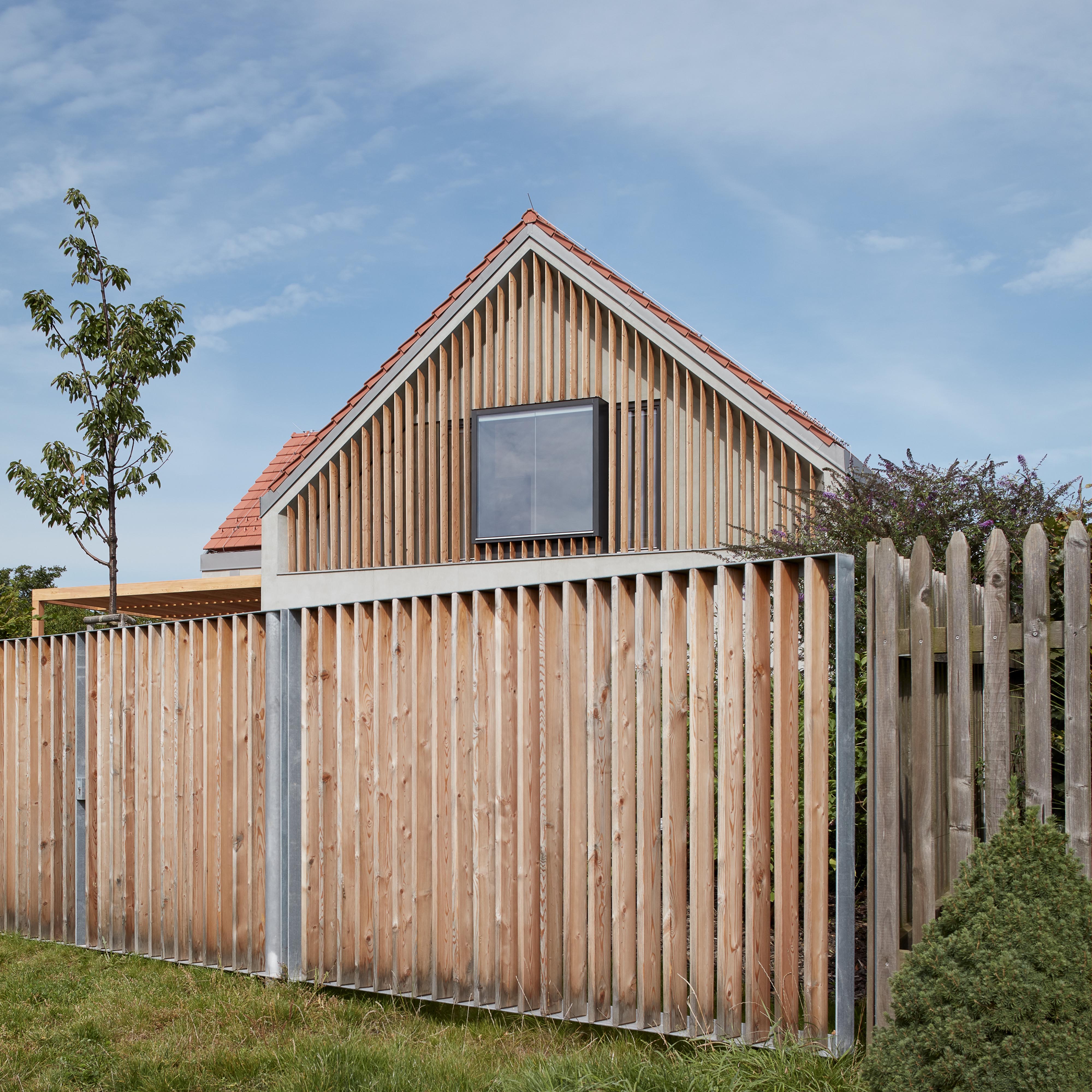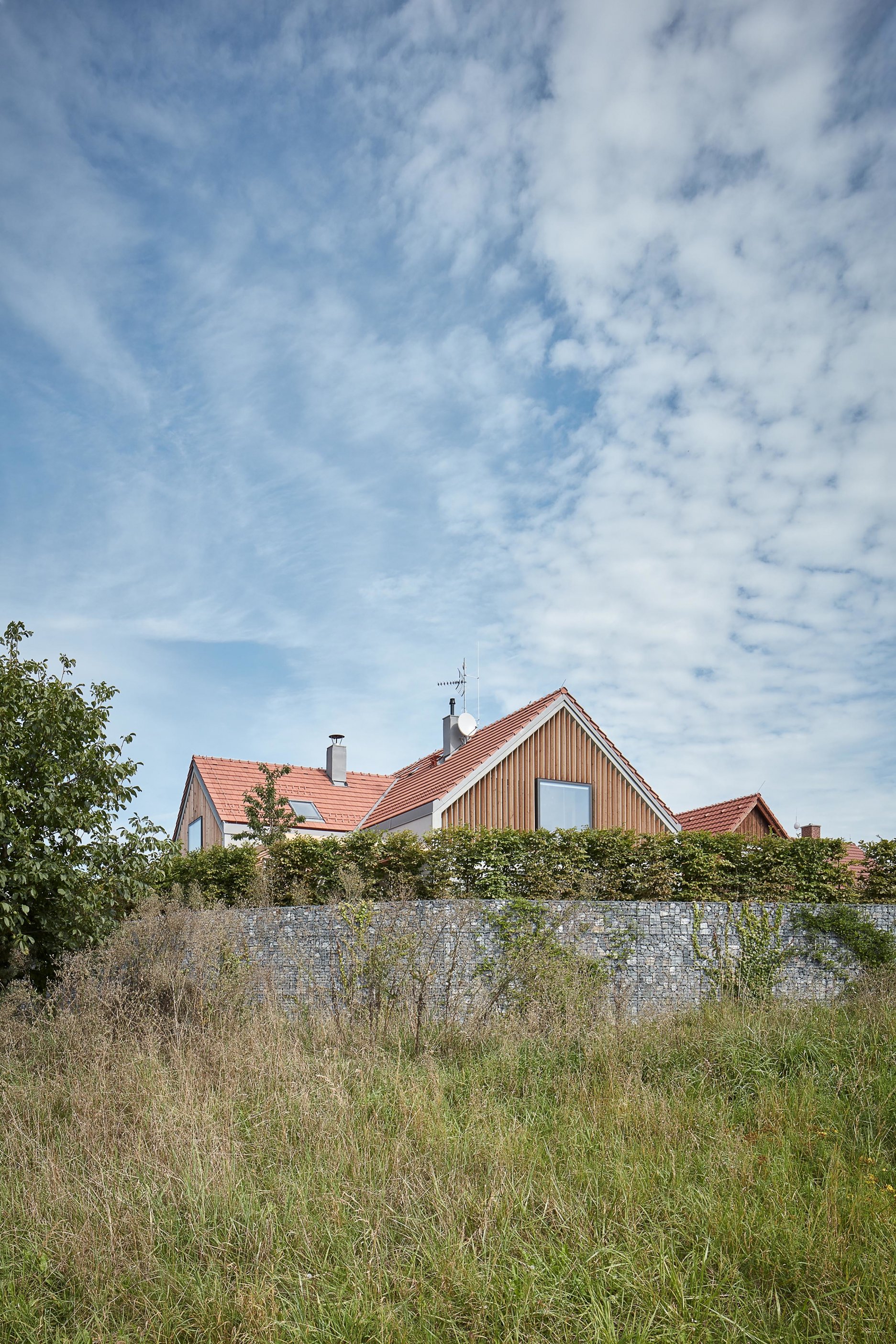 Na vrchnej časti fasády tak vznikol tradičný štít. Plocha za smrekovcovými lamelami je z veľkej časti presklená. Zvolené riešenie pri pohľade z boku evokuje drevený obklad štítu, zároveň však nebráni výhľadu z podkrovnej miestnosti. Raster drevených lamiel sa objavuje aj na pergole a novom oplotení pozemku.