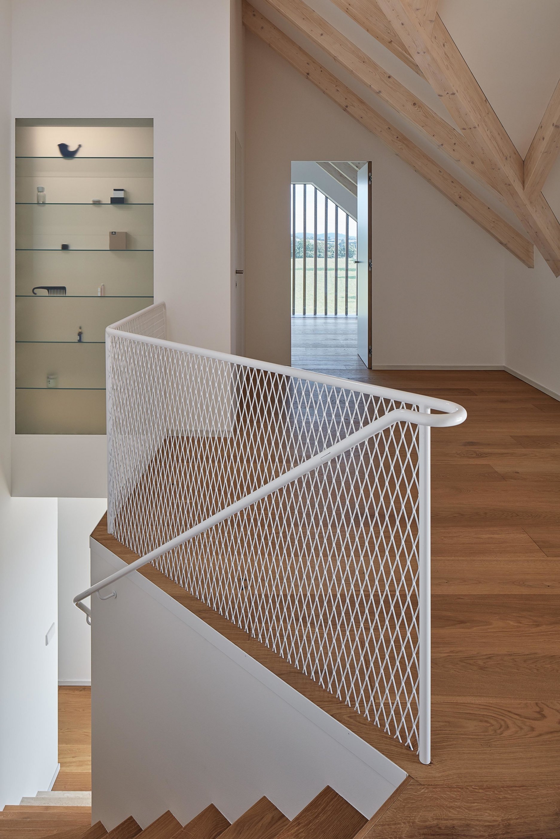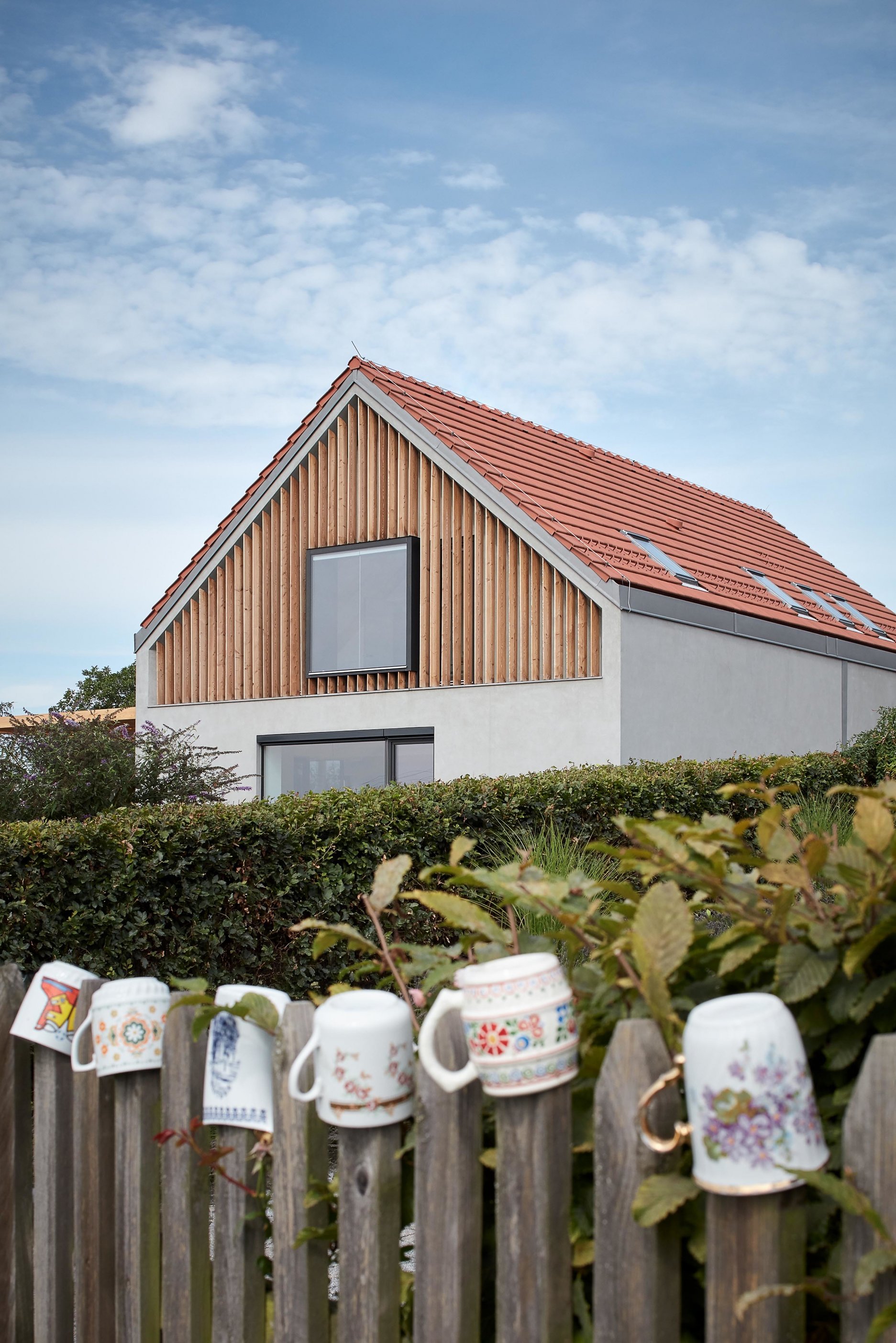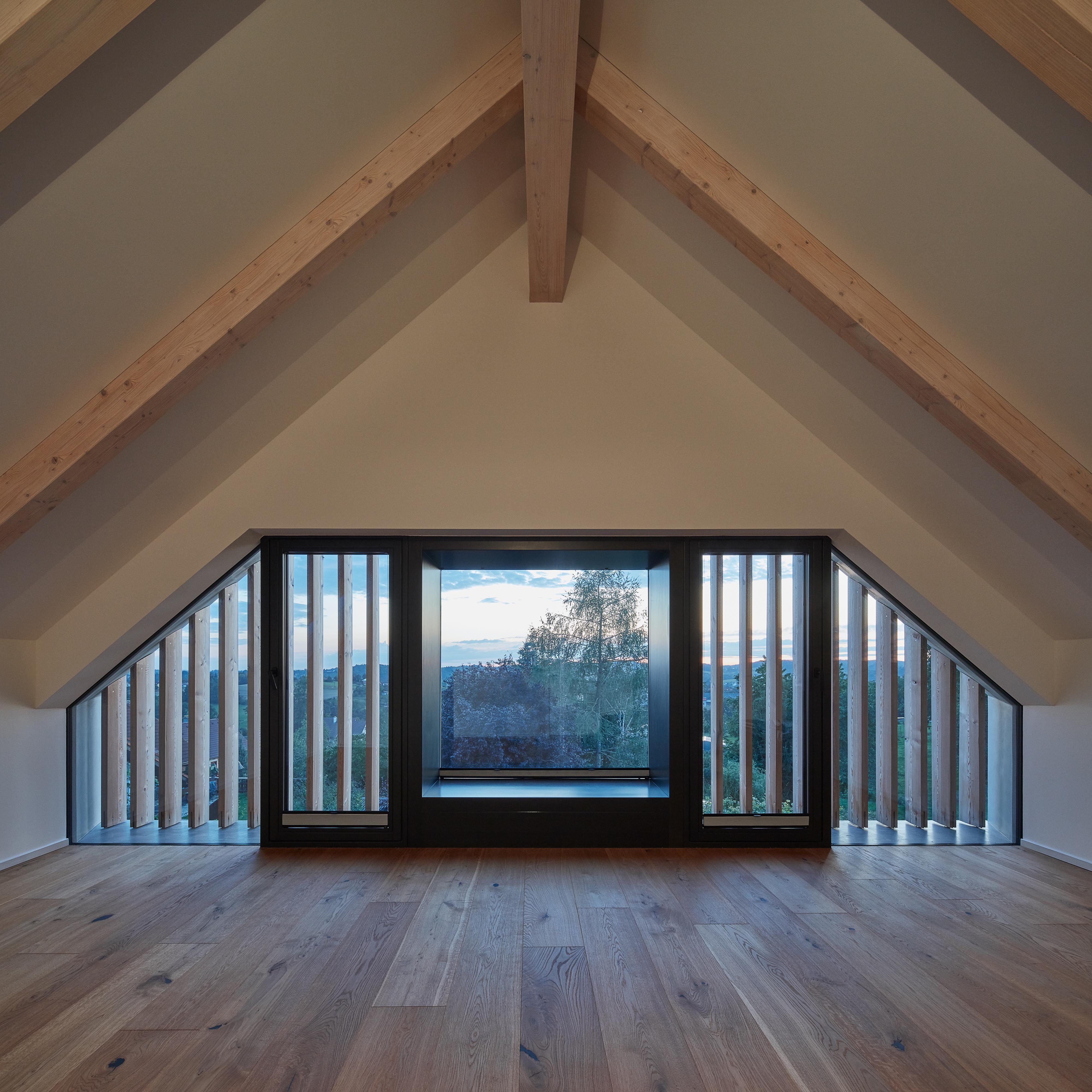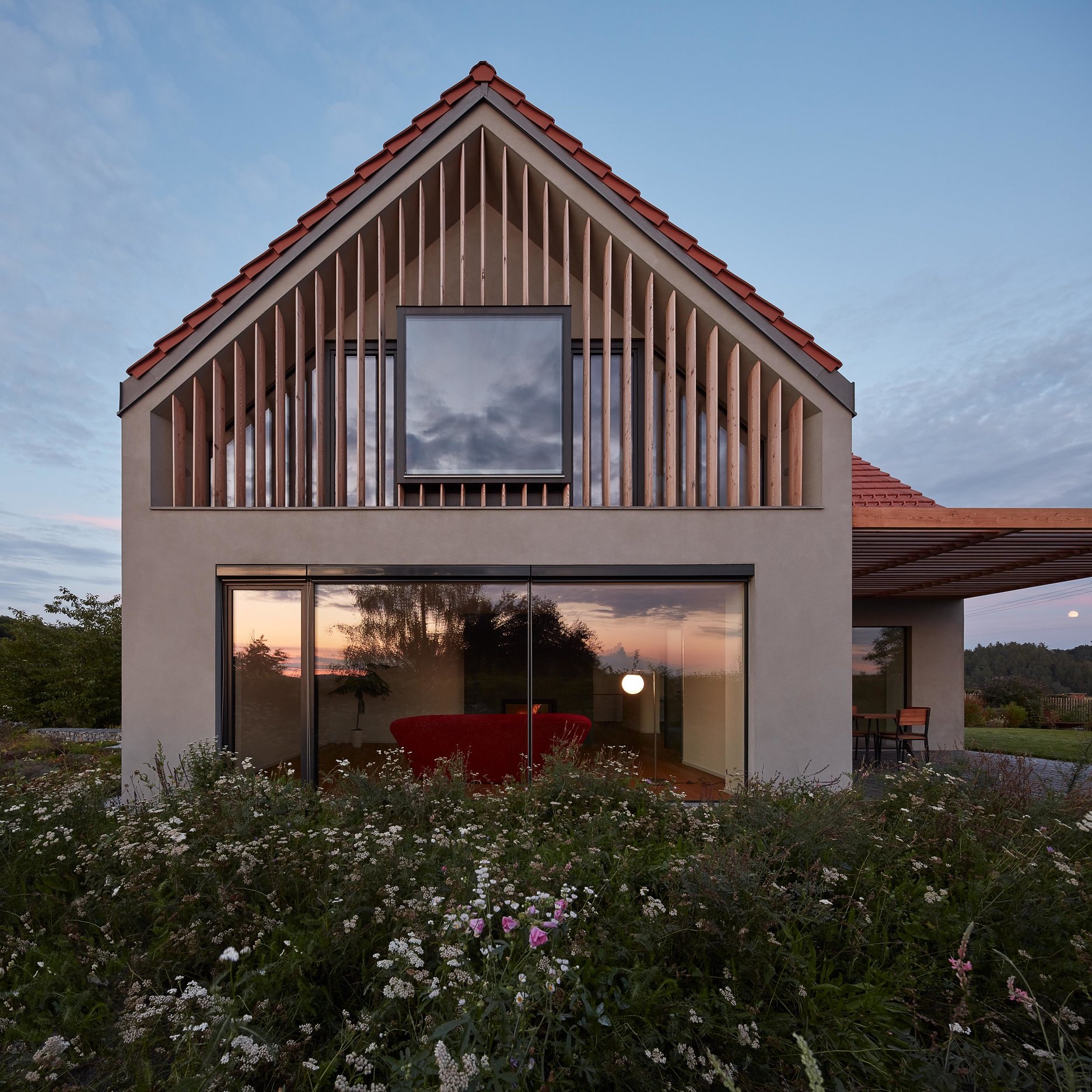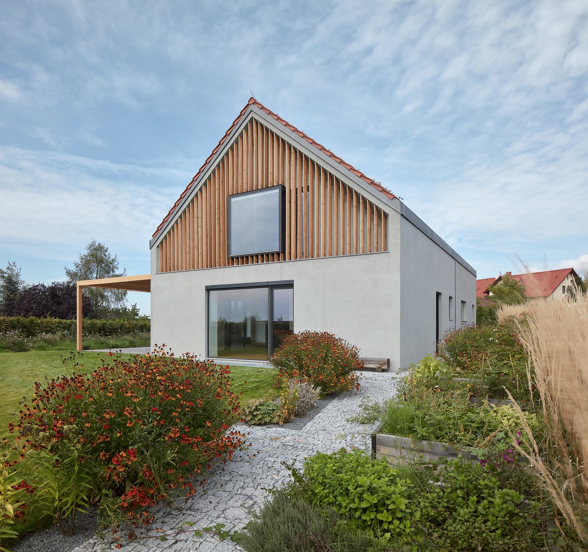 Na vrchnej časti fasády tak vznikol tradičný štít. Plocha za smrekovcovými lamelami je z veľkej časti presklená. Zvolené riešenie pri pohľade z boku evokuje drevený obklad štítu, zároveň však nebráni výhľadu z podkrovnej miestnosti. Raster drevených lamiel sa objavuje aj na pergole a novom oplotení pozemku.