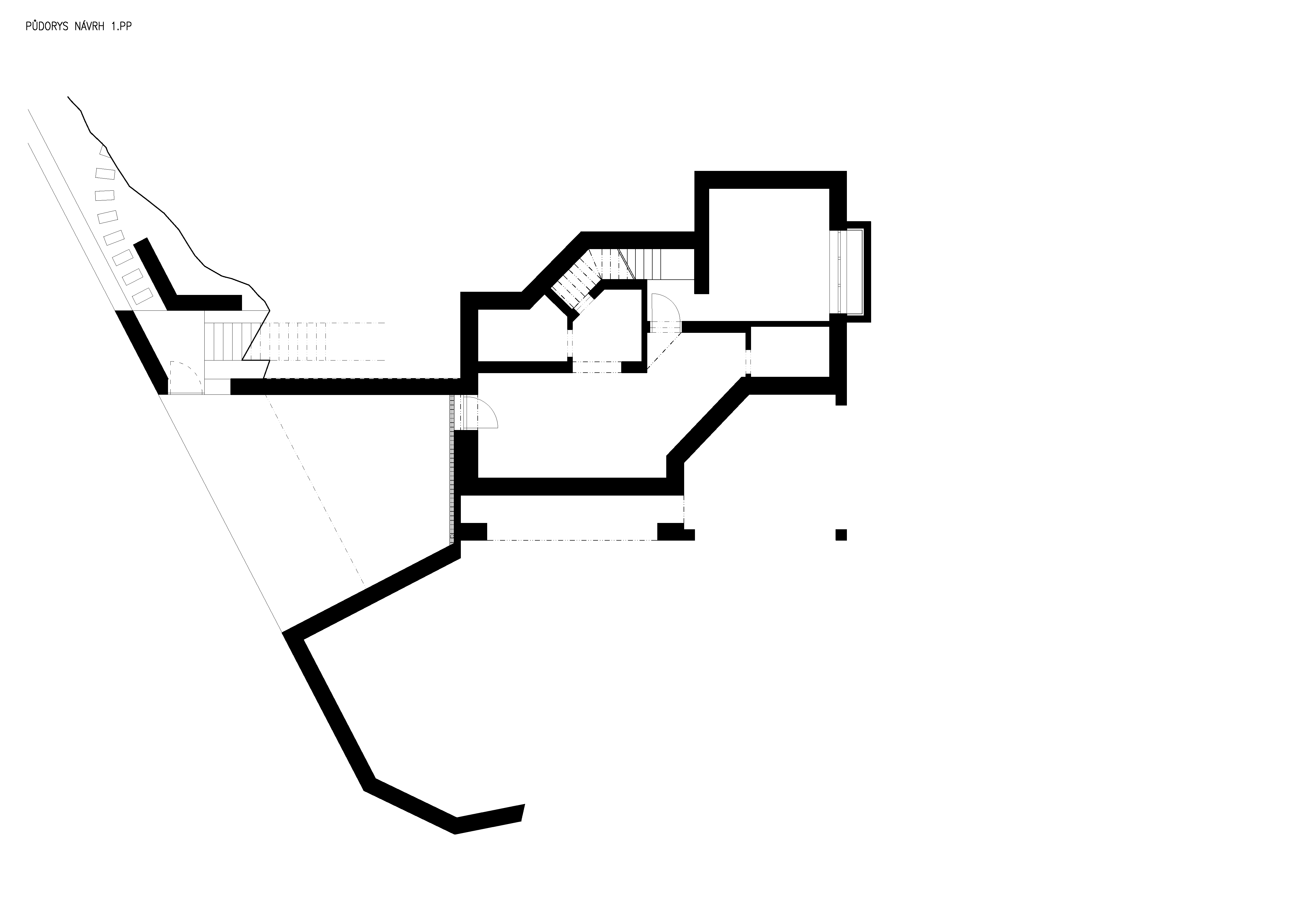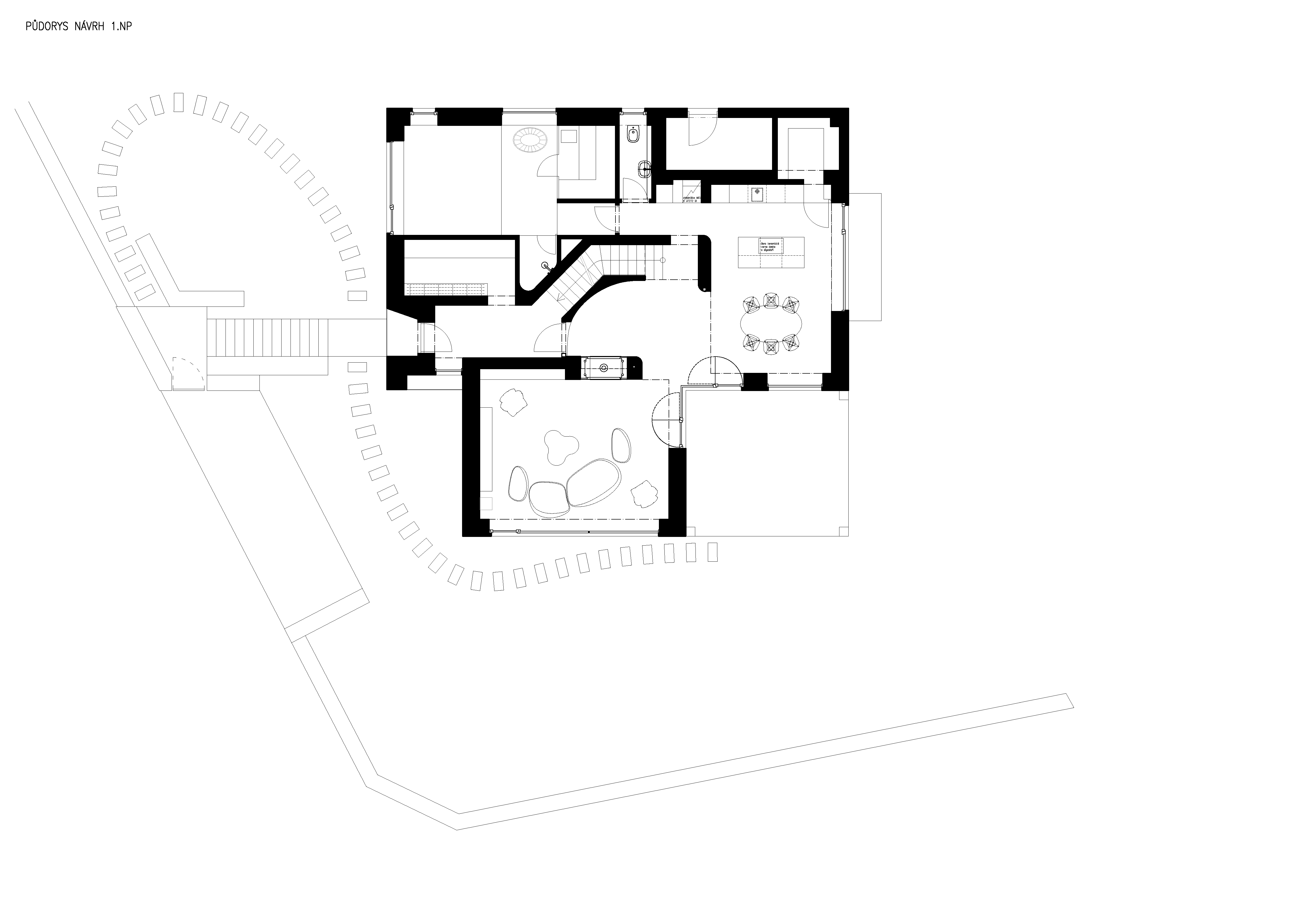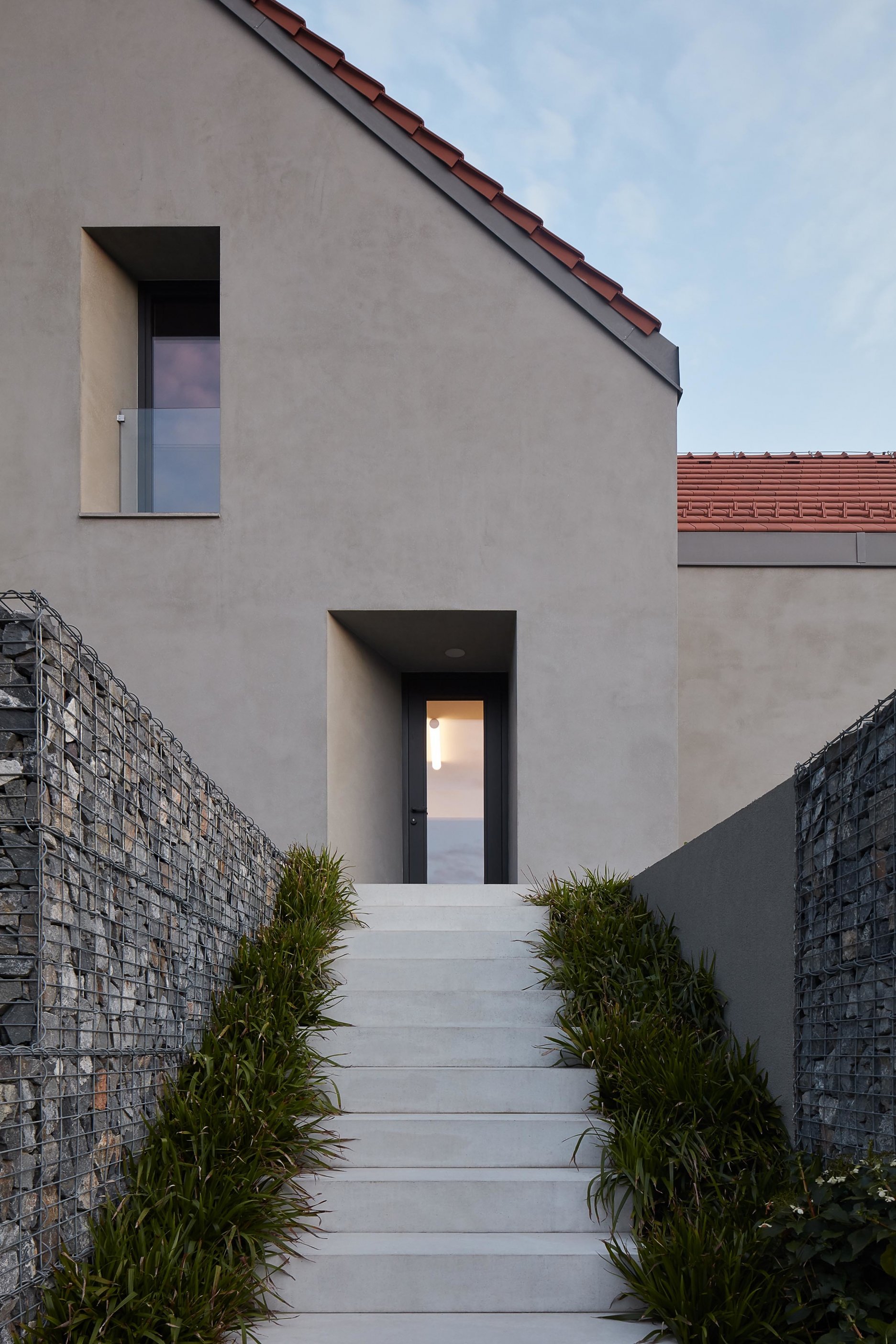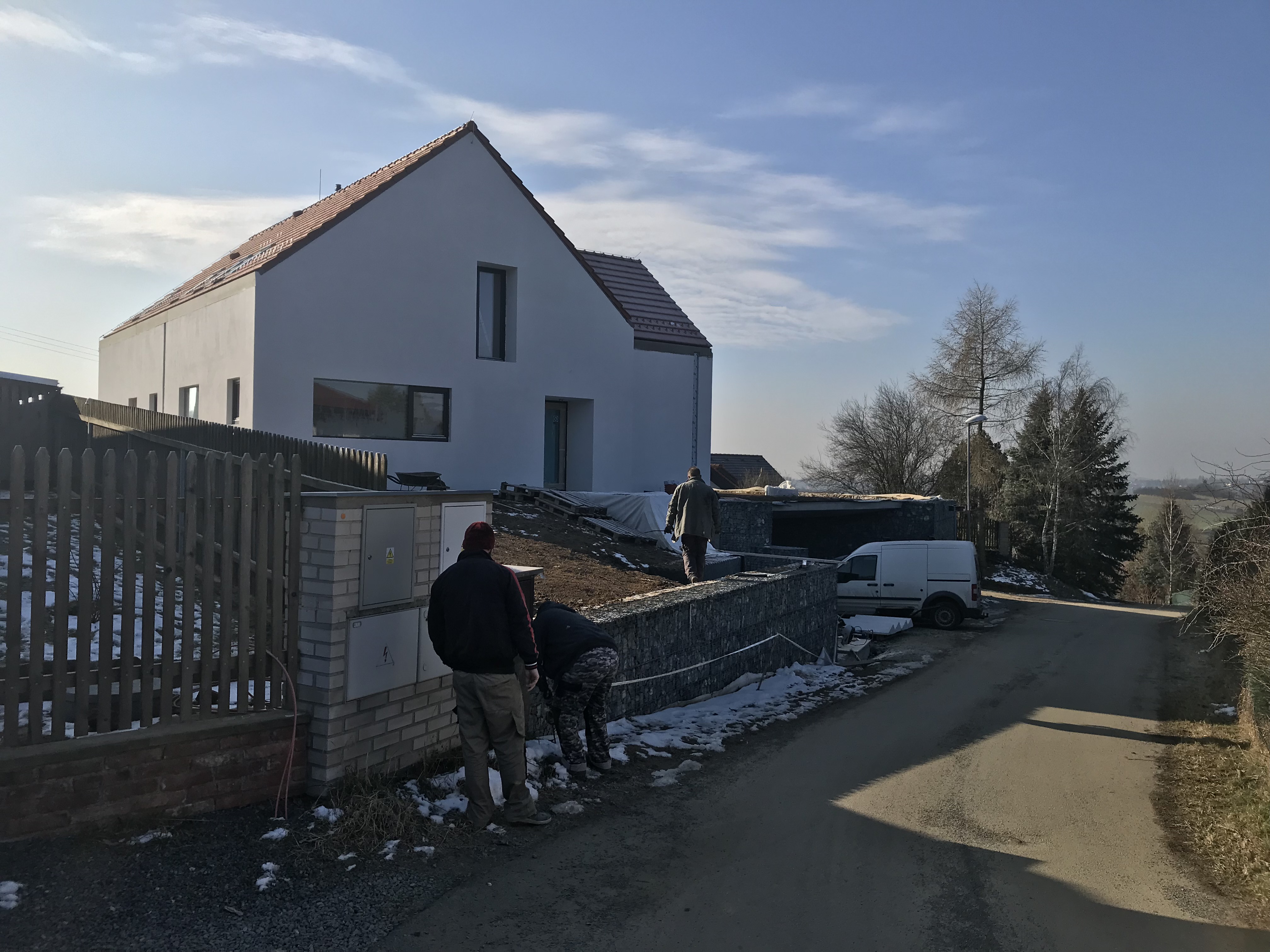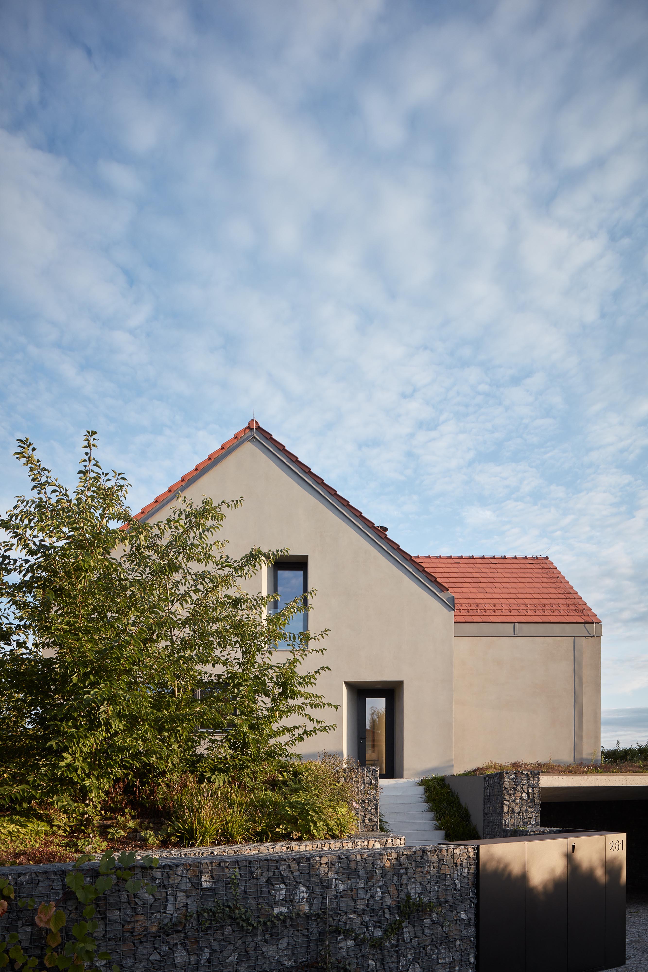 Pôvodný, tvarovo komplikovaný pôdorys, zjednodušili architekti do tvaru písmena T. Garáž zmenila funkciu na relaxačnú miestnosť so saunou. Autá teraz parkujú vedľa domu, na zastrešenom stojisku, ktoré je zapustené do terénu a prirodzene prepája dom (technické podlažie) s ulicou. Nárožia z gabionových košov, ktoré po obvode postupne klesajú, ohraničujú svahovitý pozemok. Rovnaký kameň z lokálneho zdroja bol použitý aj na dláždenie krytého stojiska a chodníkov okolo domu.