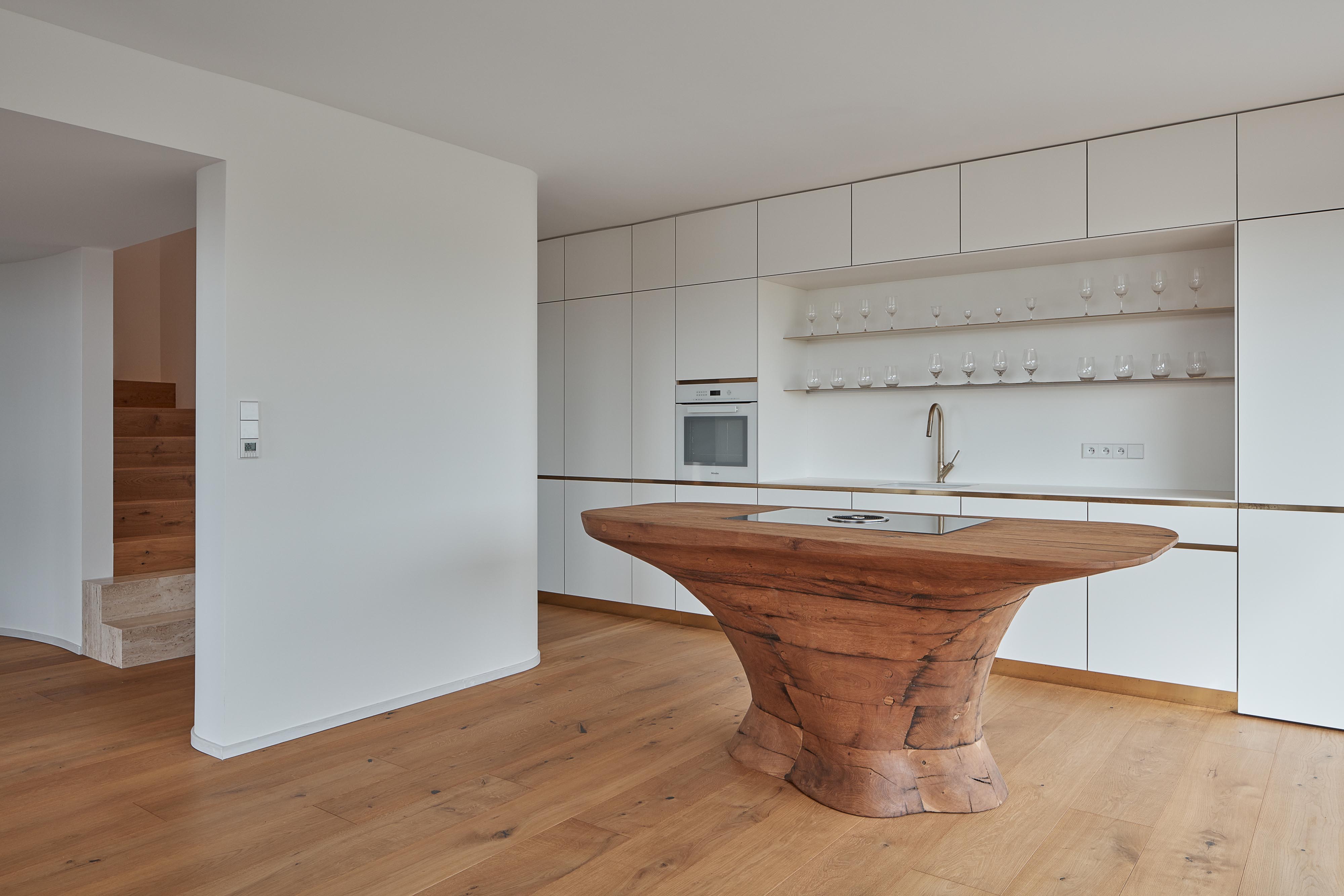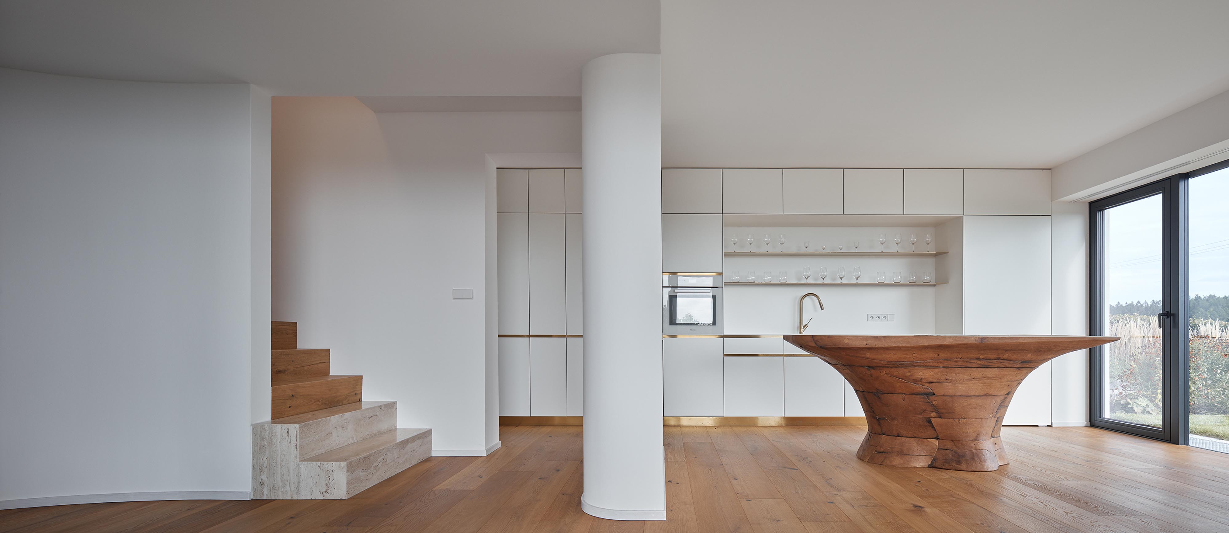 Dominantným prvkom na prízemí je kuchynský ostrov. Umelecký objekt vytvoril zo štyristo rokov starého dubového dreva Martin Papcún. Solitérny element integruje sklokeramickú varnú dosku so vstavaným digestorom. Sochársky prvok, vážiaci 800 kilogramov, vznikol vrstvením a brúsením objemných dubových trámov recyklovaných z demolácie.