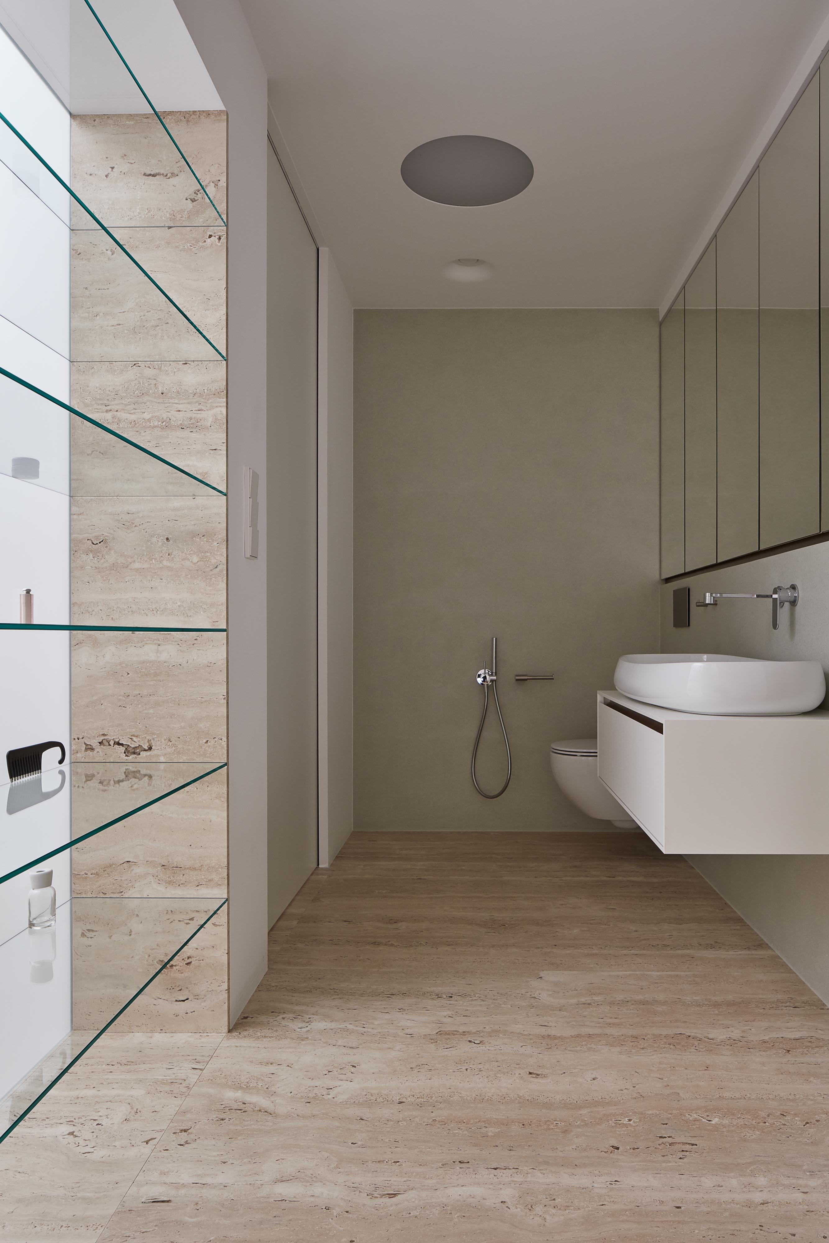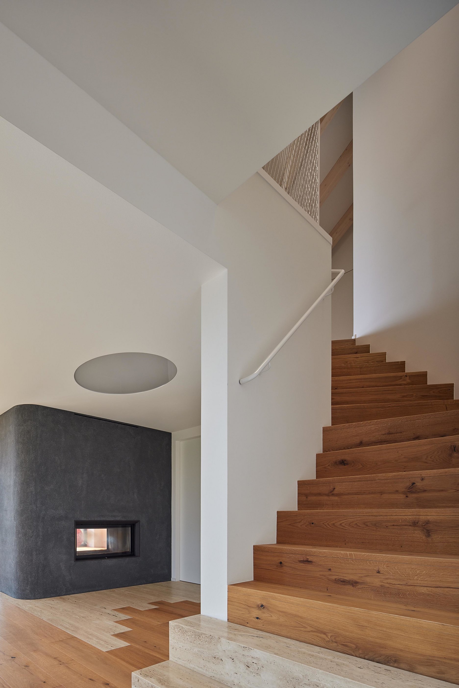 Veľká obývacia izba je od kuchyne a jedálne čiastočne priestorovo oddelená, aj vďaka zníženým podhľadom v miestach, kde sa bolo nutné vyrovnať s pôvodnou konštrukciou stropu. Na podlahách obytných miestností vyniká prírodná kresba dubových parkiet a travertínu, do technického podlažia architekti zvolili jednoduchý betónový poter. Pekným detailom je nadväzujúca textúra v mieste stretu dreva a kameňa. Travertín nájdeme aj v kúpeľni, kde plynule prechádza z podlahy do obkladu.