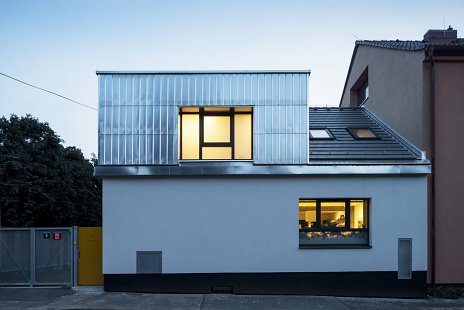 Problém s nedostatkom denného svetla v obytnom priestore vyriešili architekti malou prístavbou. Zo strany orientovanej k susedom stojí plná stena, všetky ostatné konštrukcie, vrátane strechy sú transparentné. Do interiéru sa tak dostalo aj južné a západné slnko.