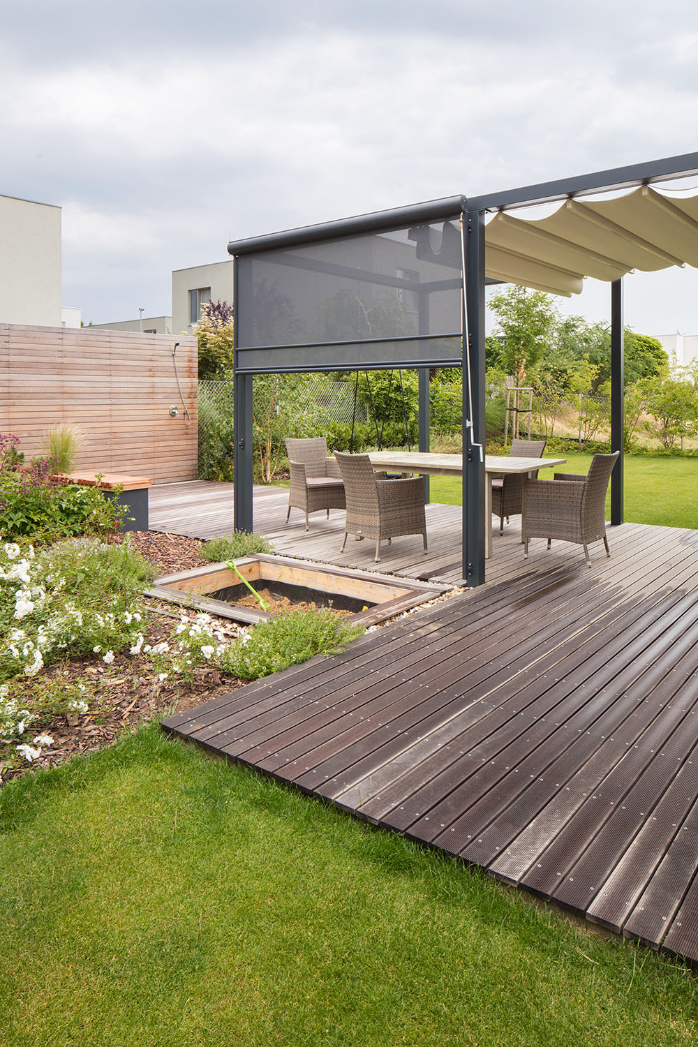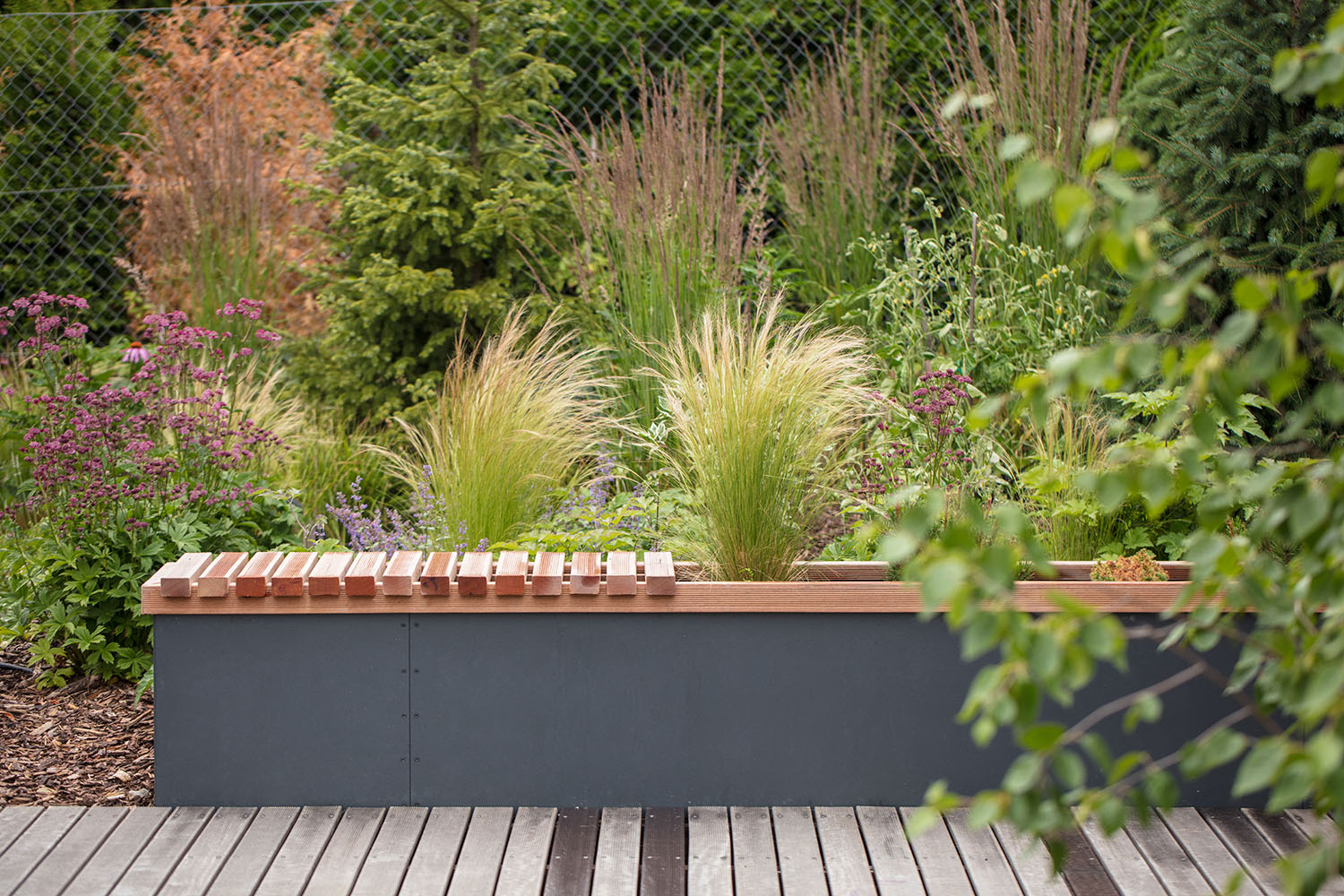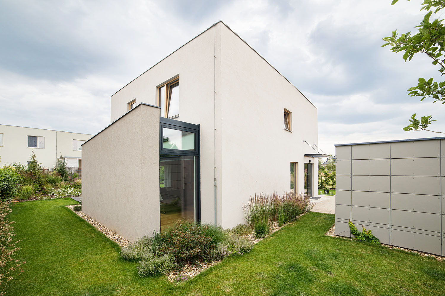 Záhradu autori riešili spoločne so záhradnou architektkou Petrou Novotnou. “Od nás vzešel koncept - úzká dlouhá pobytová terasa s ocelovou konstrukcí pro baldachýnové zastínění. Zahradní architektka vytvořila zahradu, plnou okrasných i jedlých rostlin, keřů a bylinek,” upresňujú architekti z ateliéru Boq. „K čistým tvarům moderního domu patří divočejší zahrada s jasně danými místy pro okrasné a jedlé rostliny," dopĺňa Petra Novotná.