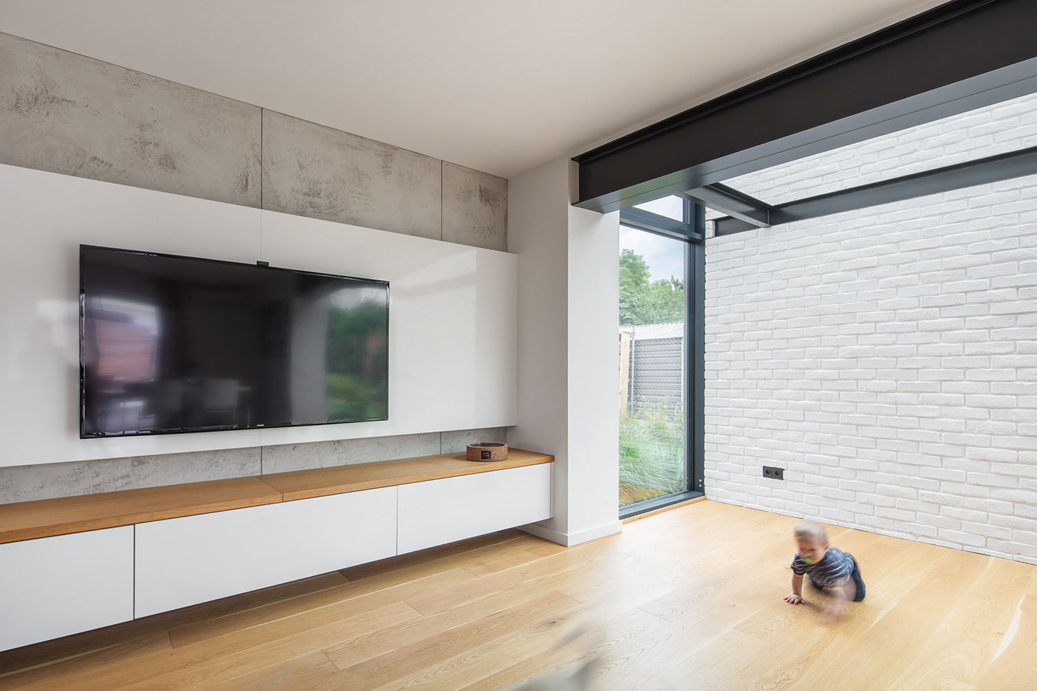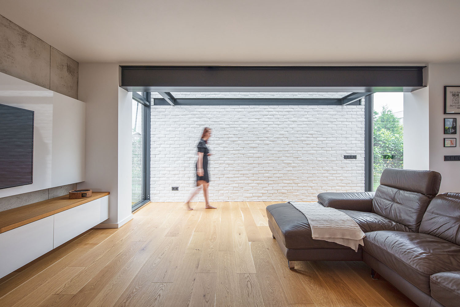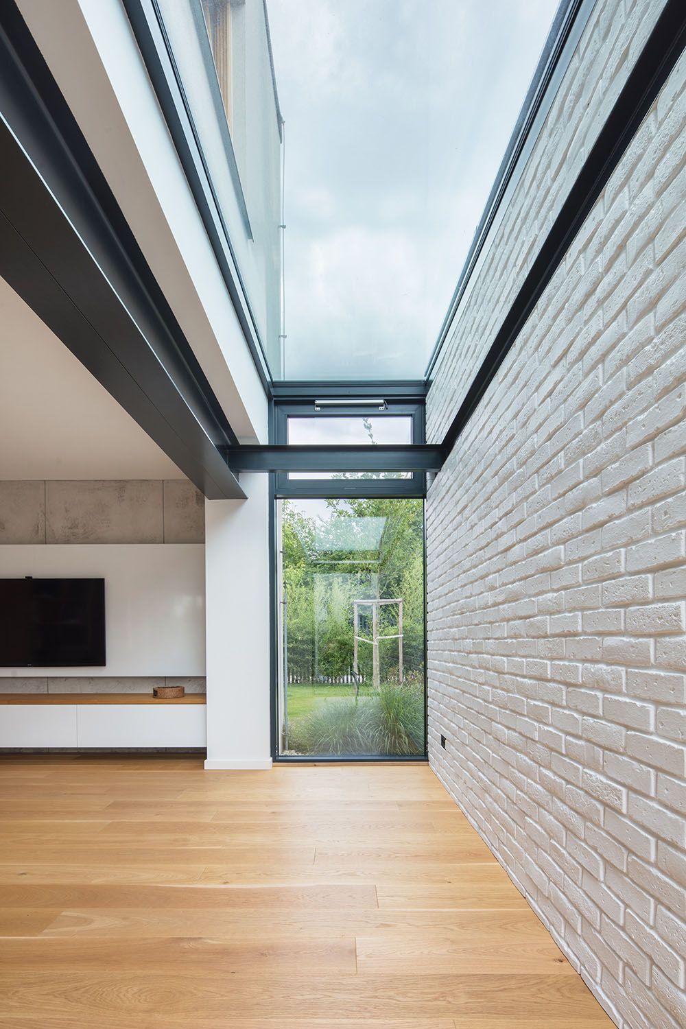 “Hlavní roli hrálo světlo, respektive jeho nedostatek,” hovorí o východiskách tvorivá dvojica. Vo výbere materiálov prevažujú prírodné svetlé a teplé odtiene. Drevená dubová podlaha, betónové stierky, na mieru vytvorené biele nábytkové kusy v kombinácii s drevom. To všetko je konfrontované s oceľovou konštrukciou novej prístavby. Masívny oceľový preklad, ktorý nesie horné podlažie je v interiéri priznaný.