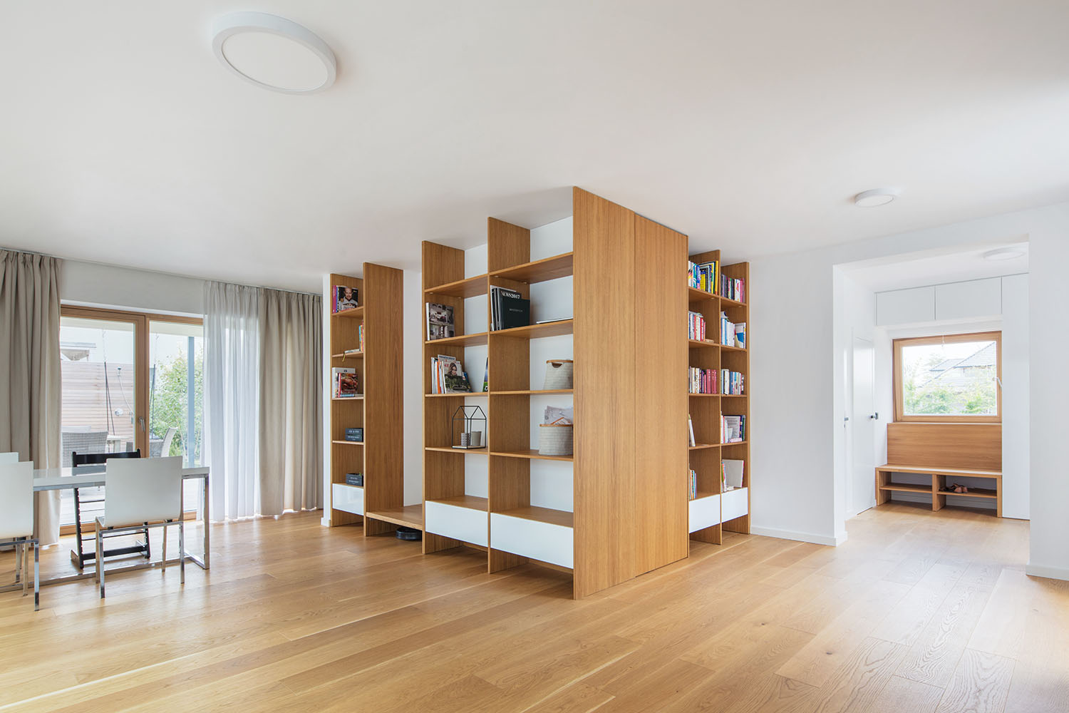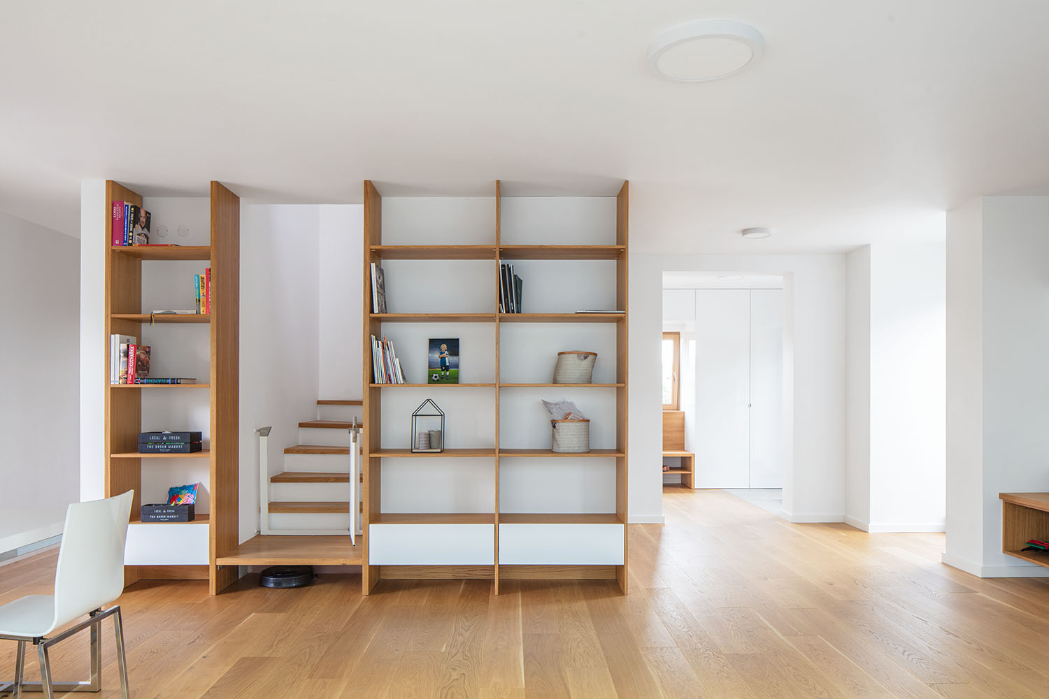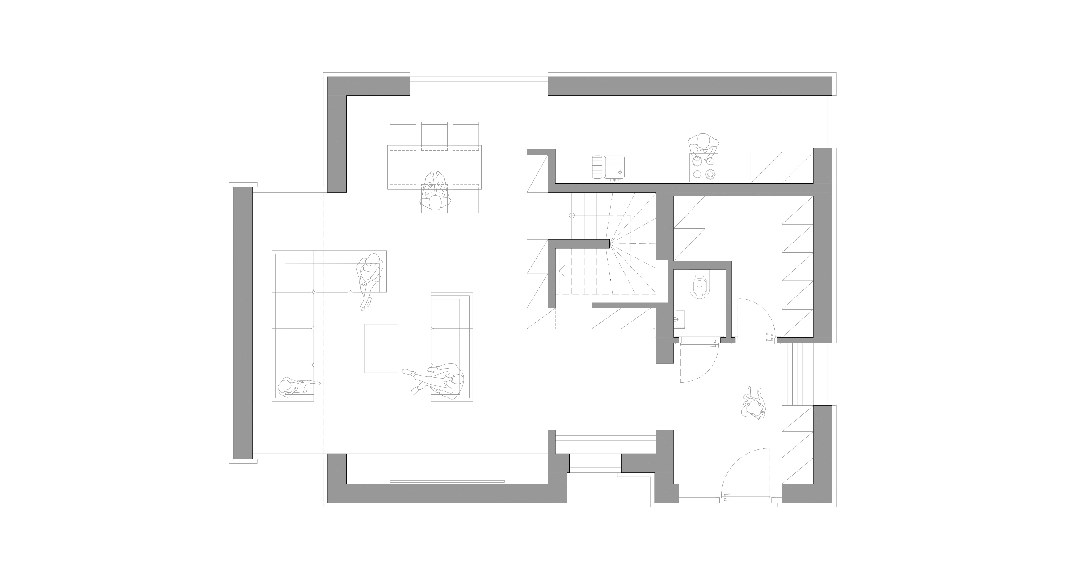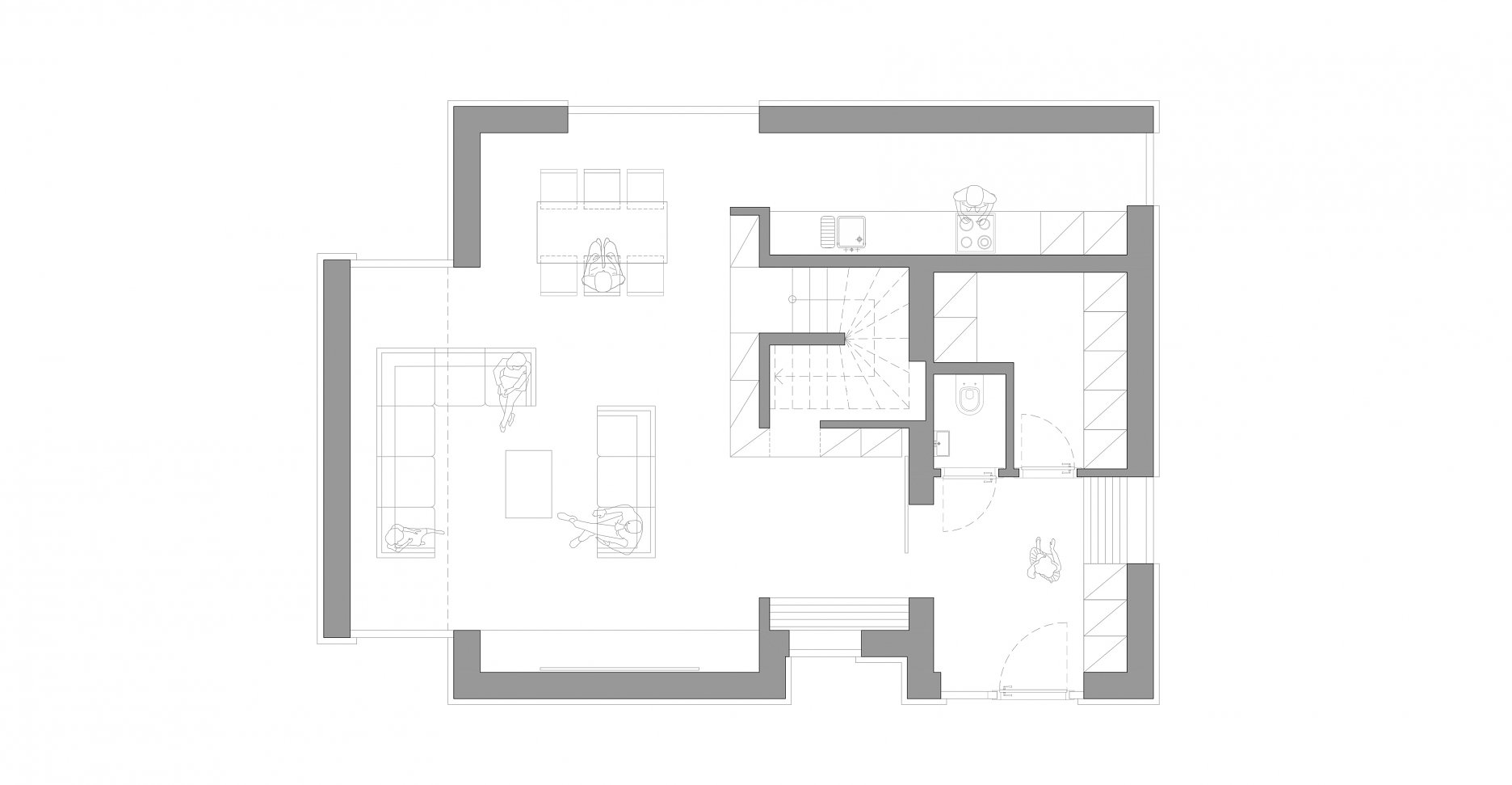 Celé prízemie je výrazne prebudované, podmienkou klienta bolo iba zachovanie pozície kuchynskej linky. Najväčším zásahom bolo presunutie vstupu na miesto garáže, čím vznikla veľkorysá predsieň s prepojením na technickú miestnosť a samostatné WC. Ústredným prvkom v zväčšenej obývačke je nábytková stena, ktorá sa vinie okolo schodiska. Slúži ako knižnica so skrytým vstupom do úložného priestoru pod schodami. V mieste pôvodného vstupu architekti navrhli fixné zasklenie s lavicou.