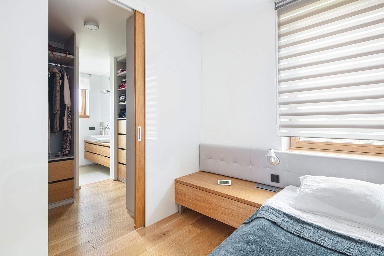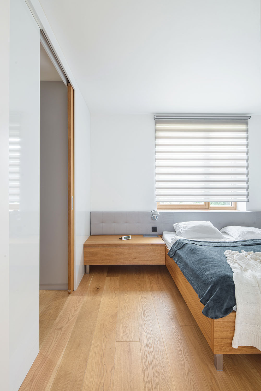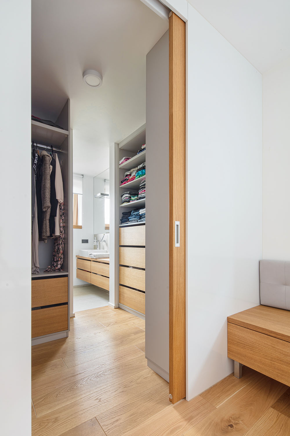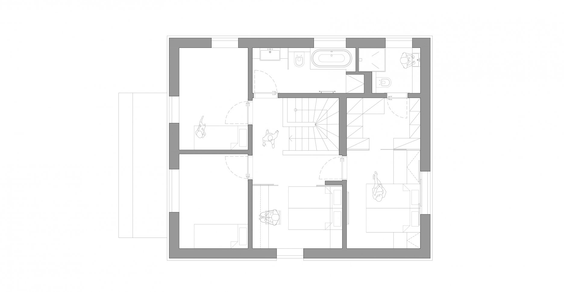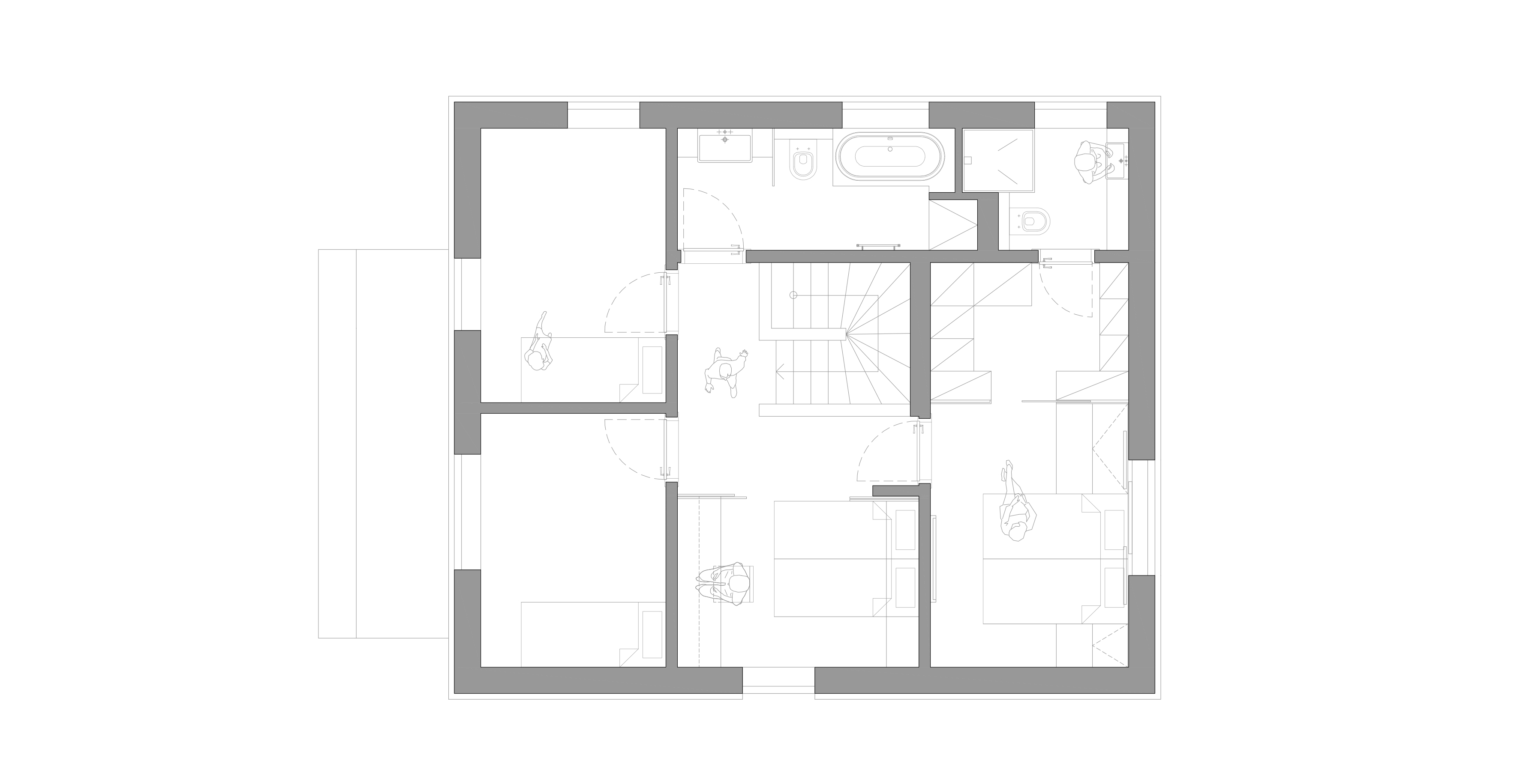 Na poschodí došlo tiež k výraznej zmene dispozície. Z veľkej časti sa búralo, vďaka čomu sa priestor otvoril a presvetlil. Majitelia tak majú k dispozícii pracovňu, ktorá je väčšinu času otvorená, ale možno ju oddeliť posuvnými panelmi. Ďalej vzniklo "krídlo rodičov", teda spálňa s priechodným šatníkom a vlastnou kúpeľňou.