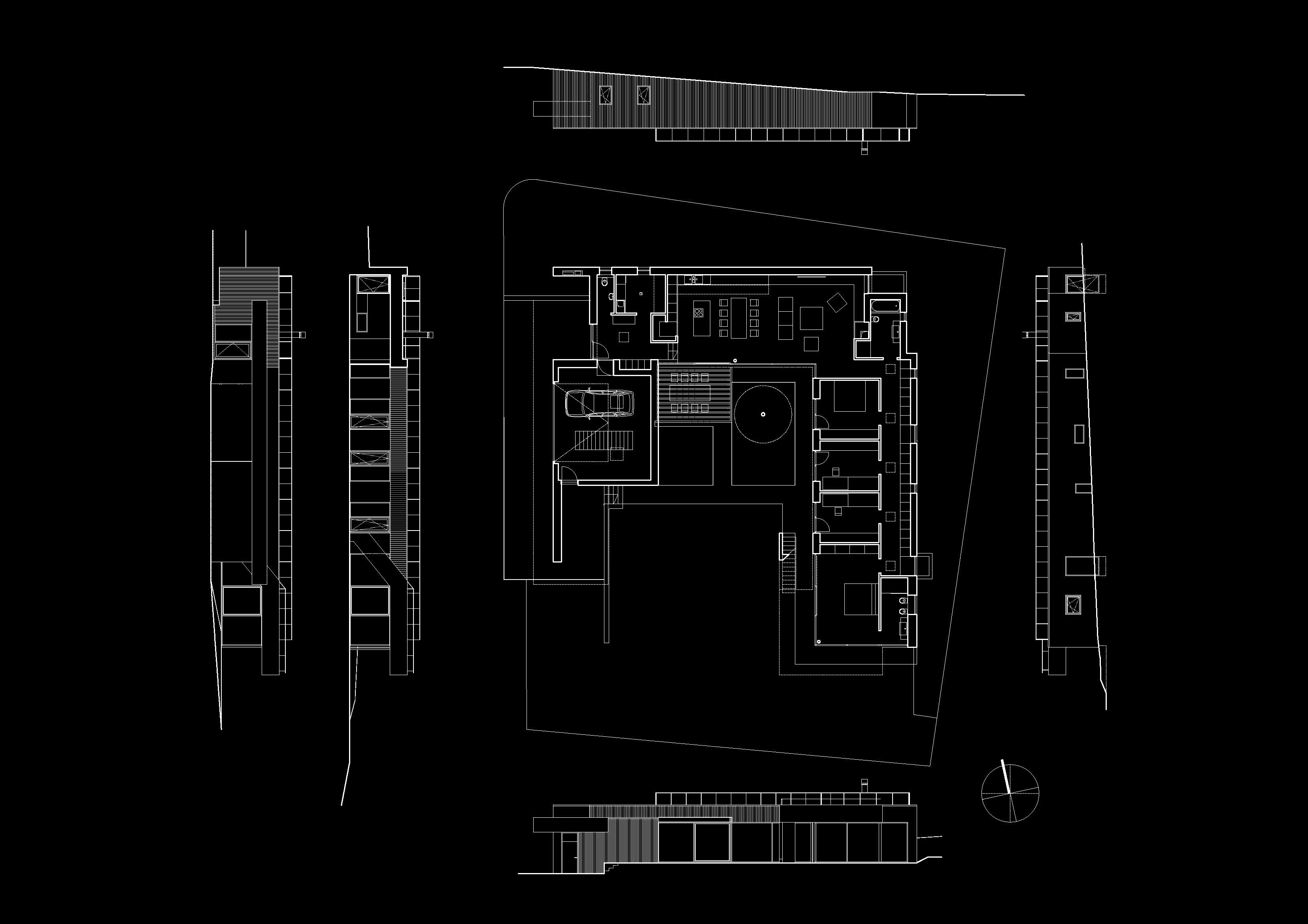 Jednopodlažný dom má možnosť rozvinúť program bývania do scénografickej zostavy zábavných vizuálnych vzťahov a priestorových súvislostí. V návrhu sú jednotlivé priestory aditívne radené do účka a vytvárajú interiérový obvod pre exteriérové vnútro átria. Z neho človek kol-dokola ponad obvodovú rímsu jedného podlažia nevníma okolitú výstavbu. Len panoramatický obraz vrcholkov masívu zelene, ktorý sa vo výstrihu južného otvorenia hmoty do záhrady zmení na úplný obraz zeleného pozadia.