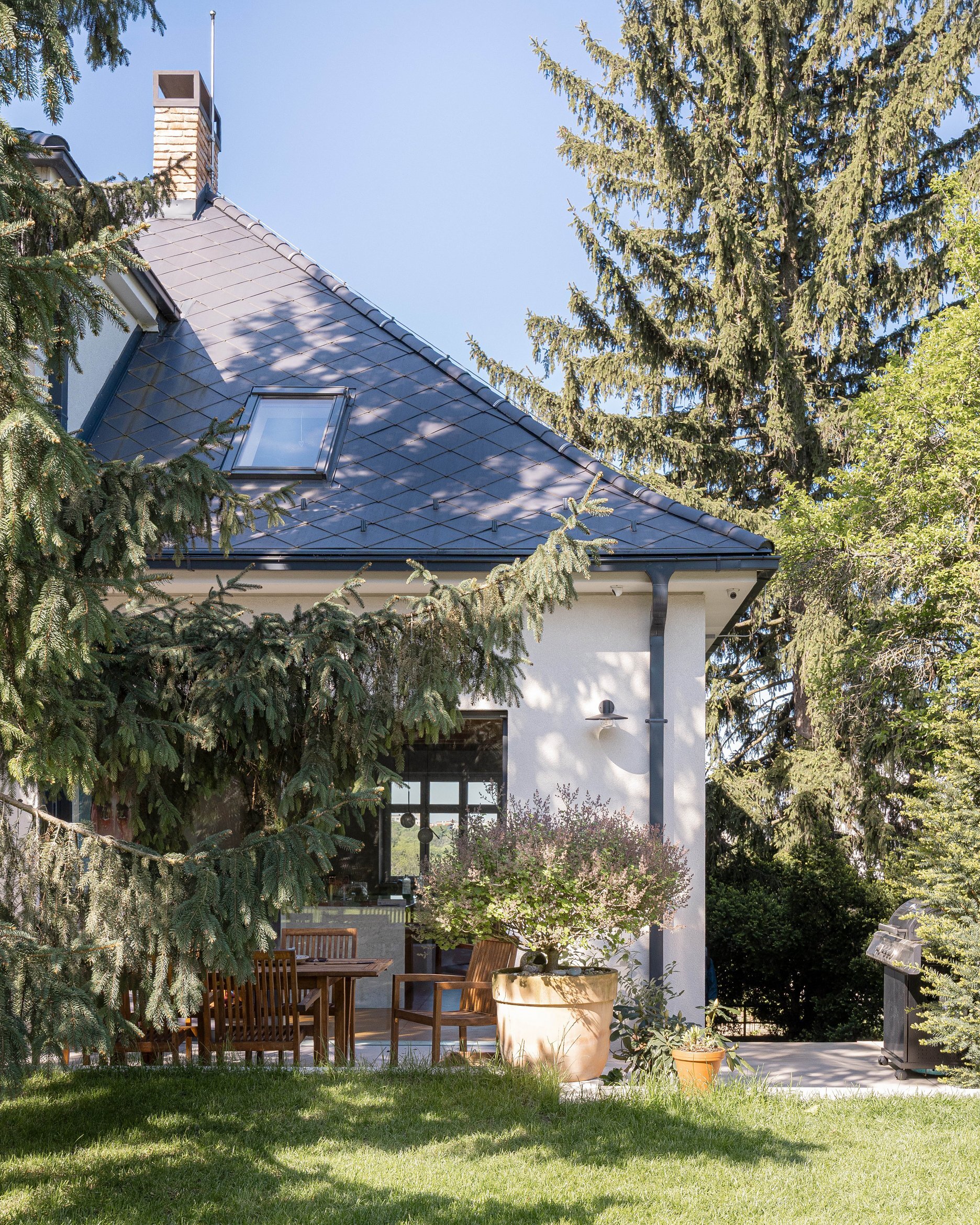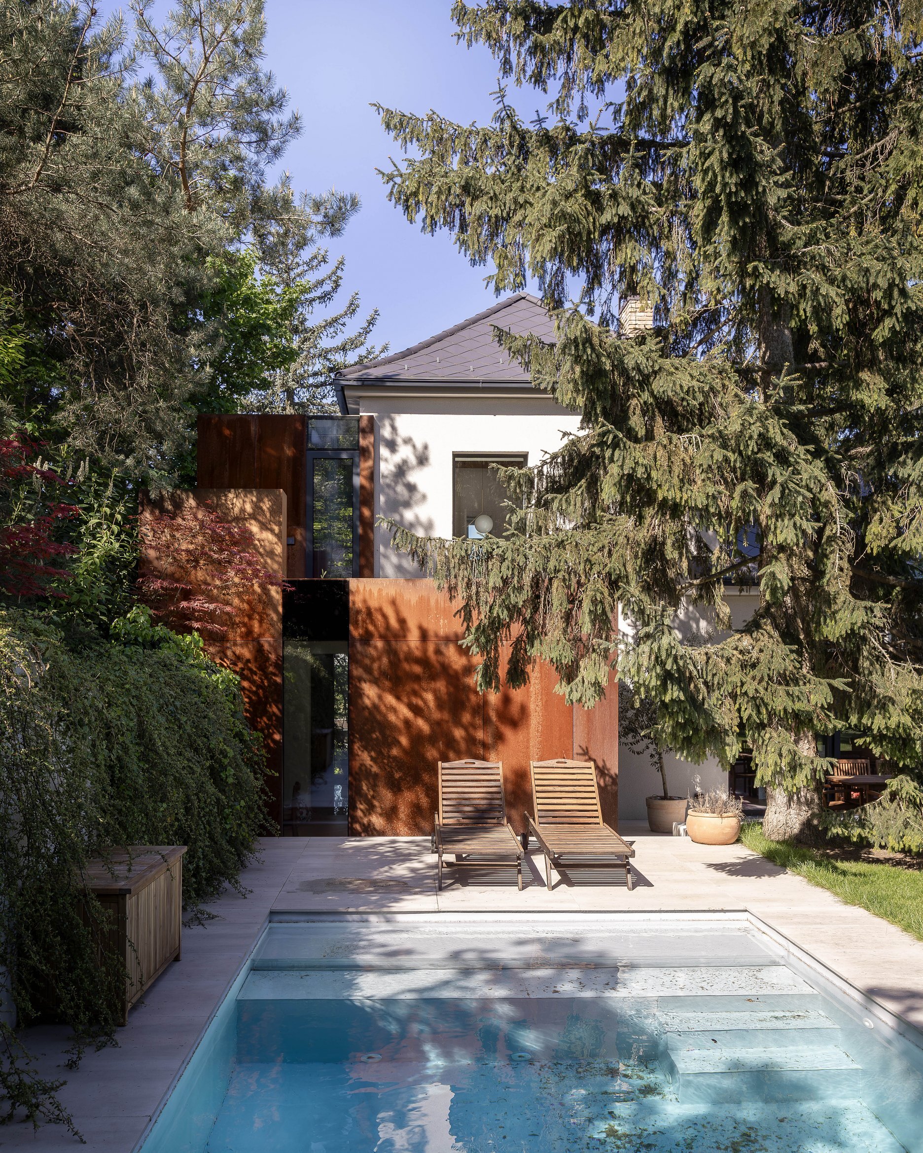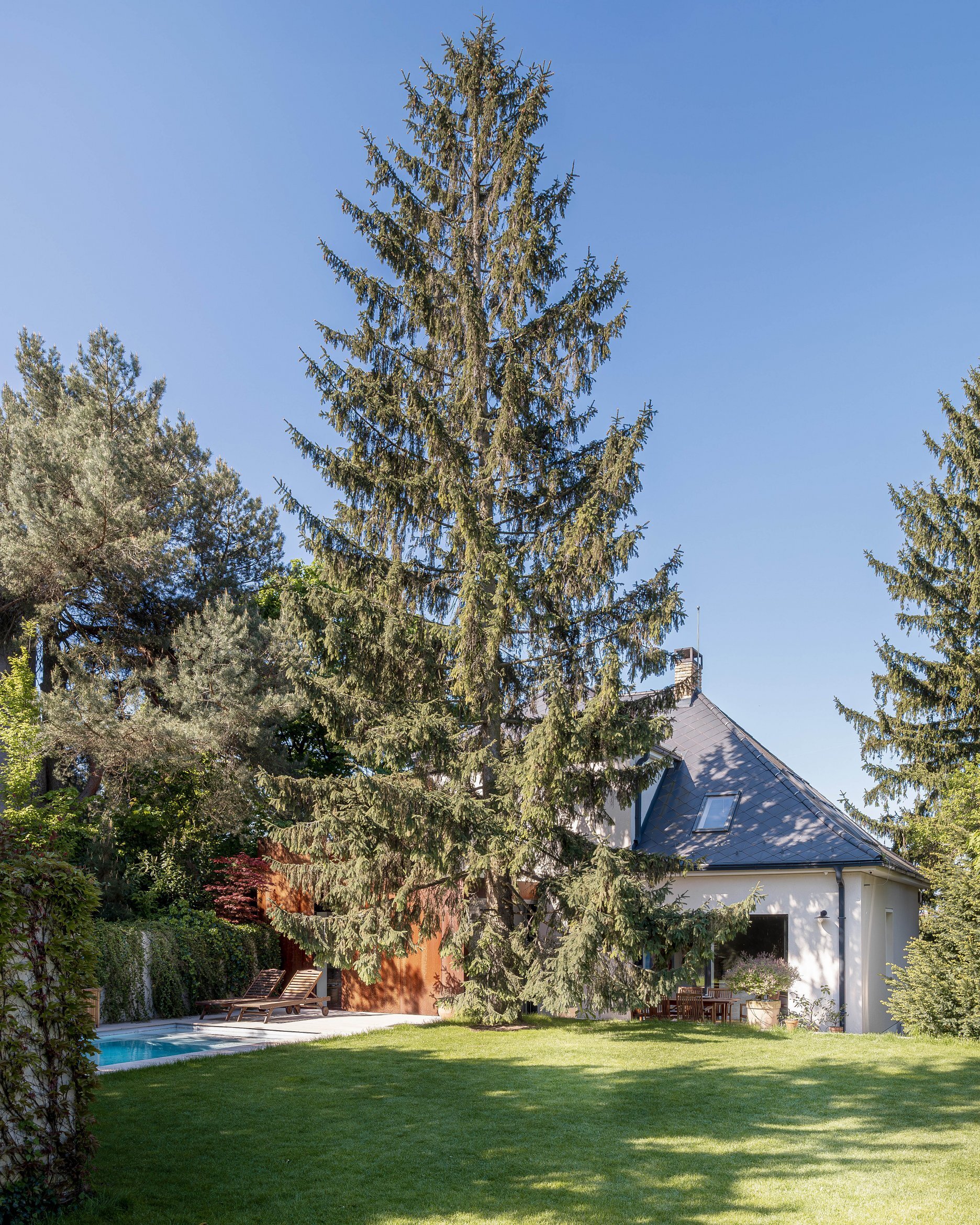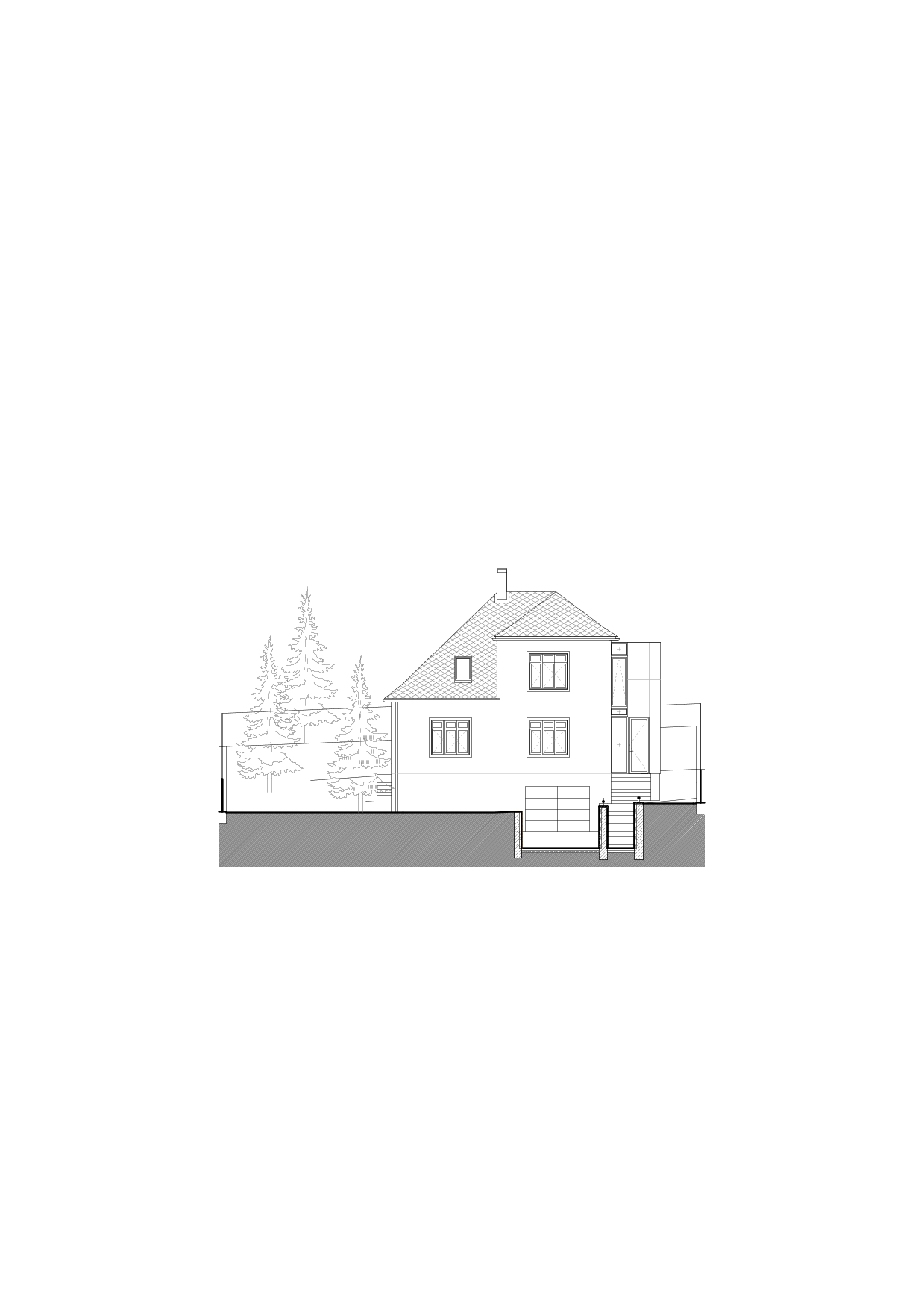 Architektonický koncept exteriéru stavia na dialógu medzi starým a novým. K pôvodnej povojnovej vile sme sa snažili citlivo pripojiť modernú prístavbu, ktorej hmota aj výraz rešpektujú existujúcu architektúru. Nový objem je zámerne odlíšiteľný – nevnucuje sa, nekonkuruje historickej stavbe, ale naopak doplňuje jej jednoduchosť. Pôvodná fasáda vily so svojou tradičnou omietkou a proporciami zostala zachovaná a vyniká v kontraste s prístavbou navrhnutou v súčasnom duchu. Nová prístavba je koncipovaná tak, aby neprekrývala ani nepotláčala pôvodnú hmotu domu, ale prirodzene sa začlenila do celku. Materiálové riešenie exteriéru zvýrazňuje rozdiel medzi starým a novým. Prístavba je obložená prevetrávanou fasádou z Cortenu s presadenými bezrámovými zaskleniami, v kontraste s tradičnou omietkou a replikami pôvodných okien objektu.