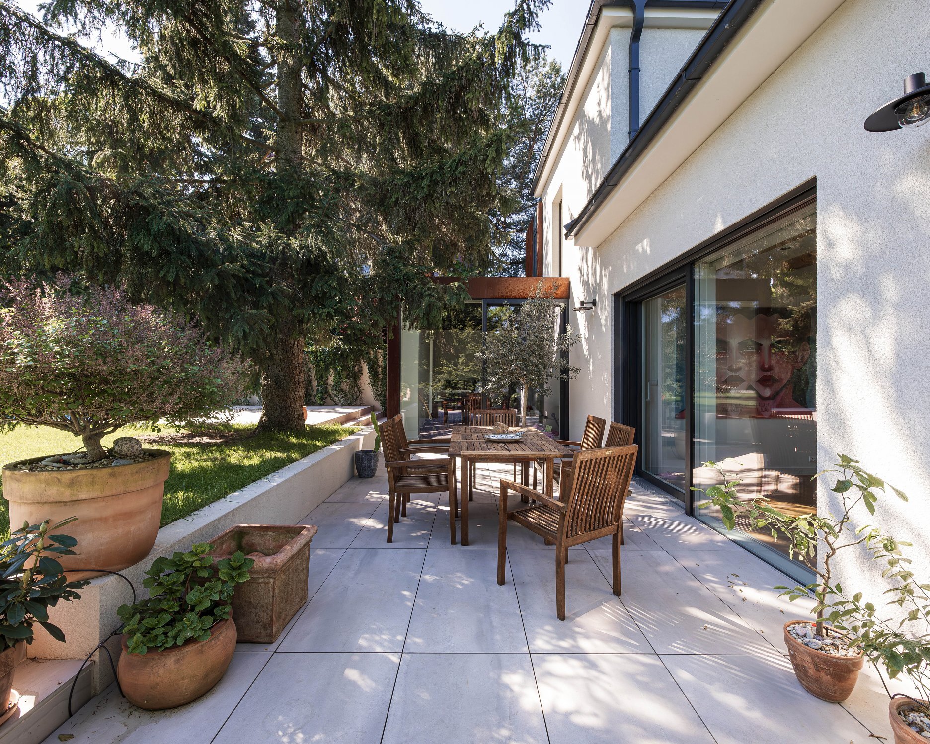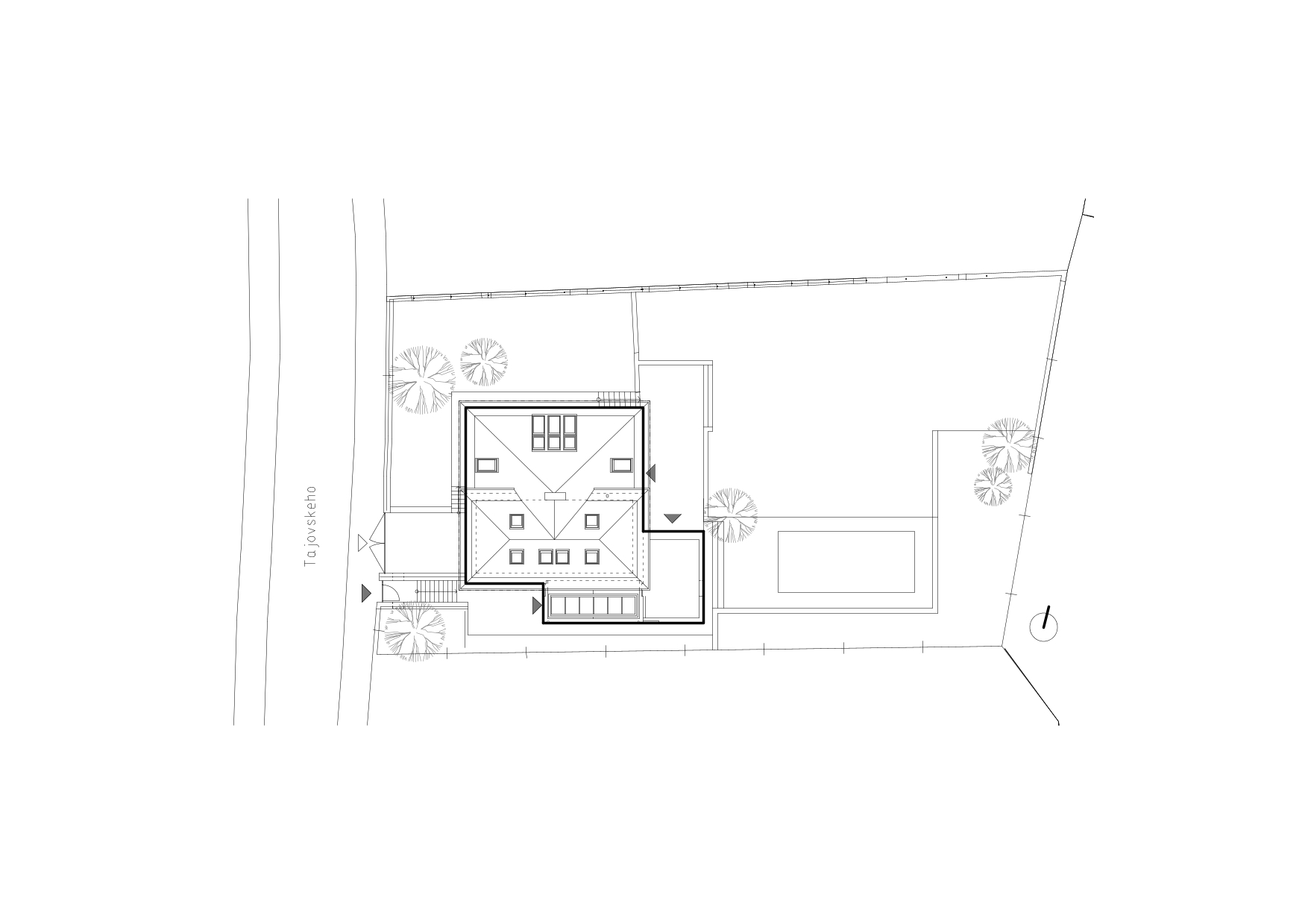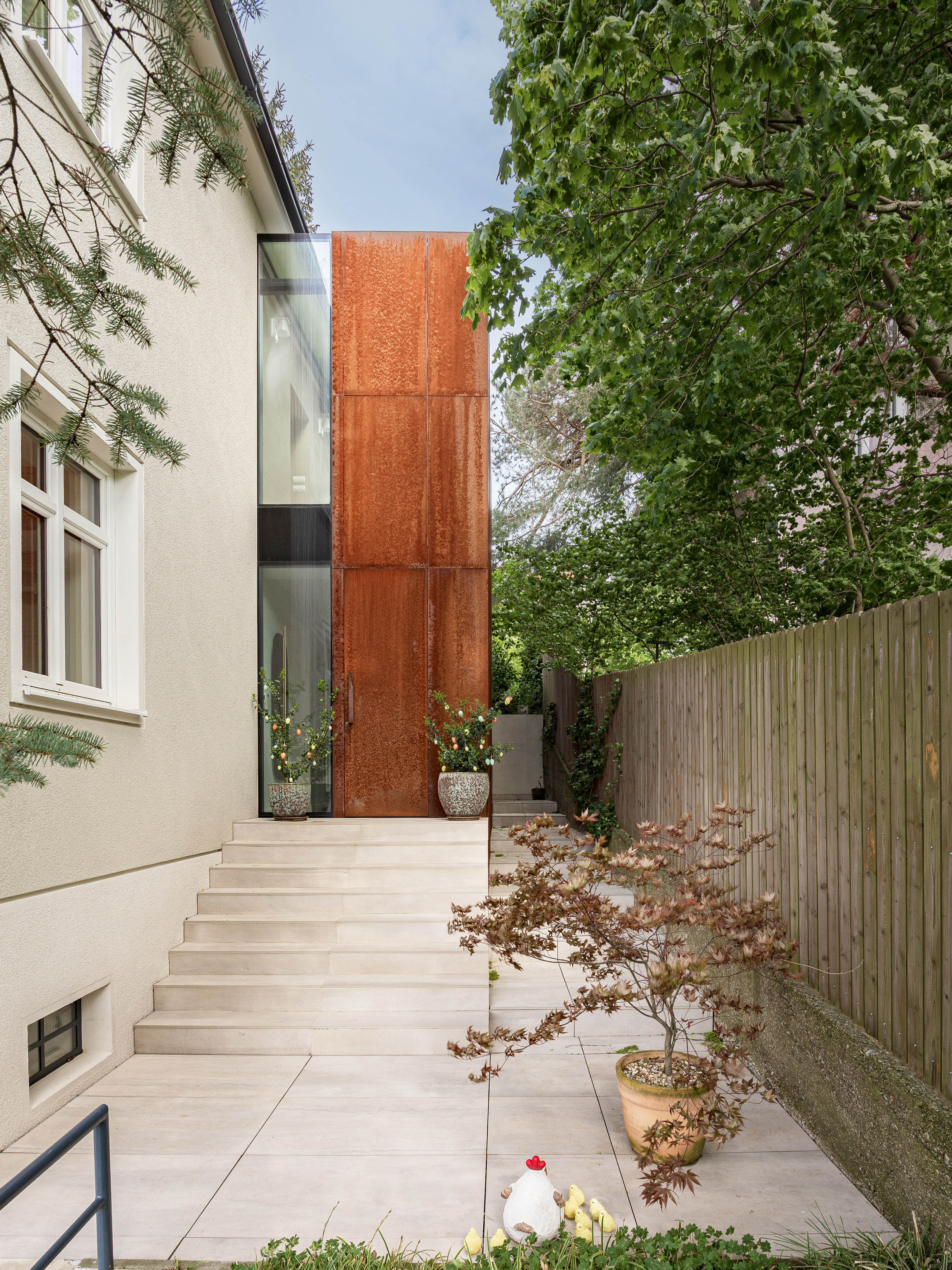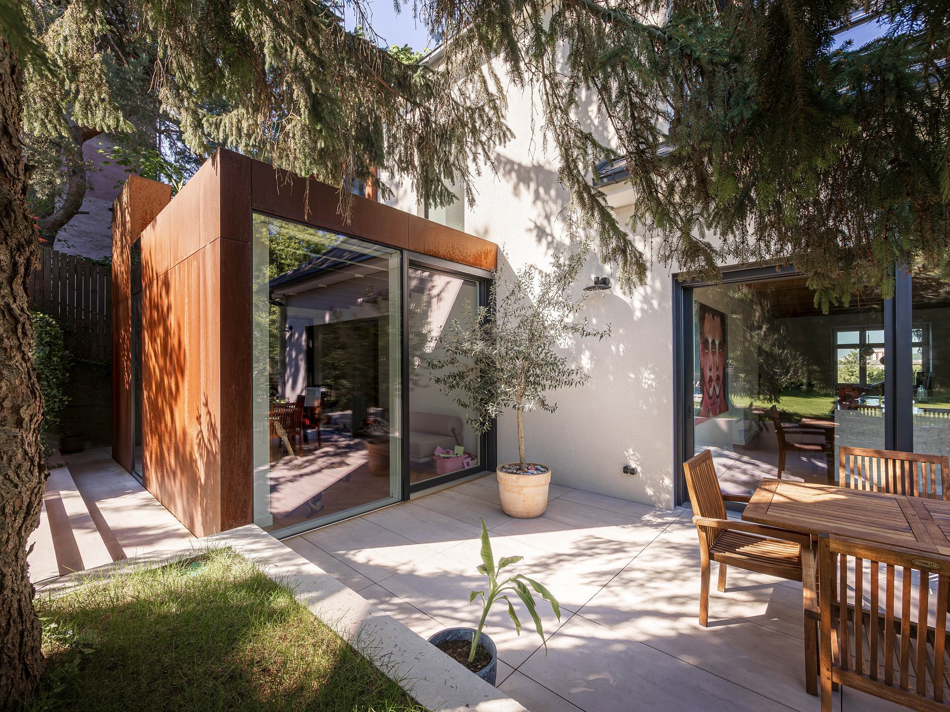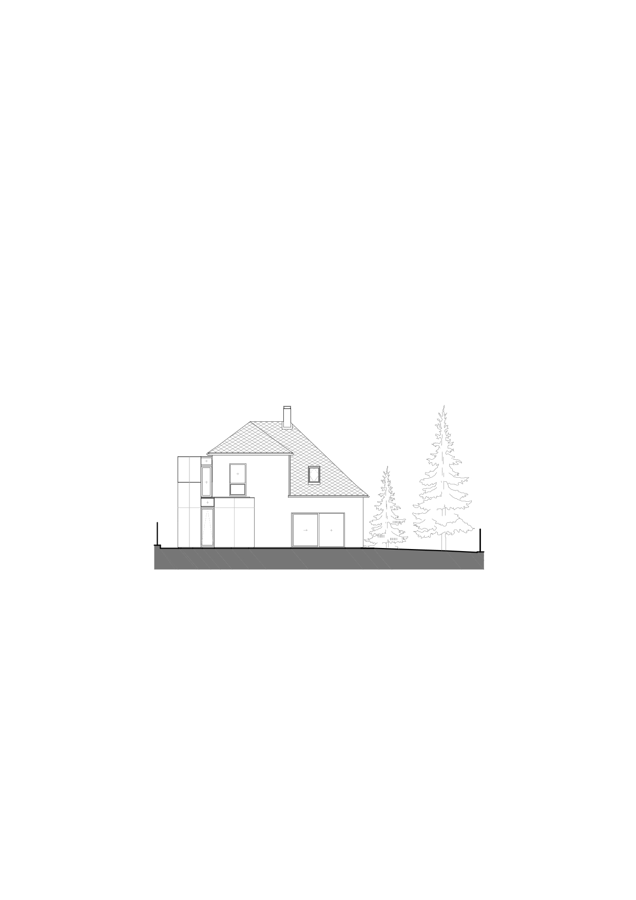 Architektonický koncept exteriéru stavia na dialógu medzi starým a novým. K pôvodnej povojnovej vile sme sa snažili citlivo pripojiť modernú prístavbu, ktorej hmota aj výraz rešpektujú existujúcu architektúru. Nový objem je zámerne odlíšiteľný – nevnucuje sa, nekonkuruje historickej stavbe, ale naopak doplňuje jej jednoduchosť. Pôvodná fasáda vily so svojou tradičnou omietkou a proporciami zostala zachovaná a vyniká v kontraste s prístavbou navrhnutou v súčasnom duchu. Nová prístavba je koncipovaná tak, aby neprekrývala ani nepotláčala pôvodnú hmotu domu, ale prirodzene sa začlenila do celku. Materiálové riešenie exteriéru zvýrazňuje rozdiel medzi starým a novým. Prístavba je obložená prevetrávanou fasádou z Cortenu s presadenými bezrámovými zaskleniami, v kontraste s tradičnou omietkou a replikami pôvodných okien objektu.
