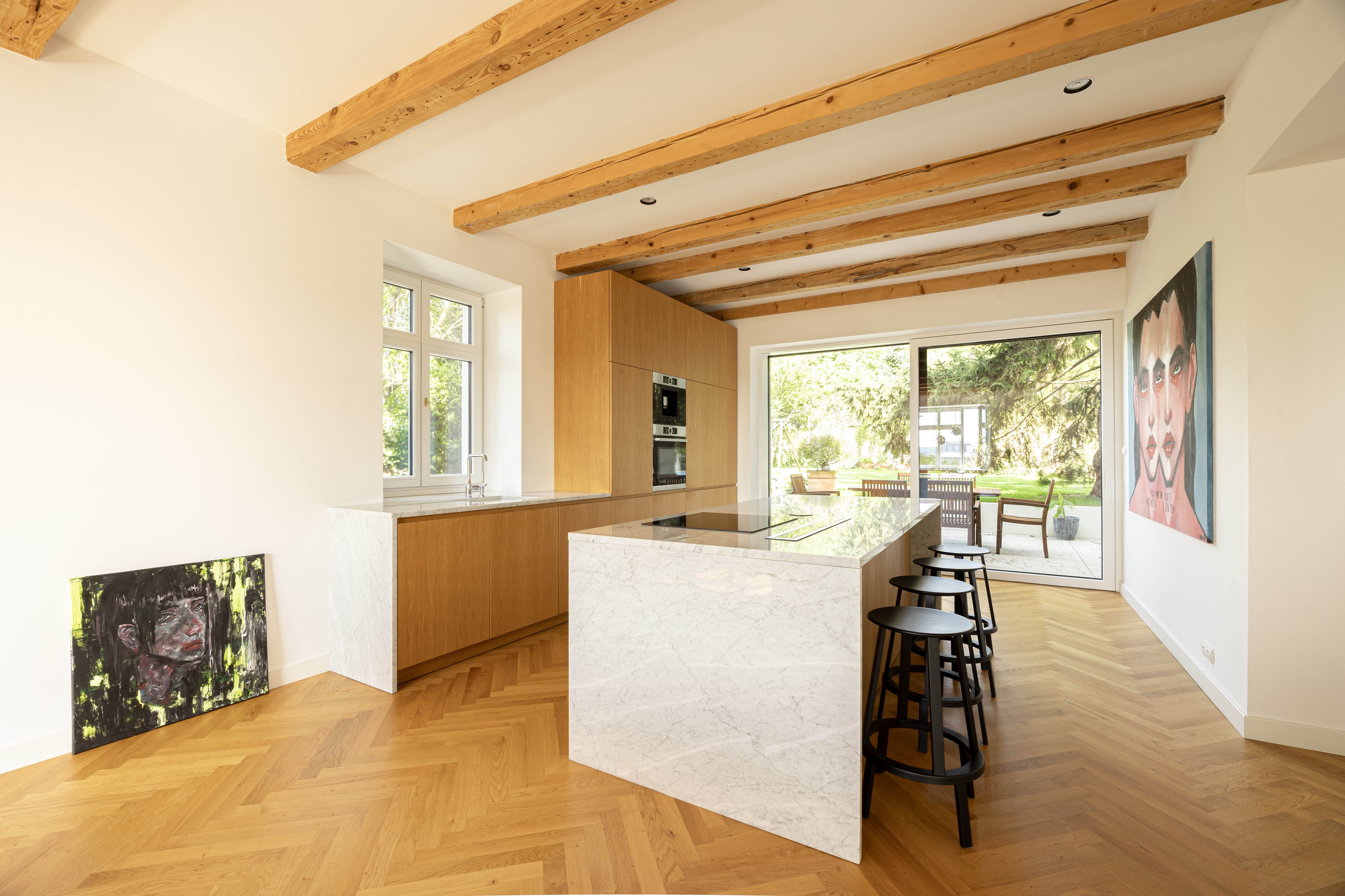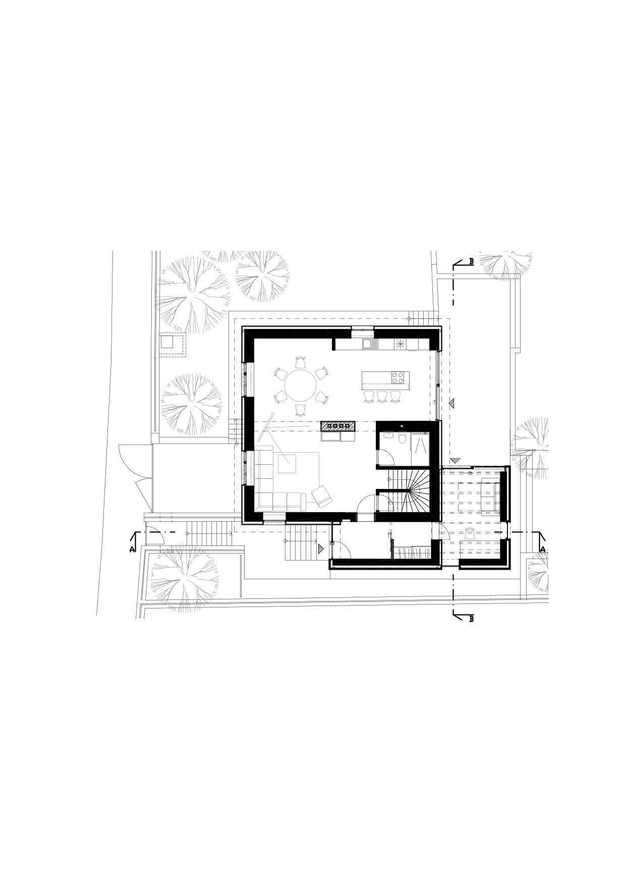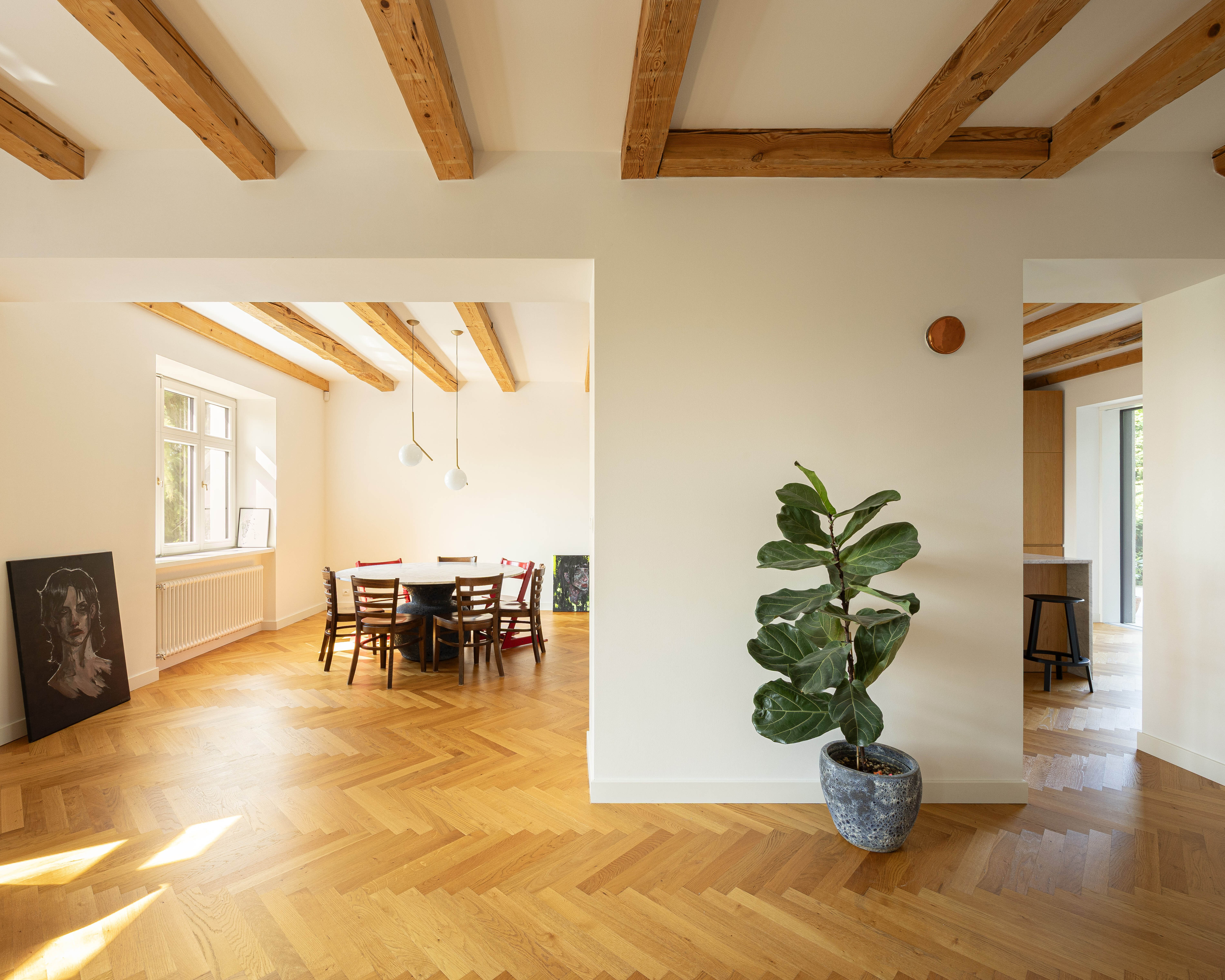 Dispozícia pôvodnej vily, ktorá odrážala dobové členenie miestností, bola čiastočne upravená tak, aby vyhovovala súčasnému životnému štýlu. Odstránením niektorých priečok a zväčšením otvorov na prízemí vznikol rozsiahly obytný priestor prepájajúci kuchyňu, jedáleň a obývaciu časť. Tento priestor je opticky predĺžený do exteriéru vďaka novému posuvnému preskleniu, ktoré nahradilo časť obvodovej steny smerom do záhrady.