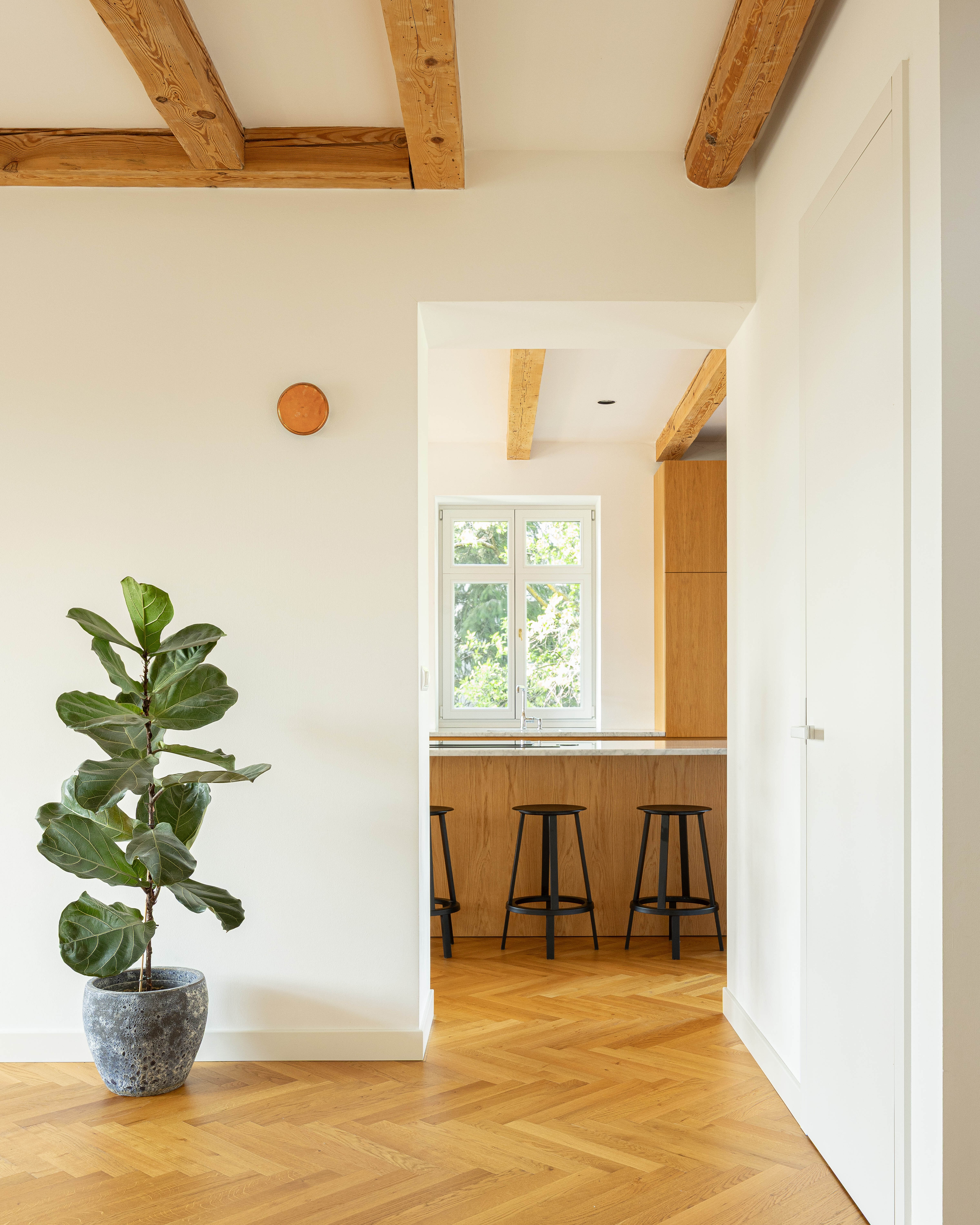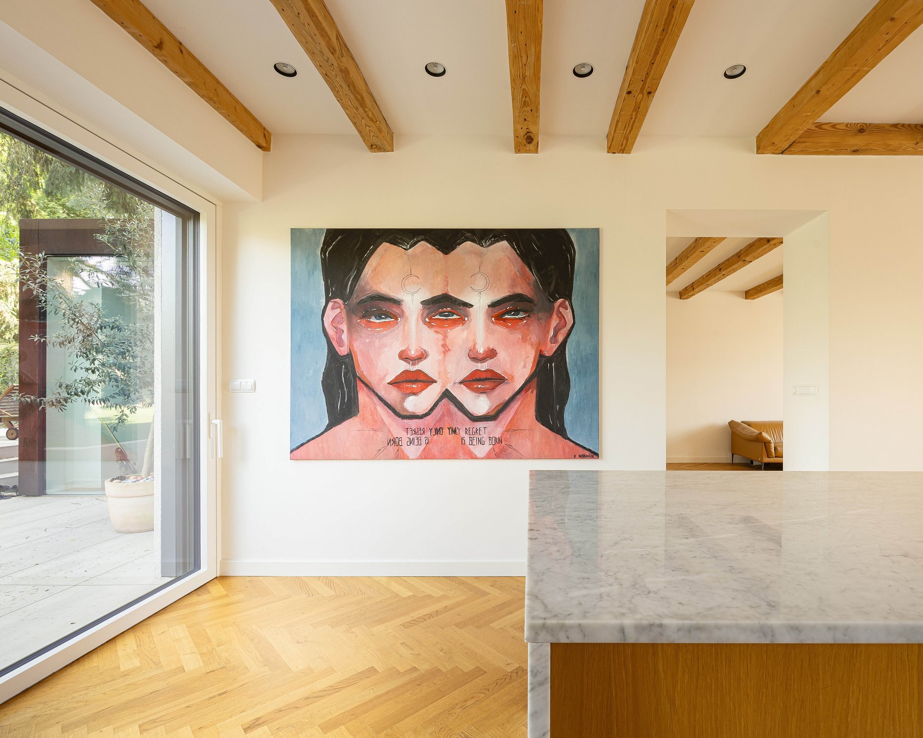 Napriek odlišnému výrazu sme sa však usilovali, aby interiér prístavby plynulo nadväzoval na zvyšok domu vďaka premyslenému prepojeniu a neutrálnemu farebnému ladeniu. Pohyb medzi starou a novou časťou je tak prirodzený a funkčný. Obyvatelia pociťujú rozšírenie domu ako jeho organickú súčasť.