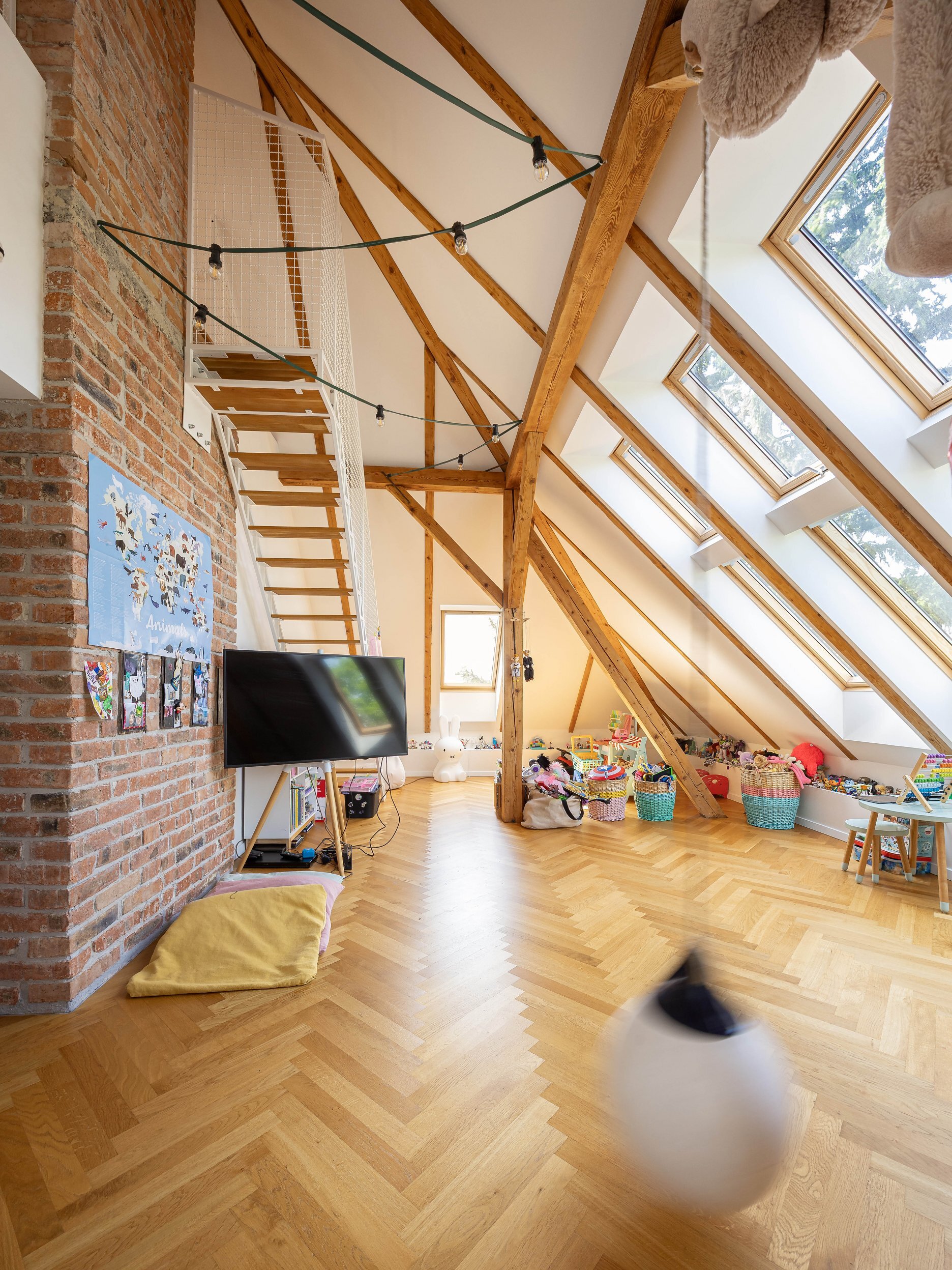 Adaptácia podkrovia predstavovala ďalšiu výzvu. Pôvodný drevený krov strechy bol zachovaný a citlivo zakomponovaný do novej podkrovnej obytnej časti venovanej deťom. V podkroví vznikla popri spálni rodičov aj herňa, ktorá ťaží z odhalenej konštrukcie krovu. Nepravidelná geometria strechy a rytmus pôvodných trámov vytvárajú dynamický a podnetný interiér. Deti tak majú k dispozícii priestorovo zaujímavú izbu, ktorá je súčasne moderná a pritom dýcha históriou domu.
