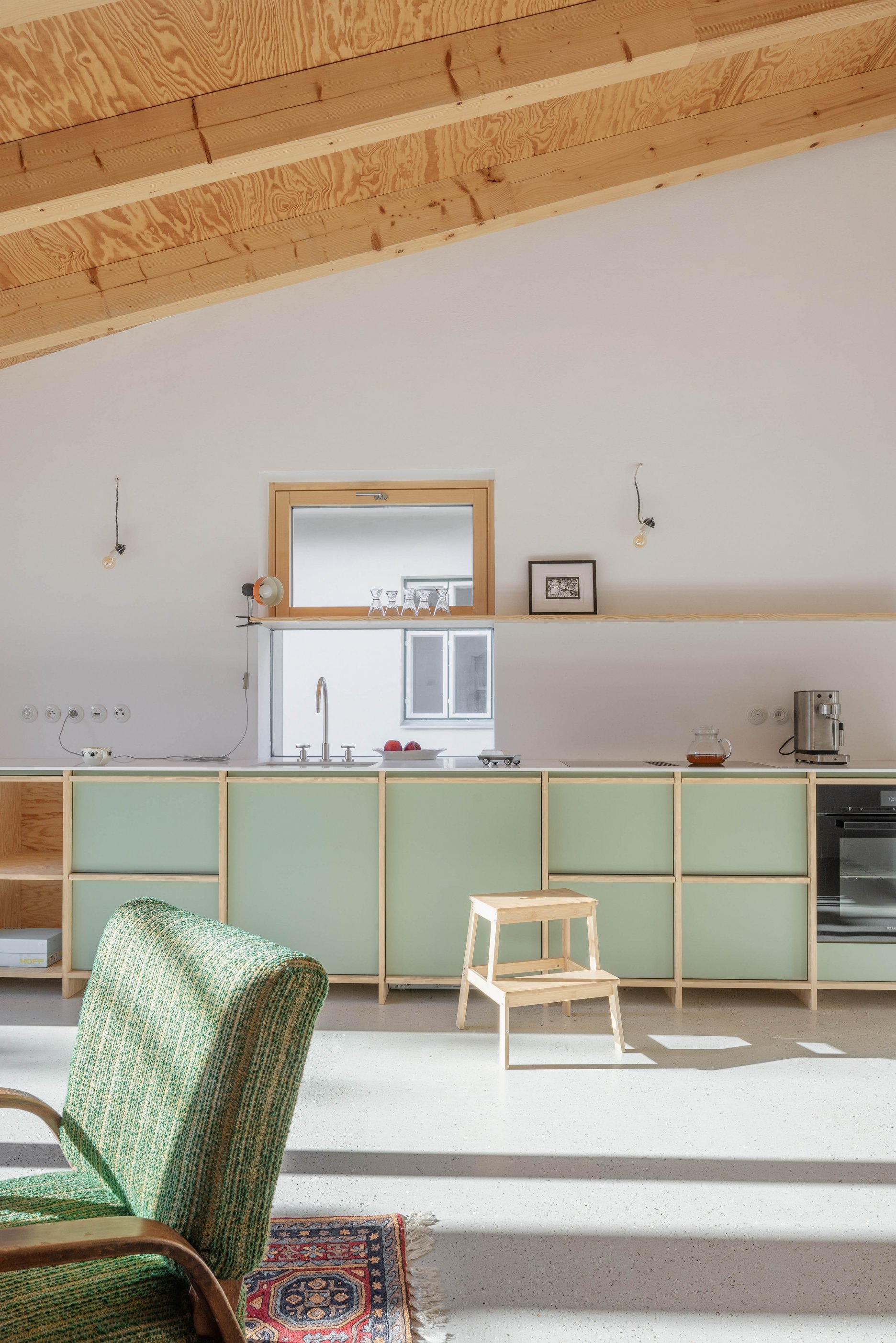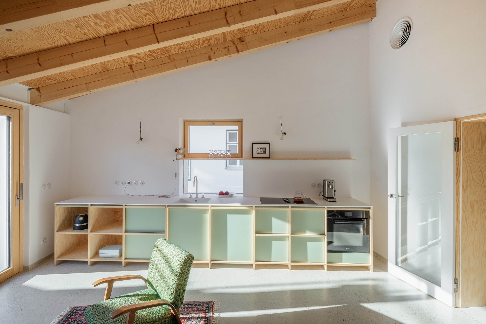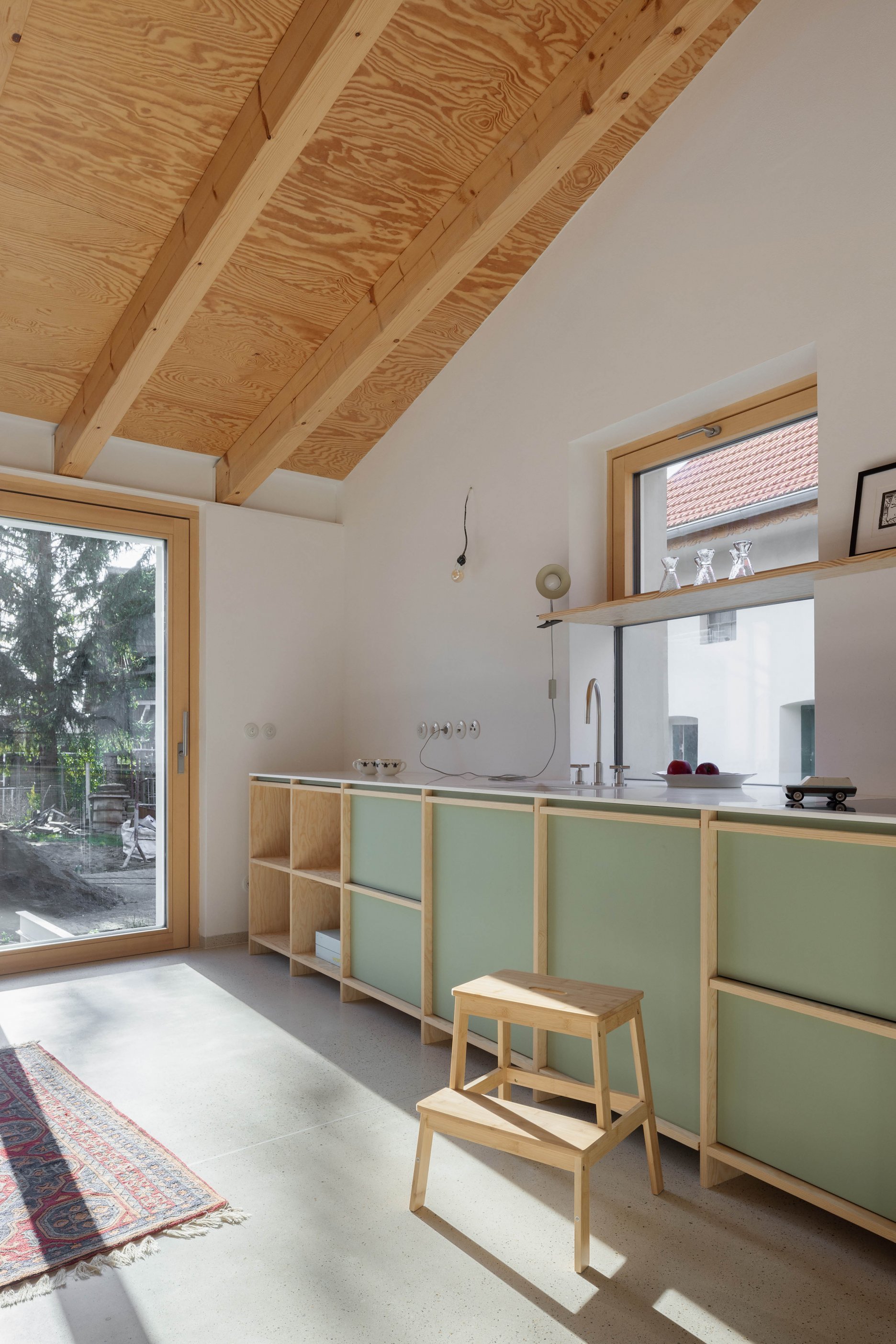 V tejto obytnej časti sme vytvorili novú strechu s obrátenou skladbou a priznanými KVH hranolmi s dreveným záklopom. Hranoly nad okenným portálom sme kotvili do oceľového I profilu, ktorý nám zároveň robil preklad aj pomúrnicu. To nám dovolilo sa viac priblížiť subtílnej architektúre pôvodného domu.
