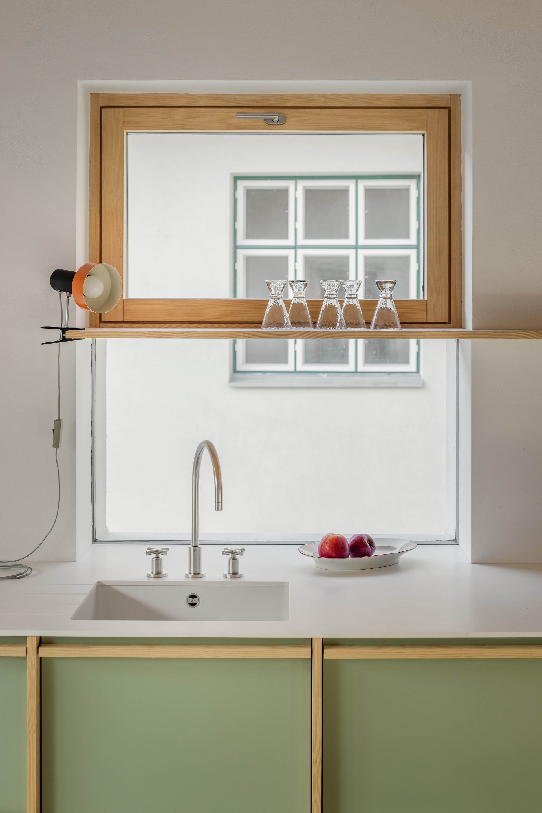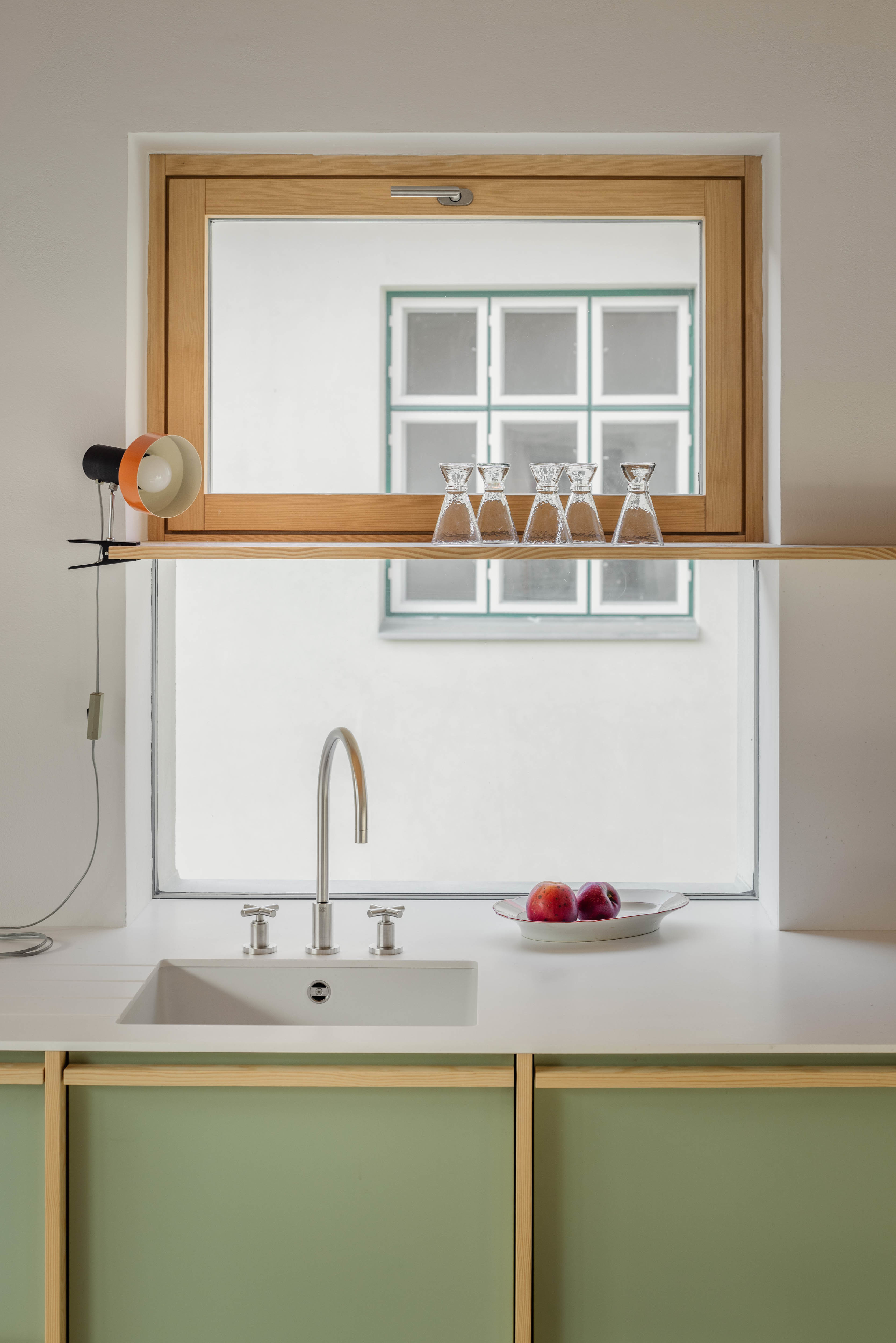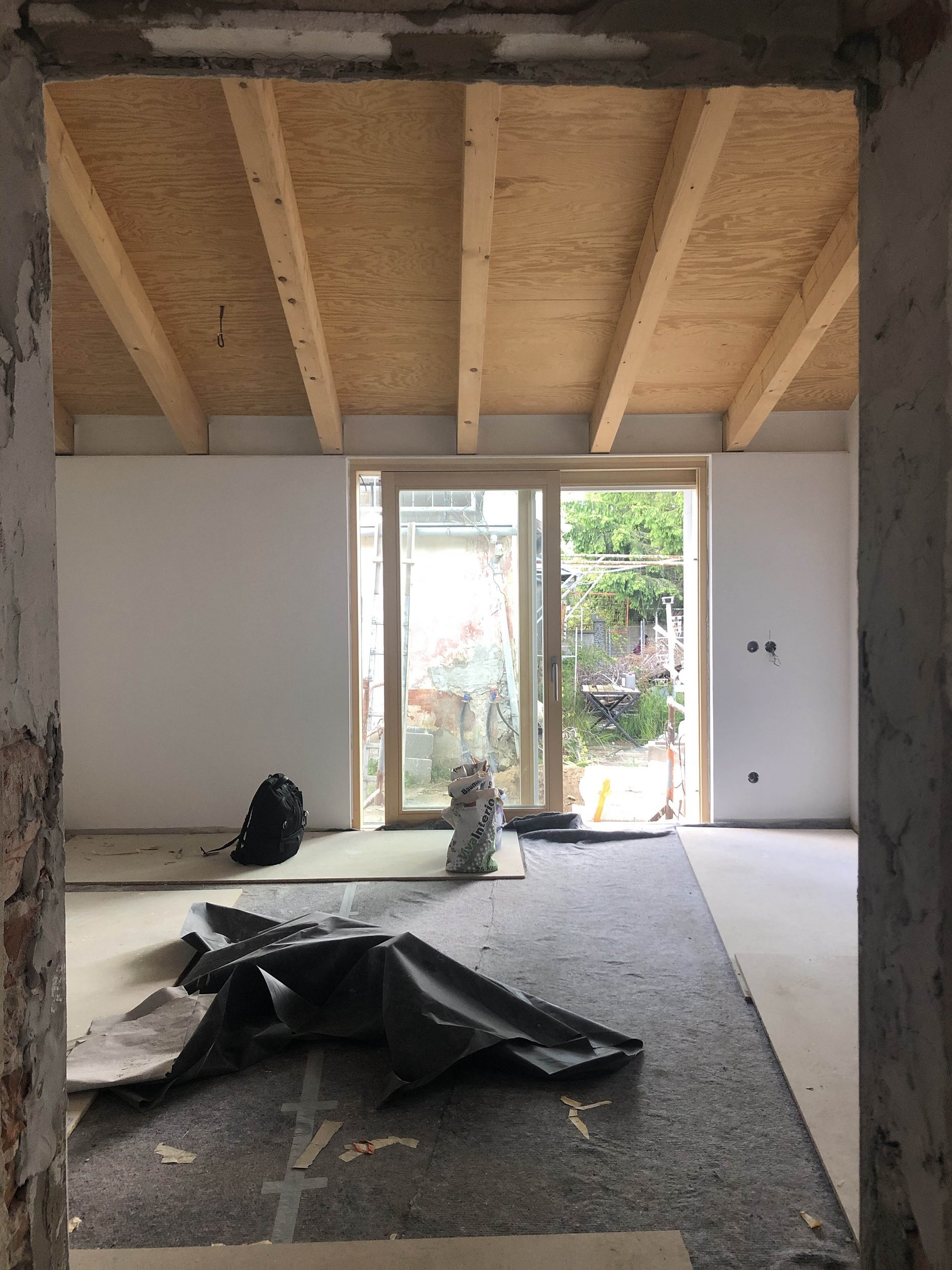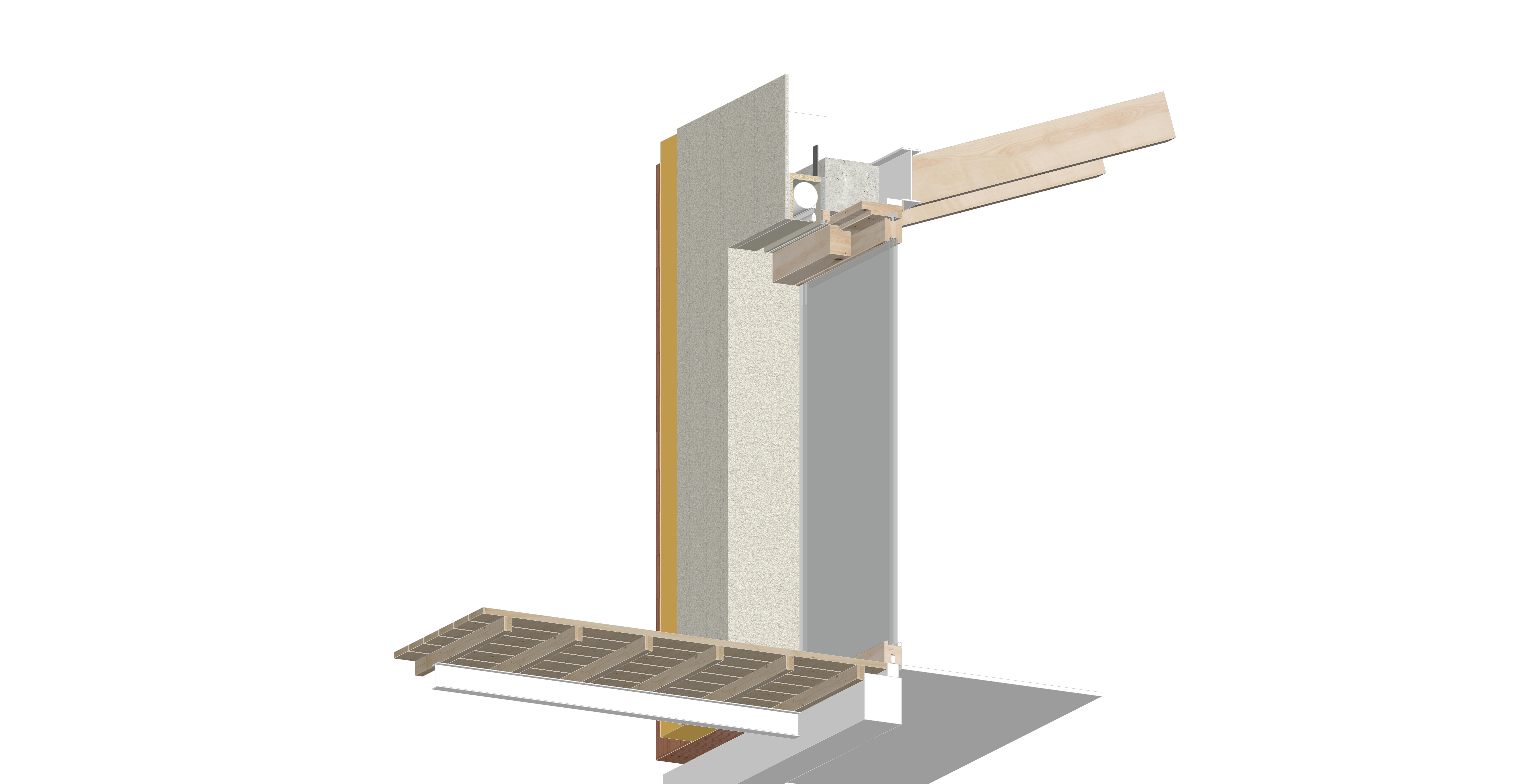 V tejto obytnej časti sme vytvorili novú strechu s obrátenou skladbou a priznanými KVH hranolmi s dreveným záklopom. Hranoly nad okenným portálom sme kotvili do oceľového I profilu, ktorý nám zároveň robil preklad aj pomúrnicu. To nám dovolilo sa viac priblížiť subtílnej architektúre pôvodného domu.