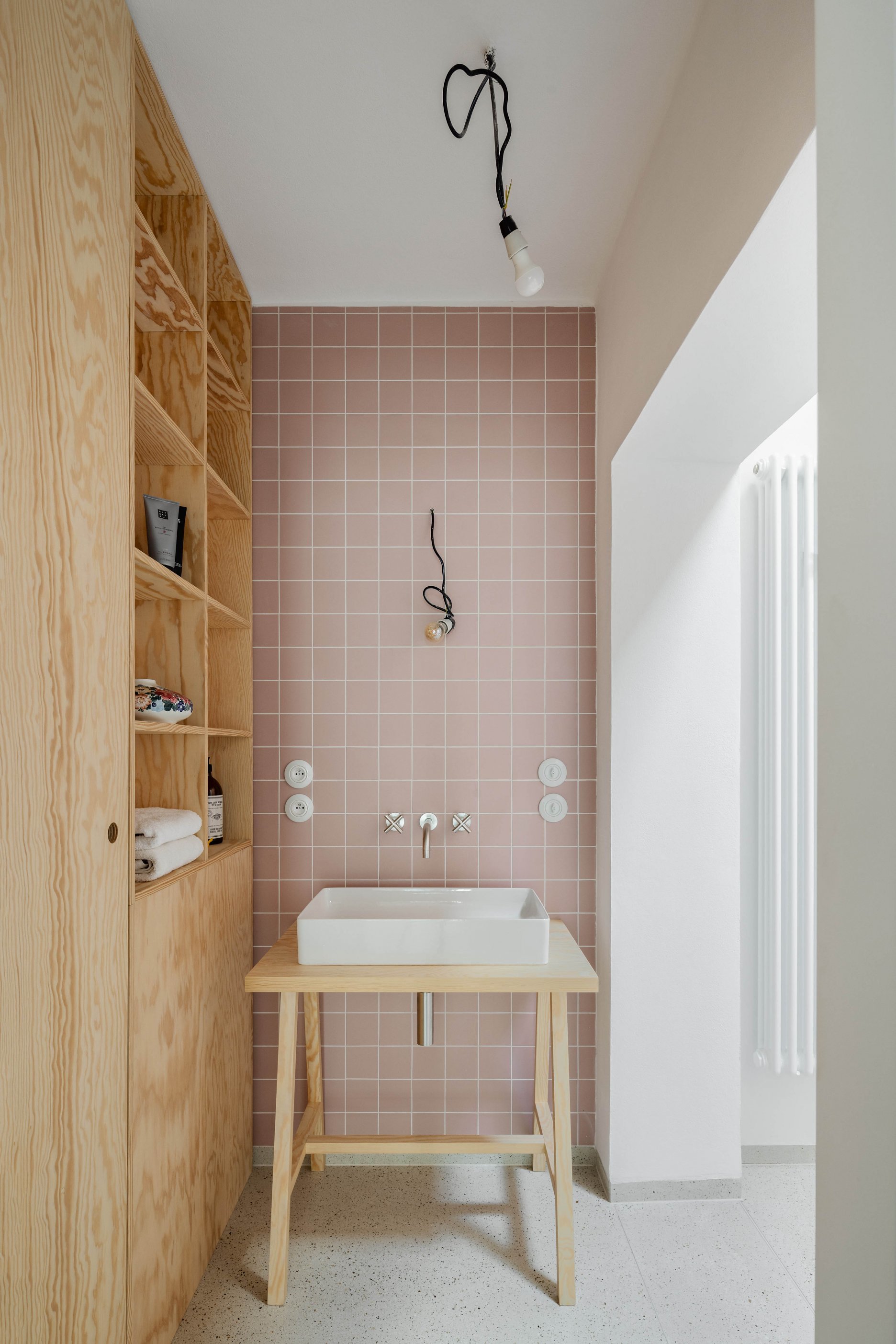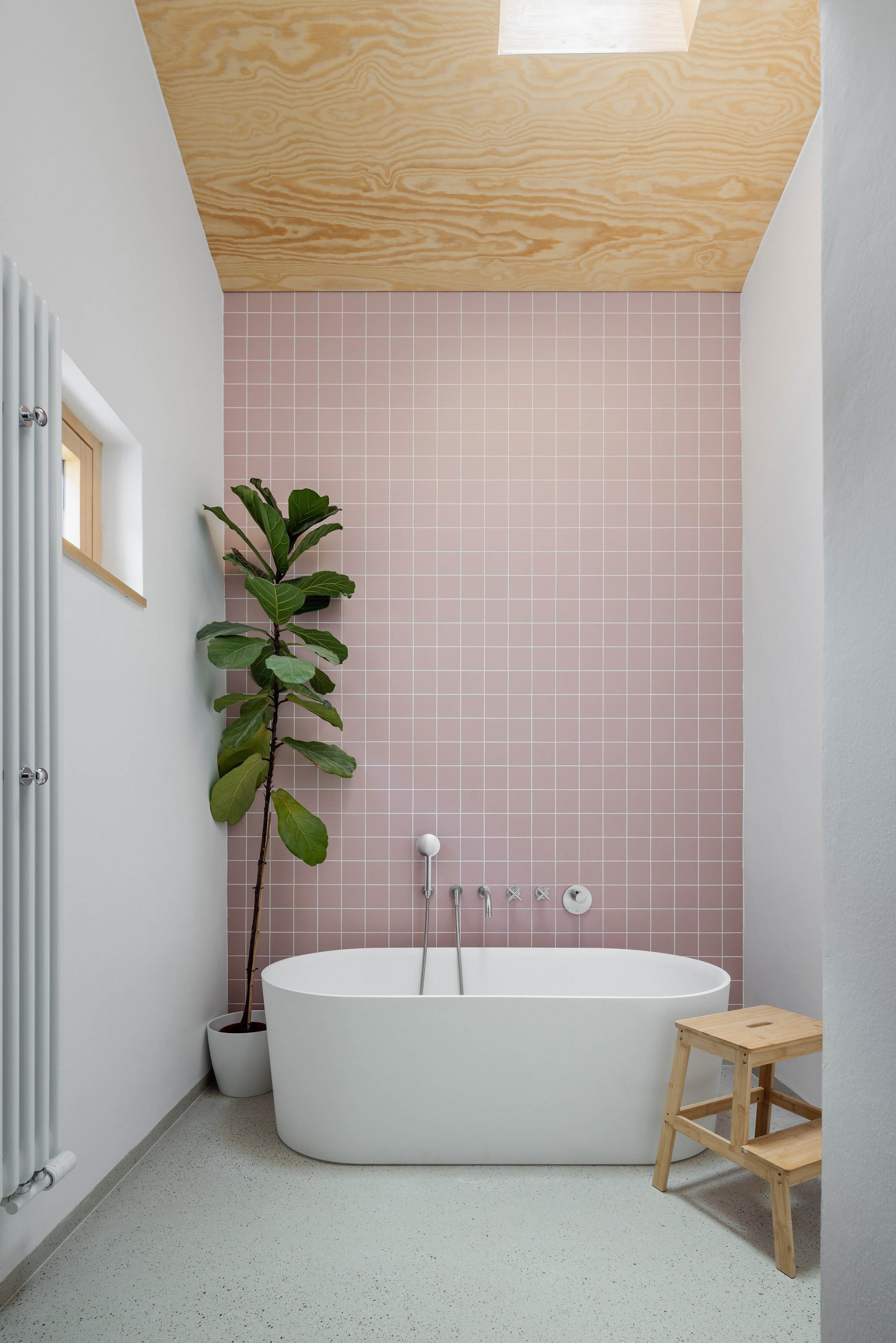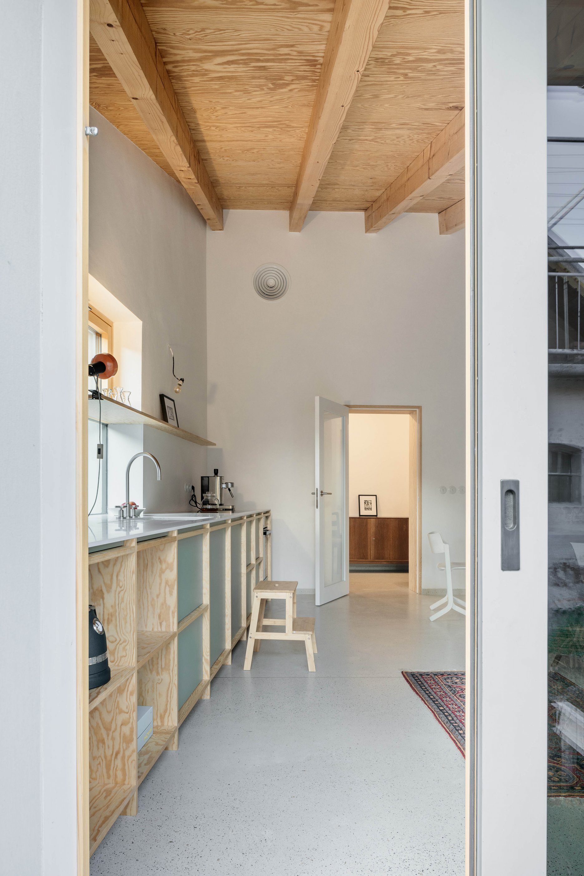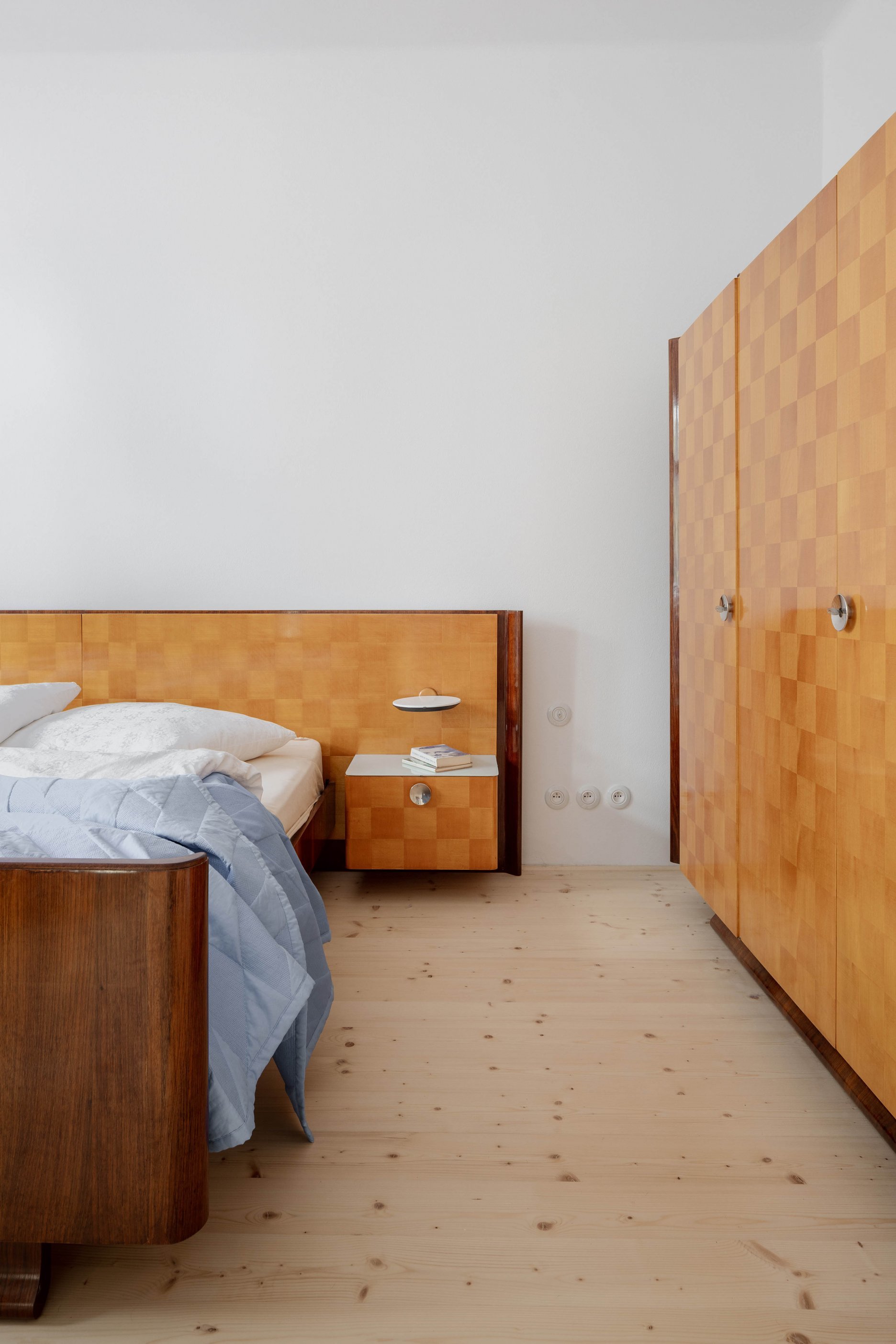 V interiéri pracujeme s pôvodnou materiálovou koncepciou, ktorú prenášame do súčasnosti. V izbách je použitá dlážkovica z ihličnatého dreva. Vo zvyšku domu je terazzo v súčasnom prevedení, s použitím lokálneho dunajského štrku. Obklady ako aj vstavaný nábytok vychádzajú z pôvodných farebností.