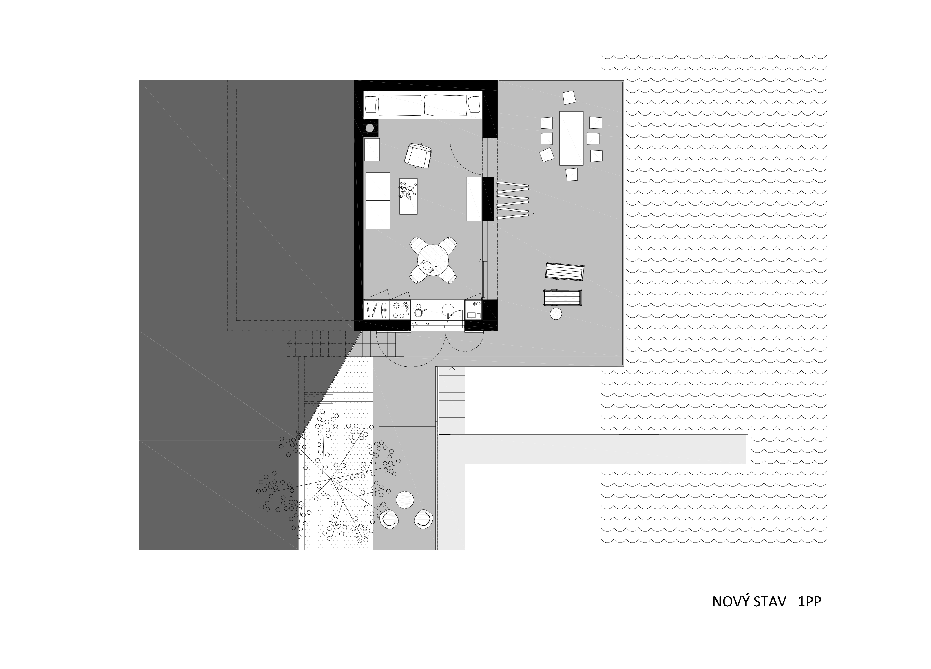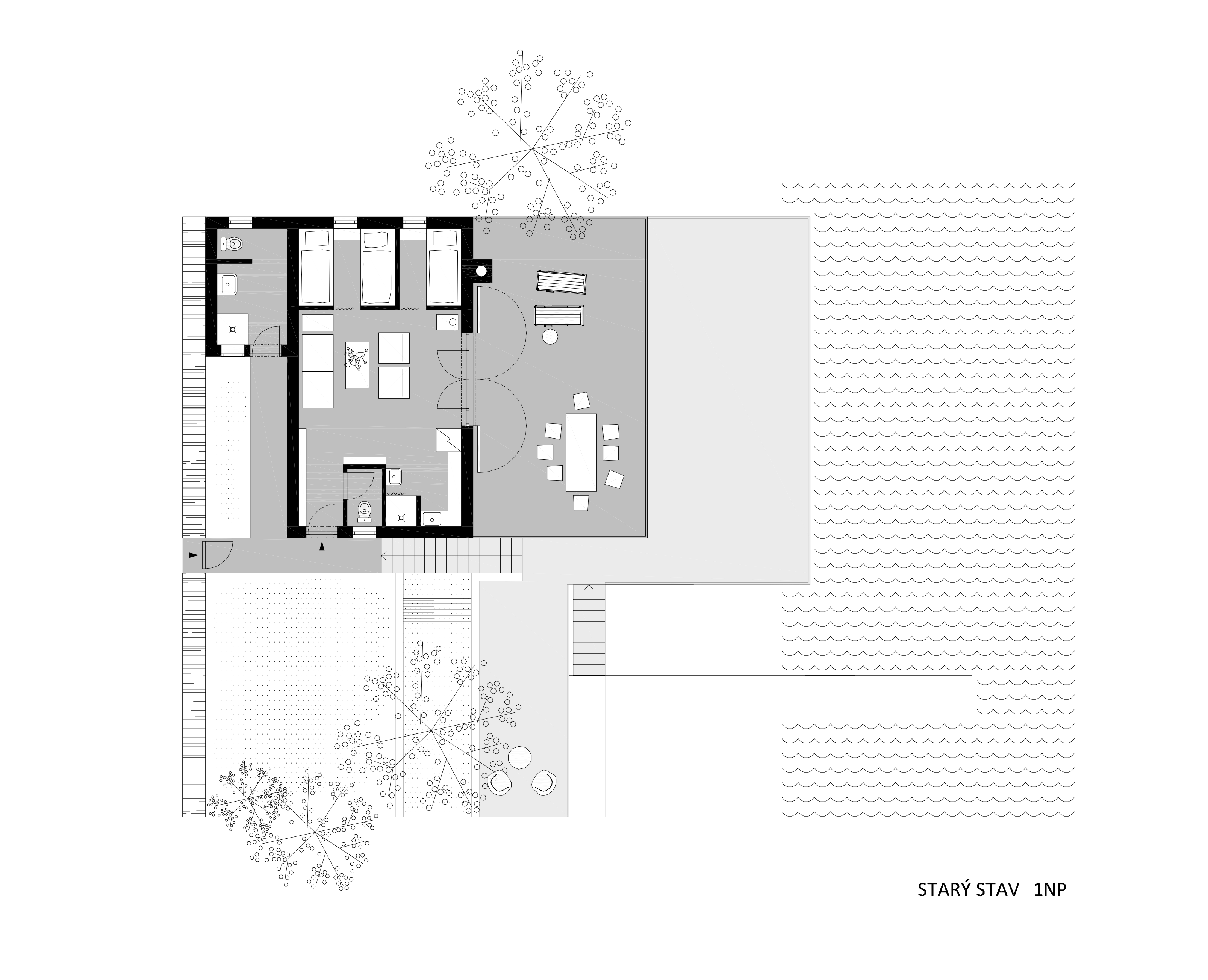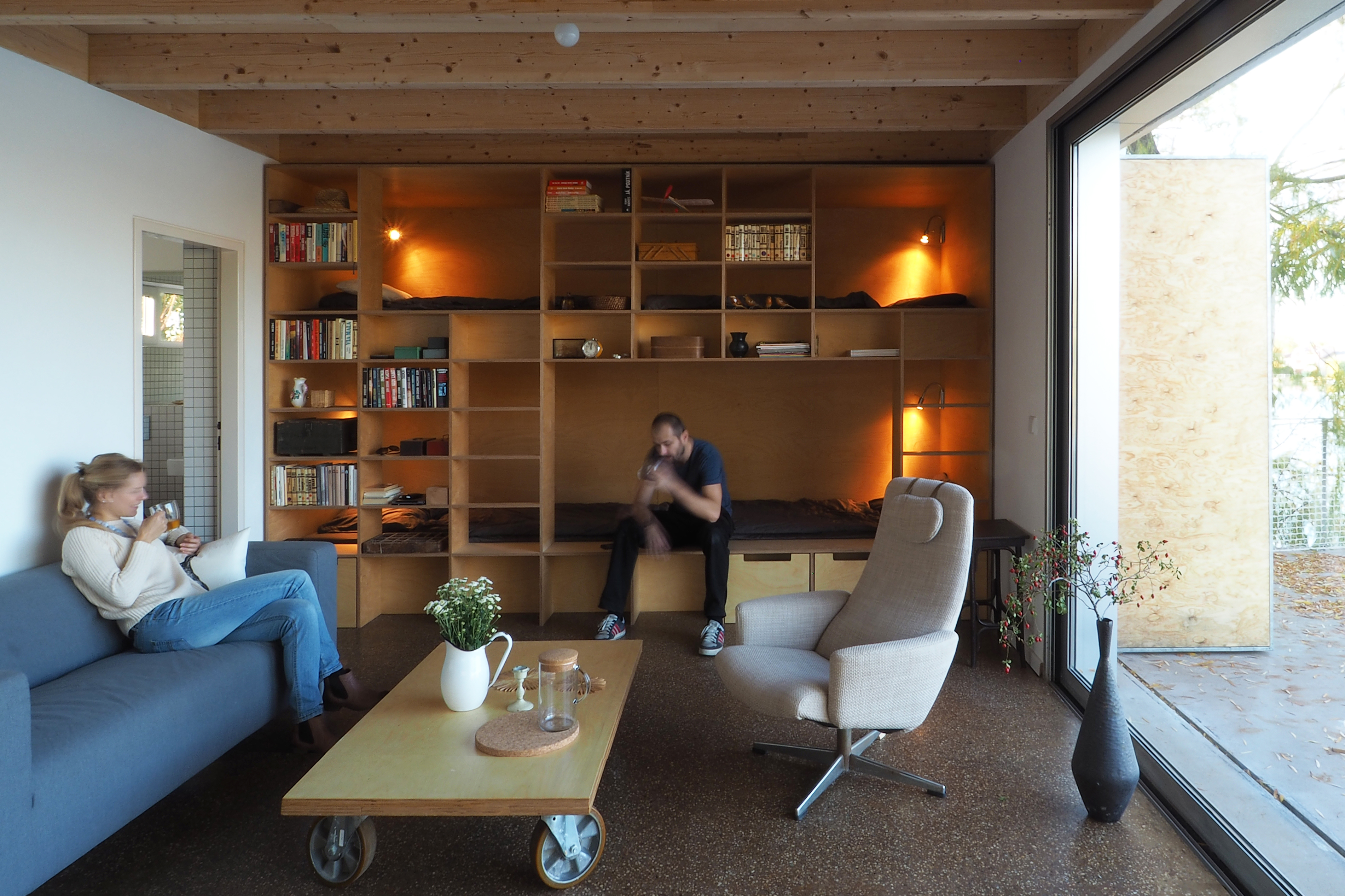 Chata s dvoma samostatnými rekreačnými jednotkami je nárazovo využívaná viacerými rodinami. Pri rekonštrukcii teda vyplynula požiadavka na jednoduchosť, odolnosť a ľahkú udržiavateľnosť. Členité horné podlažie sme vyčistili do jedného priestoru otvoreného na výhľad, po bokoch vymedzeného vloženými kubusmi interiérových prvkov – kuchyne so šatníkom a spacích boxov s knižnicou. Takto získaný priestor vytvára podmienky pre rôzne scenáre využitia a dokáže odolať náporu väčšieho množstva ľudí. Biela omietka, betónové podlahy a drevená preglejka použitá na nábytku, exteriérových posuvných paravánoch a okeniciach tvoria materiálovú bázu projektu nadväzujúcu na pôvodné riešenie.