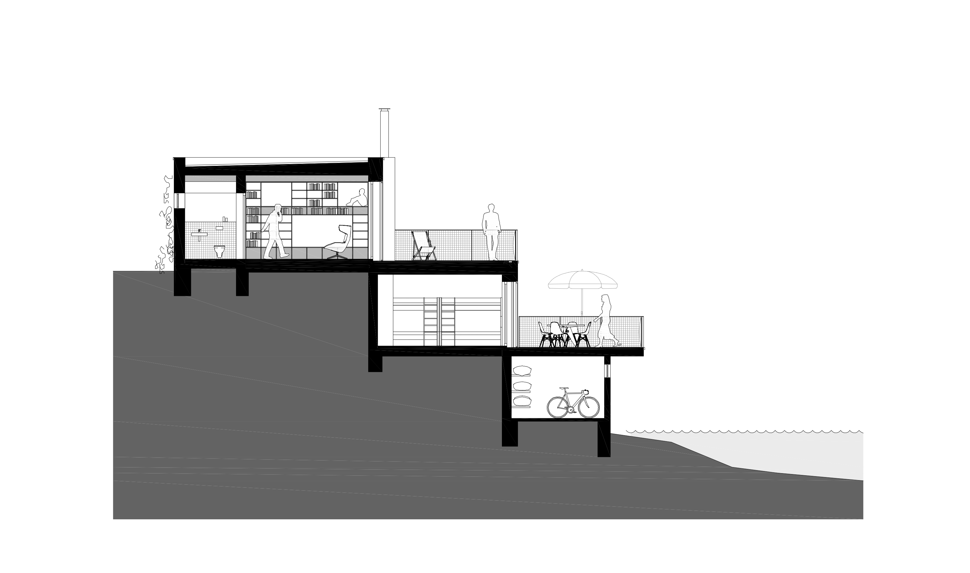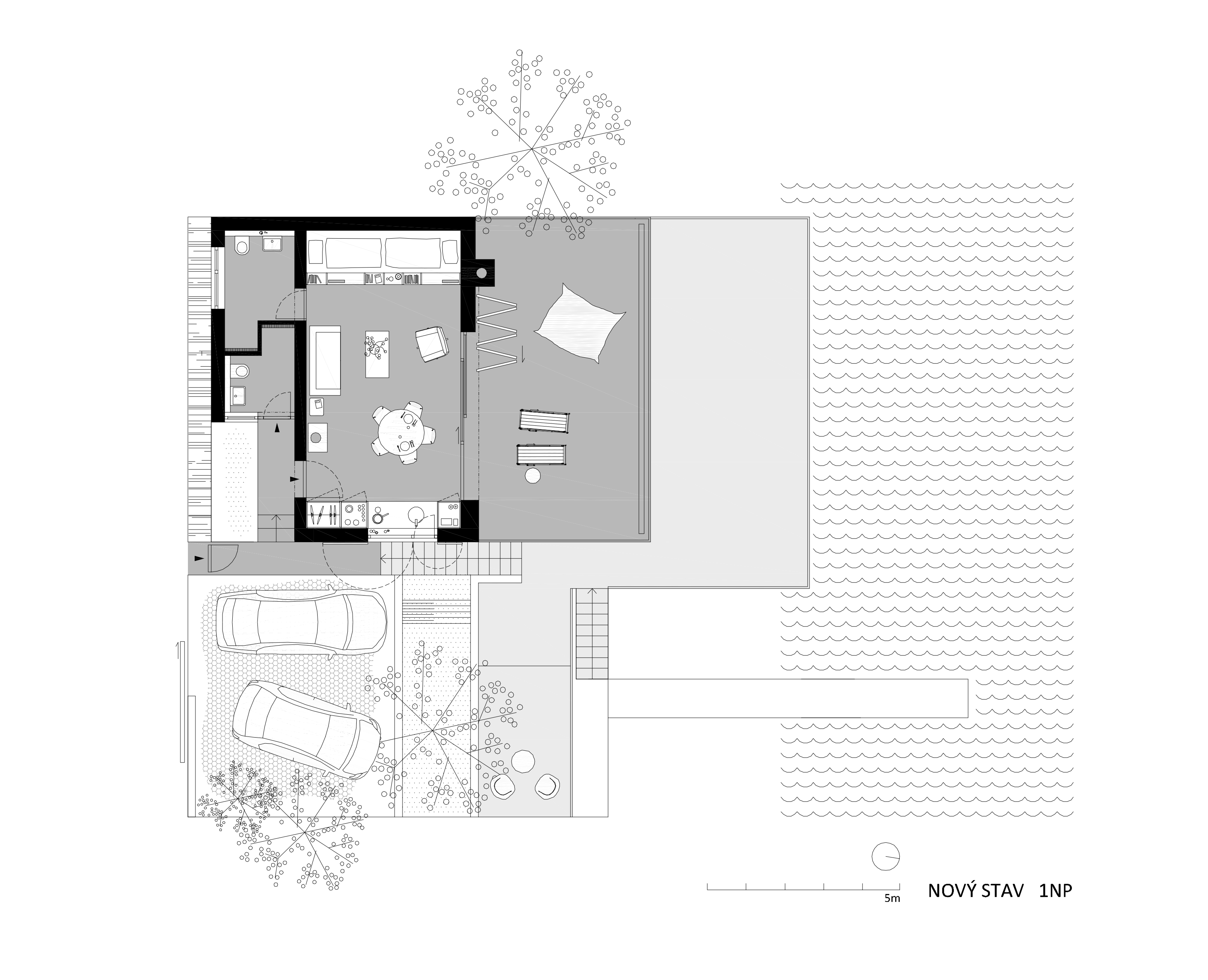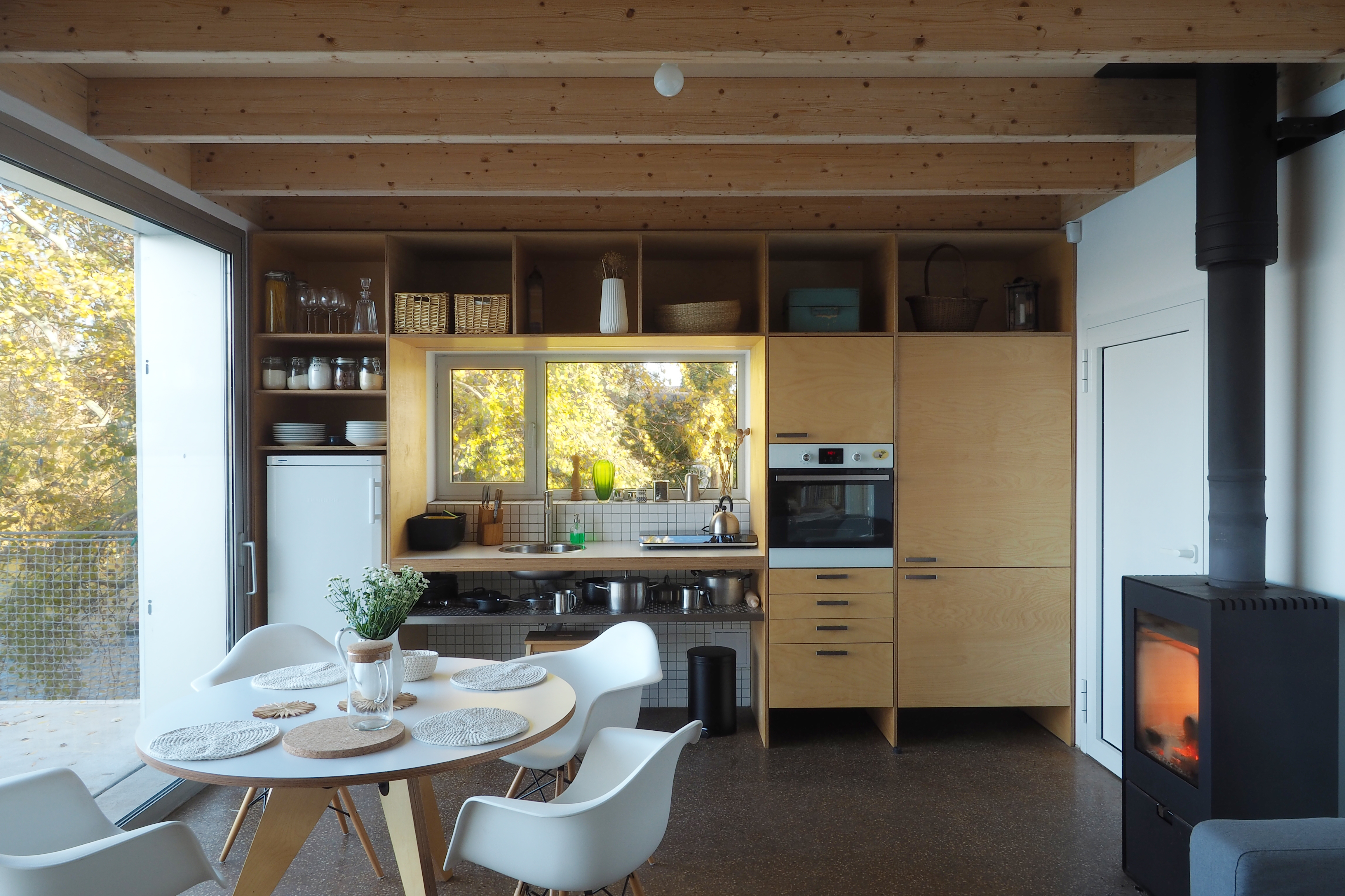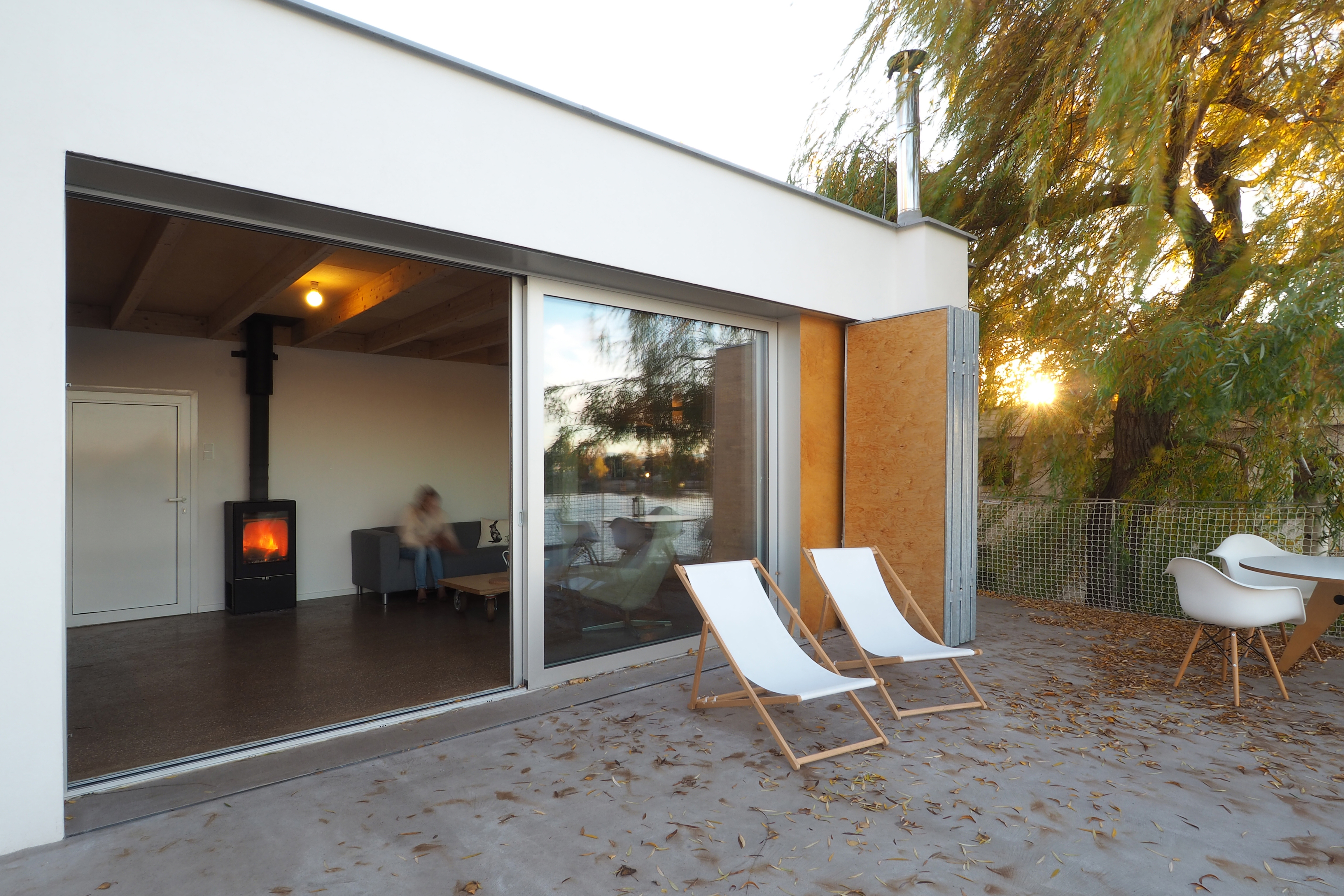 Chata s dvoma samostatnými rekreačnými jednotkami je nárazovo využívaná viacerými rodinami. Pri rekonštrukcii teda vyplynula požiadavka na jednoduchosť, odolnosť a ľahkú udržiavateľnosť. Členité horné podlažie sme vyčistili do jedného priestoru otvoreného na výhľad, po bokoch vymedzeného vloženými kubusmi interiérových prvkov – kuchyne so šatníkom a spacích boxov s knižnicou. Takto získaný priestor vytvára podmienky pre rôzne scenáre využitia a dokáže odolať náporu väčšieho množstva ľudí. Biela omietka, betónové podlahy a drevená preglejka použitá na nábytku, exteriérových posuvných paravánoch a okeniciach tvoria materiálovú bázu projektu nadväzujúcu na pôvodné riešenie.