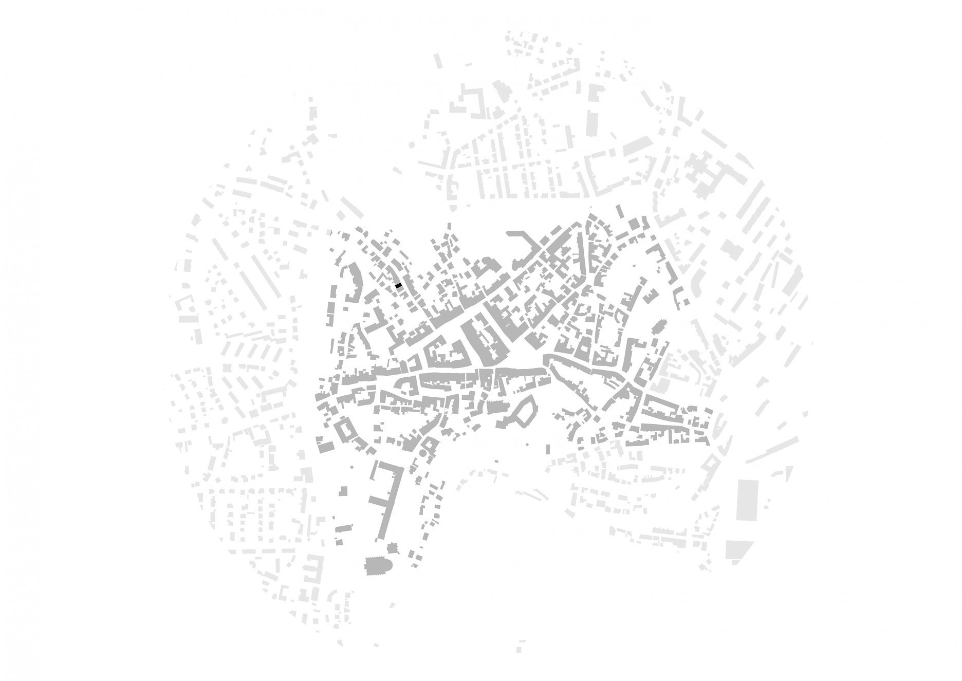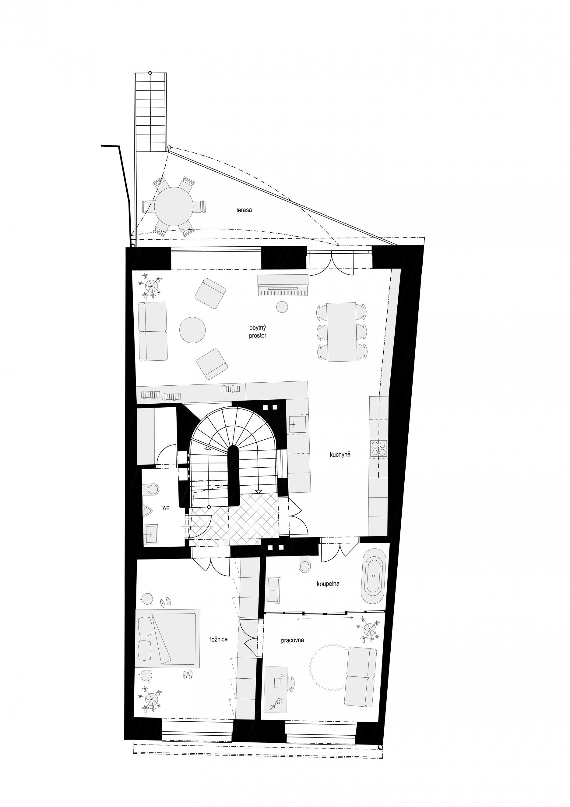 Ústredným prvkom dispozície je špirálové schodisko v jadre pôdorysu. “Díky luxferovým stěnám a dalším novým otvorům, které do něj ústí, se hlavní komunikační jádro stává i mediátorem mezi jednotlivými místnostmi domu v horizontálním směru,” zdôrazňujú architekti. Prízemie a poschodie prepájajú pôvodné kamenné stupne. Do podkrovia následne vedú votknuté oceľové schody, prepúšťajúce svetlo zo svetlíka do nižšej úrovne a hĺbky dispozície.