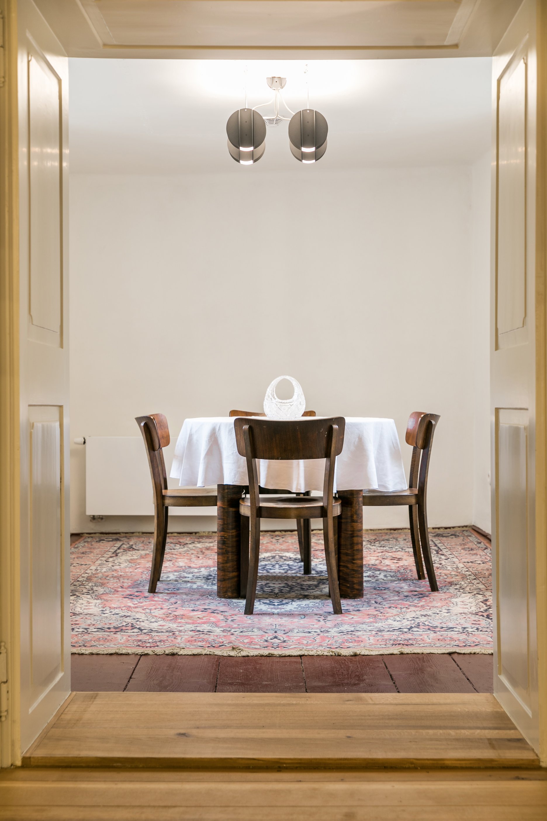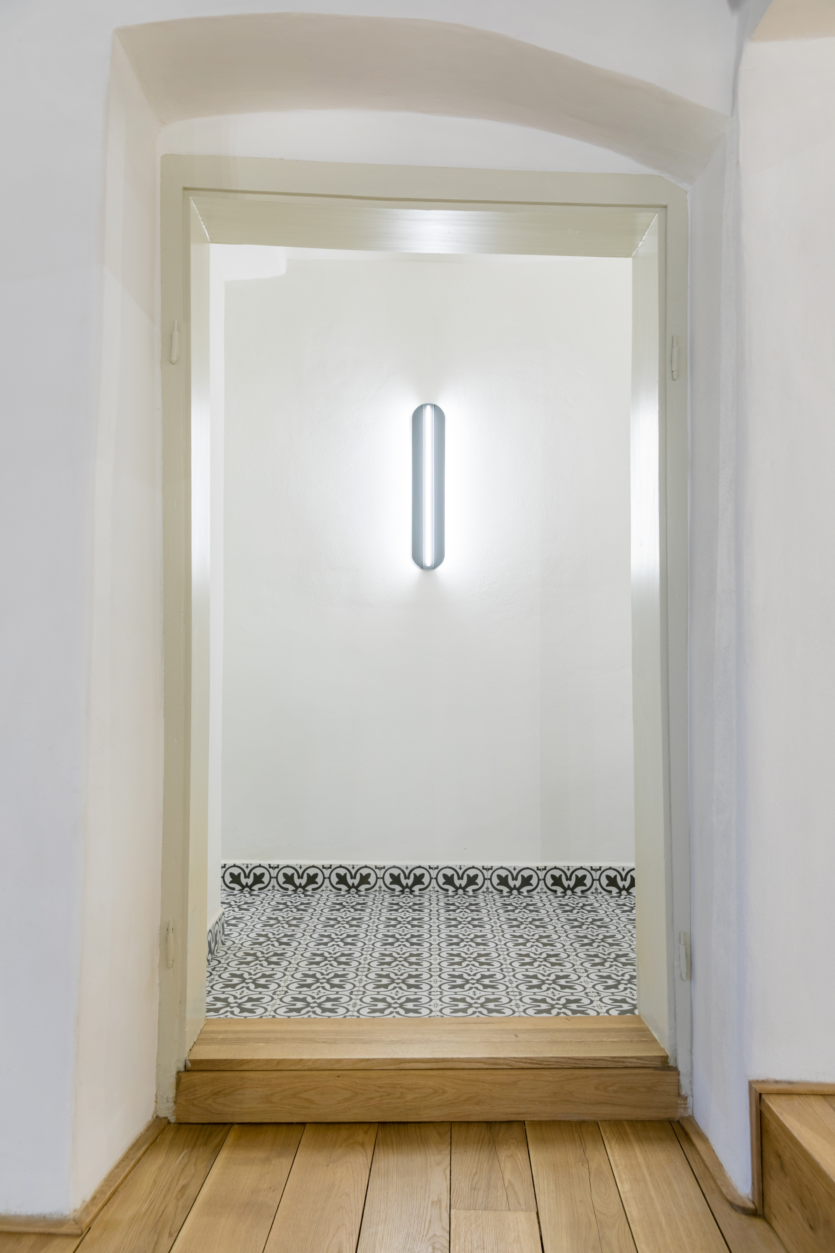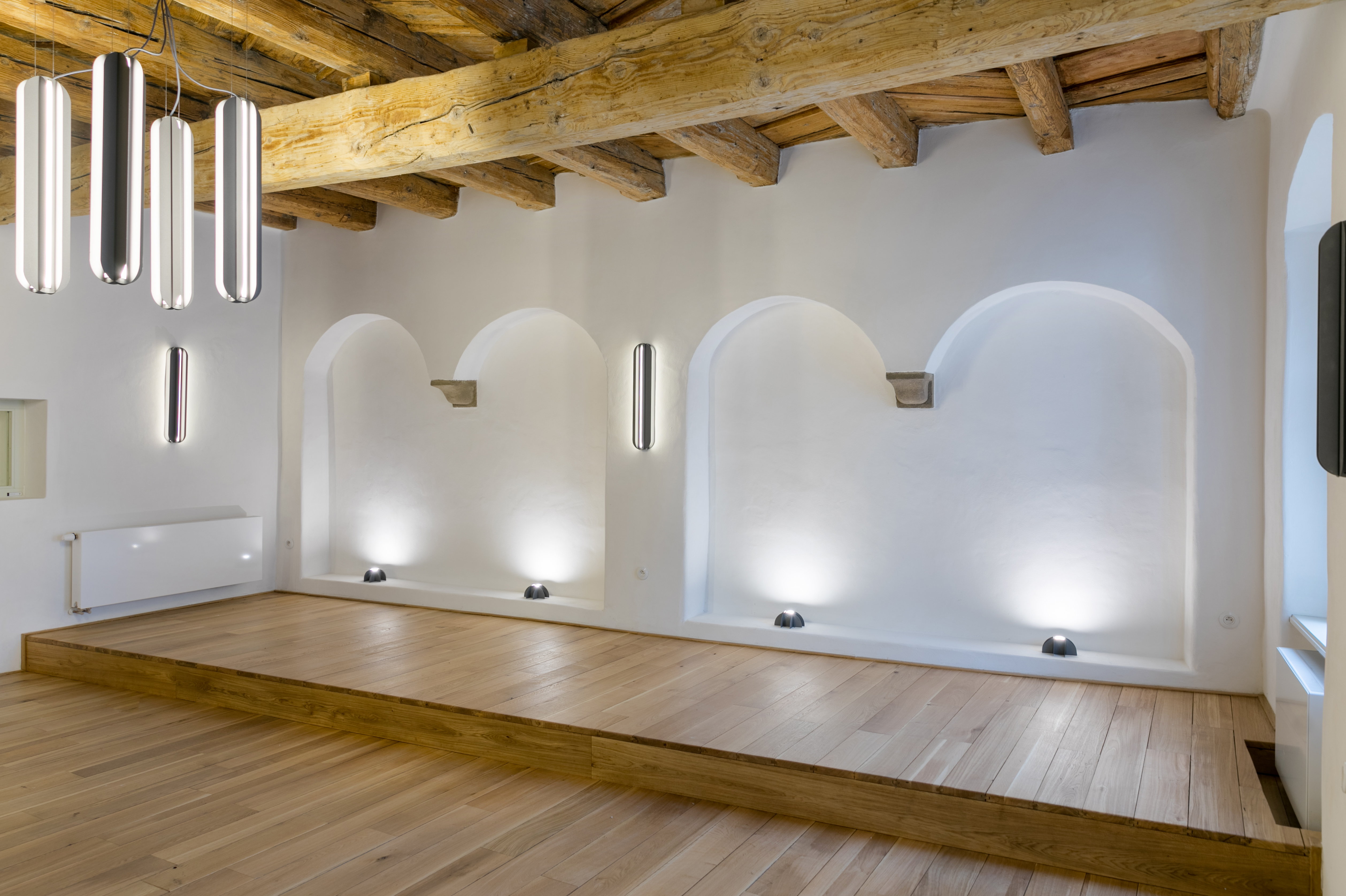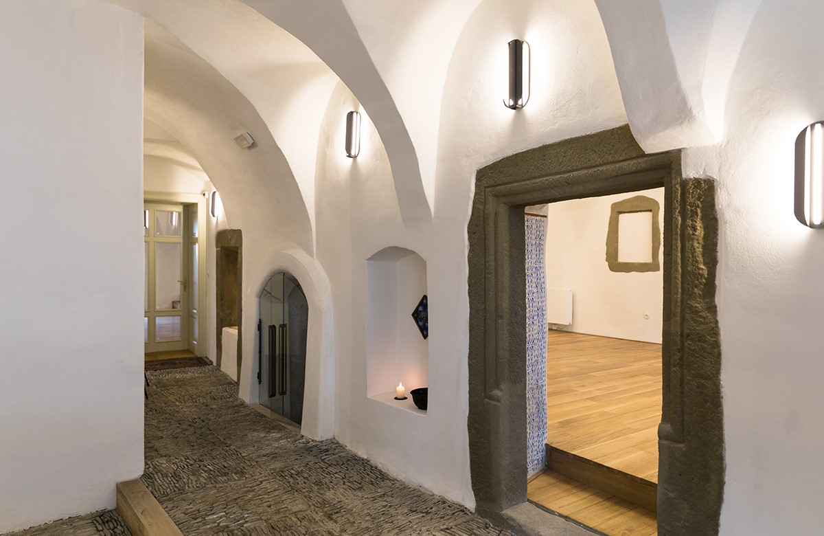 V priebehu stavebno-historického prieskumu a realizácie stavby boli odhalené autentické prvky, ako napríklad okruhliaková dlažba, kamenné ostenia, portály, murované klenuté niky s kamennými hlavicami, drevené trámové stropy a maľby z obdobia neskorého baroka, ktoré boli následne zreštaurované. Na uličnom priečelí domu boli namiesto garážových brán a zamurovaných otvorov realizované podľa dobových fotografií drevené výklady. Obnovené konštrukcie sú doplnené novými, ktoré využívajú tradičné materiály. Drevo, kameň, sklo, kov... Pri návrhu bol použitý princíp kontrastu starých, prirodzene krivých povrchov s novými presnými líniami. Napríklad staré kamenné ostenie versus nové sklenené výplne, alebo ručne omietané klenby a bezrámové stropné podhľady...