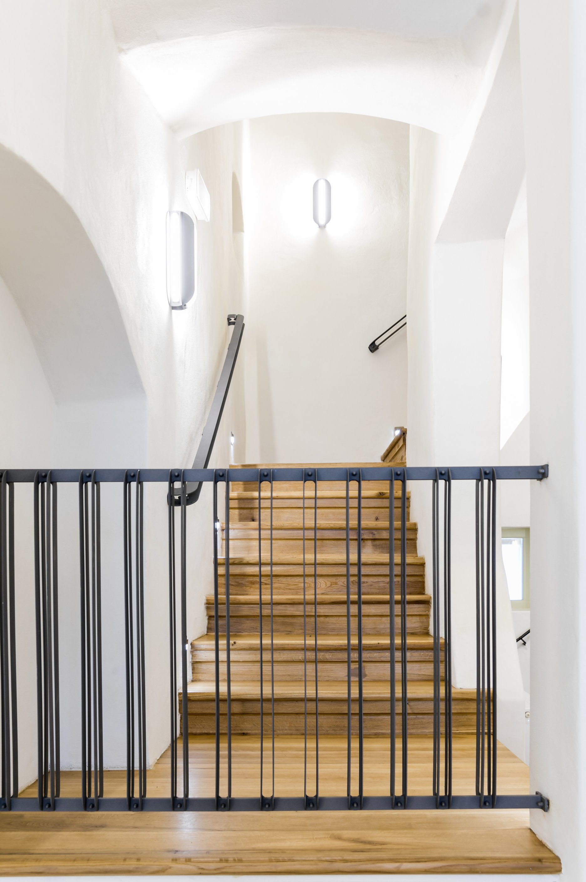 Celkové architektonické stvárnenie interiéru dotvárajú kovové zábradlia, madlá a originálne osvetlenie.