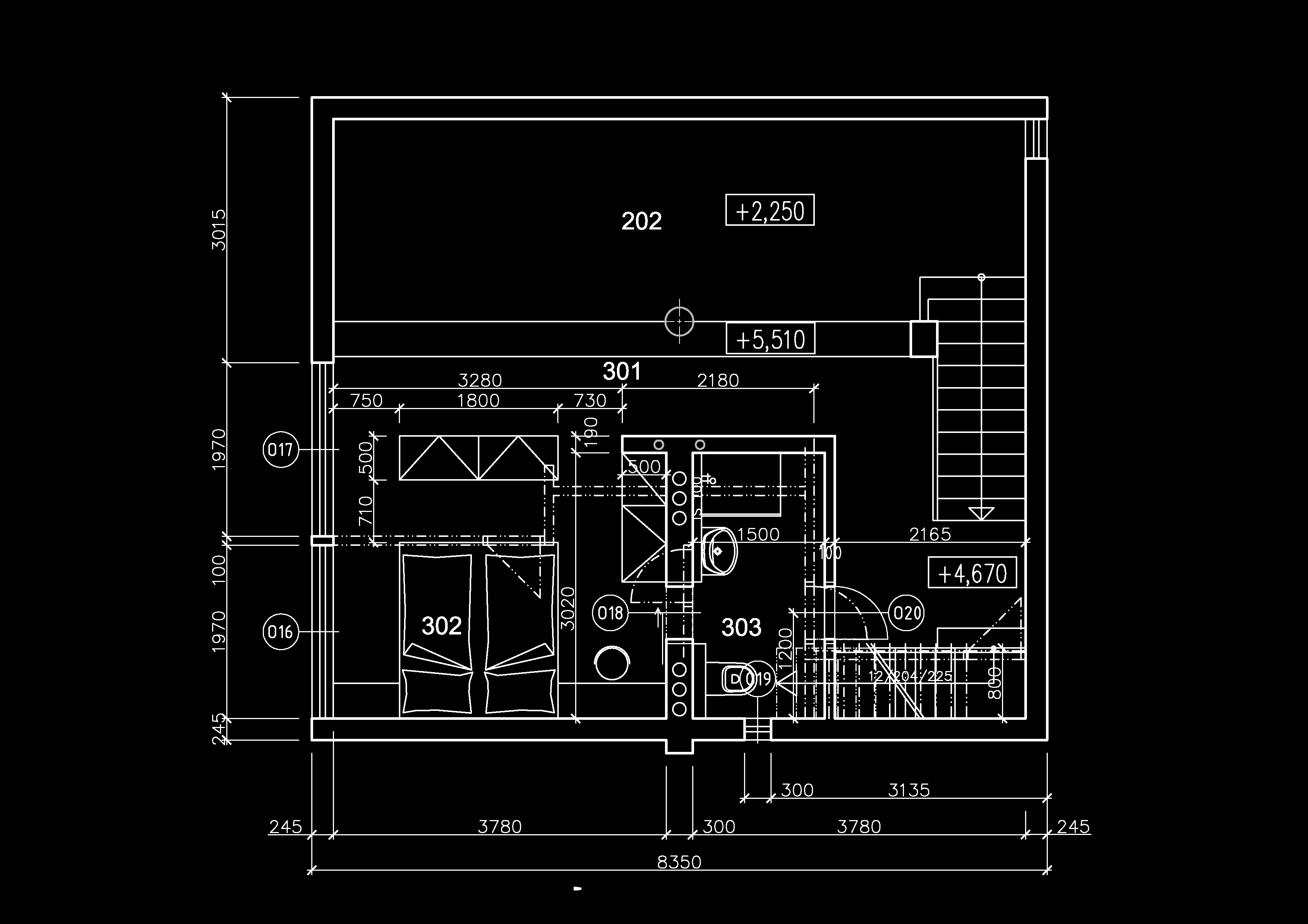Nočná časť je situovaná na 3.np, kde je na galérii umiestnená spálňa so vstavanými skriňami a vstupom do priechodnej kúpeľne so sprchovým kútom. Schodisko do 4.n.p. bolo vyhotovené úplne novo a komfortnejšie. Jeho konštrukcia je koncipovaná ako vstavaný nábytok s úložným priestorom.