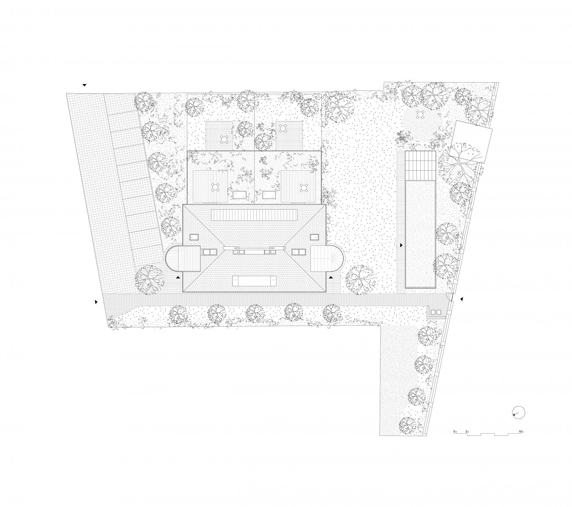 Pri západnej hranici pozemku vznikol jednopodlažný záhradný altánok. Steny z režného muriva dopĺňajú drevené stĺpy a stropné trámiky. Režné murivo na nových prvkoch tvorí pomyselnú spojnicu medzi všetkými stavebnými objektmi. Altánok v sebe ukrýva saunu a telocvičňu pre obyvateľov domu. Zároveň chráni pozemok pred hlukom z priliehajúcej ulice. Pokojný priestor telocvične rytmizuje drevená konštrukcia. Presklená stena prepája interiér so záhradou.