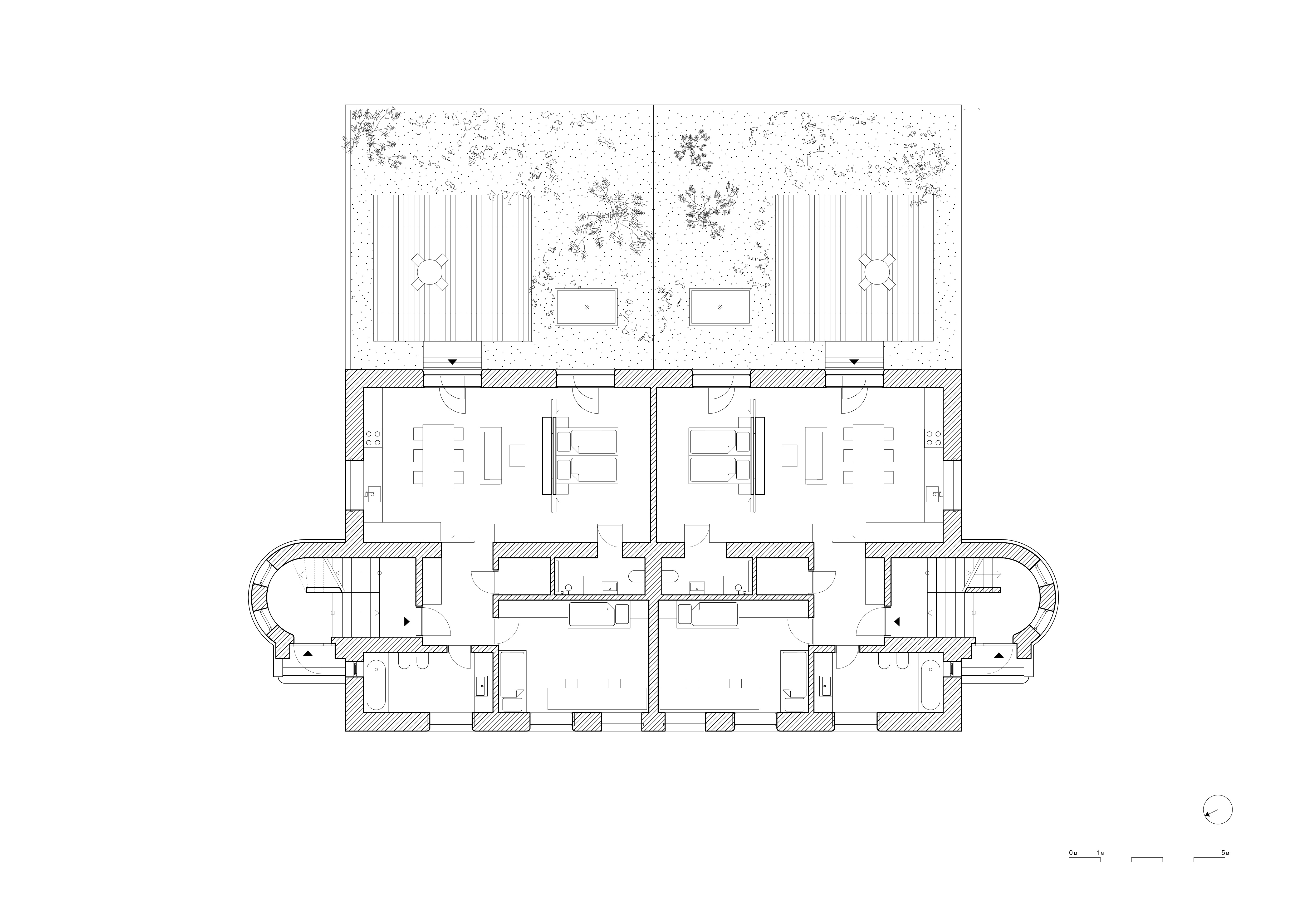 Veľký mezonetový byt v podkroví slúži majiteľovi domu. V priestore možno obdivovať odhalené drevené konštrukcie. Architekti preto využili nadkrokvovú izoláciu a preglejkový záklop. Interiéry bytov sú ladené do neutrálnych odtieňov sivej v jemnom kontraste s brezovou preglejkou a nerezovými prvkami.