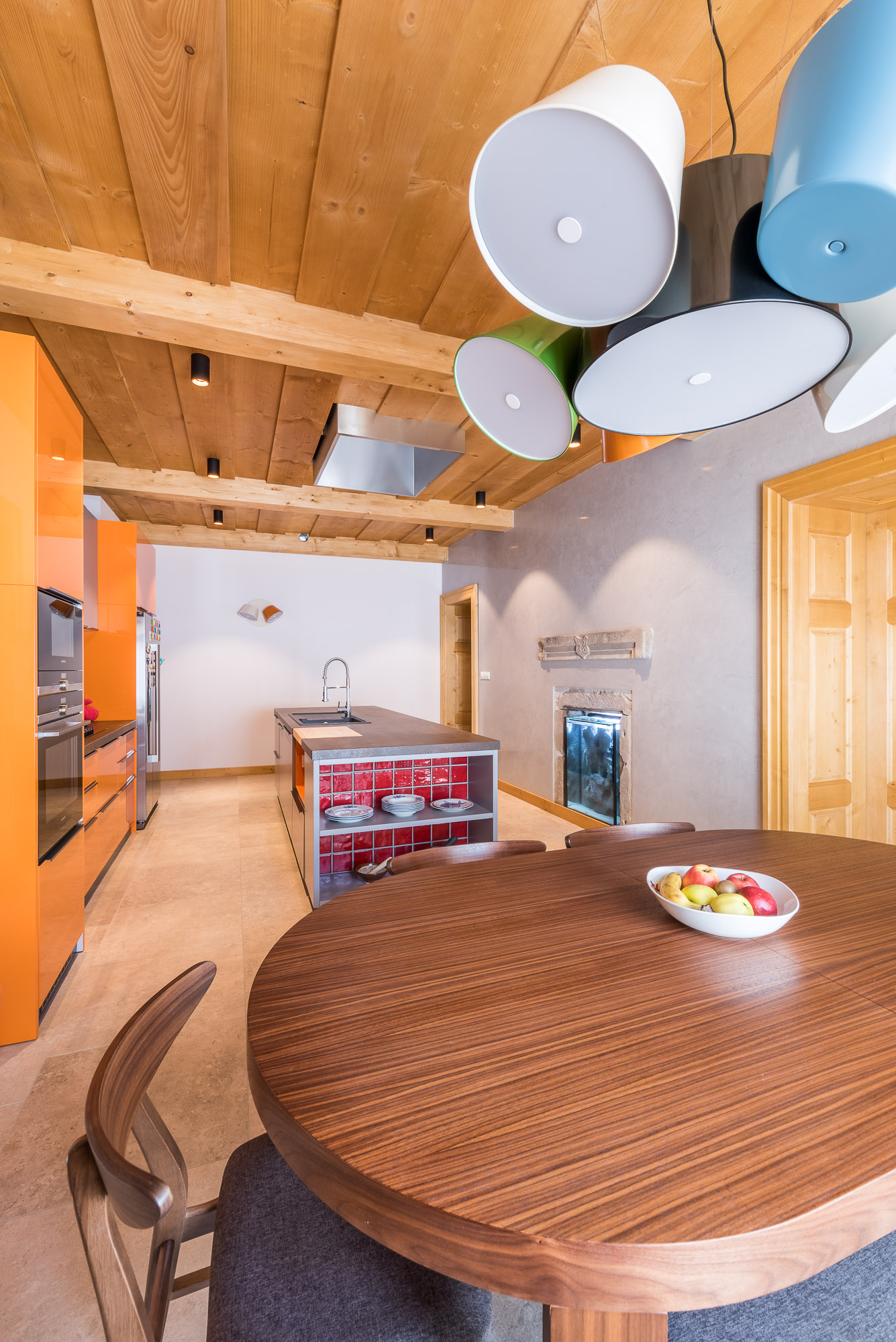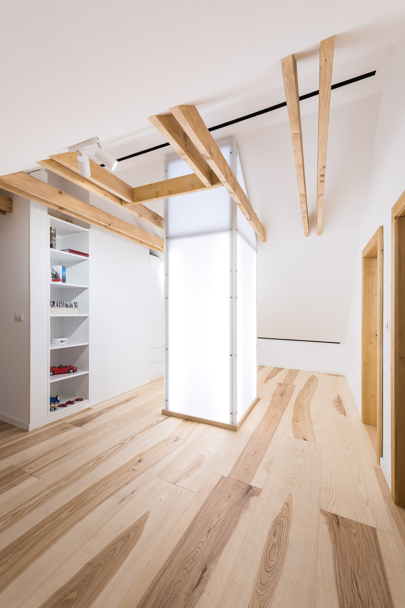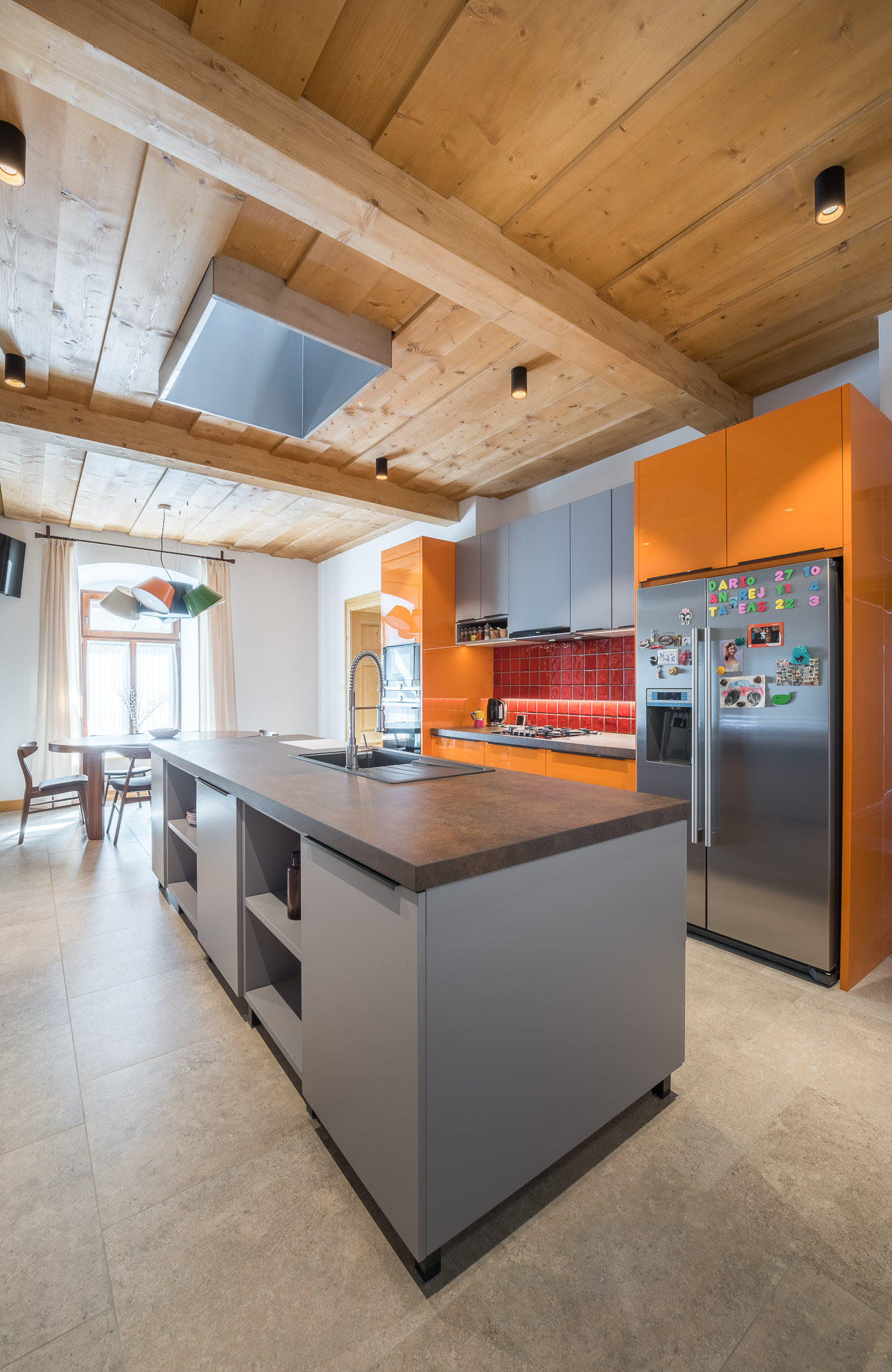 Kuchyňa, jedna z hlavných miestnosti domu, kde pulzuje rodinný život a skoro každodenné návštevy (dom je v centre, "vidno" doň z ulice, takže pre známych a susedov nie je problém zastaviť sa na kávu...) je taktiež priestorom jedálne, komunikačným priestorom. Nielen v sociálnom a horizontálnom rozmere, ale i v rozmere vertikálnom. Nad jej stredom ústi svetlík pretínajúci strechu, podkrovie i trámový strop. Sprostredkúva bazilikálne osvetlenie hlbokej miestnosti, spája vzájomne obe podlažia. LED osvetlenie integrované vo svetlíku vo večerných hodinách dosvetľuje pracovnú časť kuchyne a zároveň pôsobí ako svetelný prvok i v samotnom podkroví.