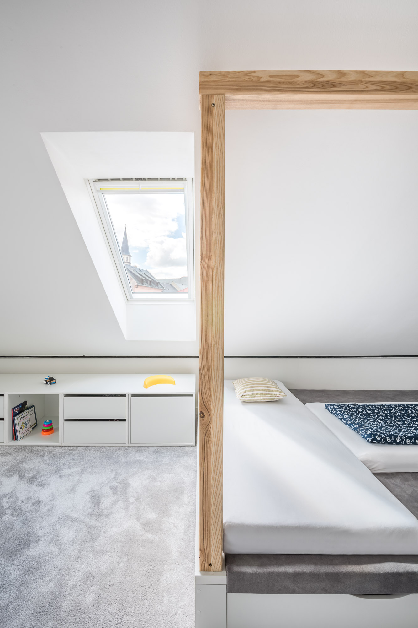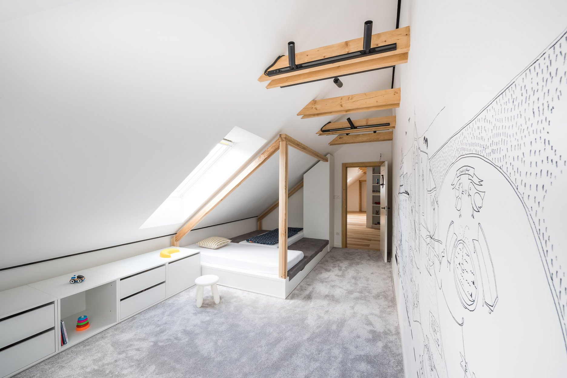 V obytnom podkroví sa nachádza rodičovská spálňa, dve detské izby, kúpeľňa a hala so svetlíkom. Spálňa orientovaná do záhrady je doplnená o exteriérový priestor - krytú terasu. Zo severnej strany je priestor doplnený o vikier, ktorý obyvateľom domu poskytuje výhľad na dominantu Levoče - Mariánsku horu.