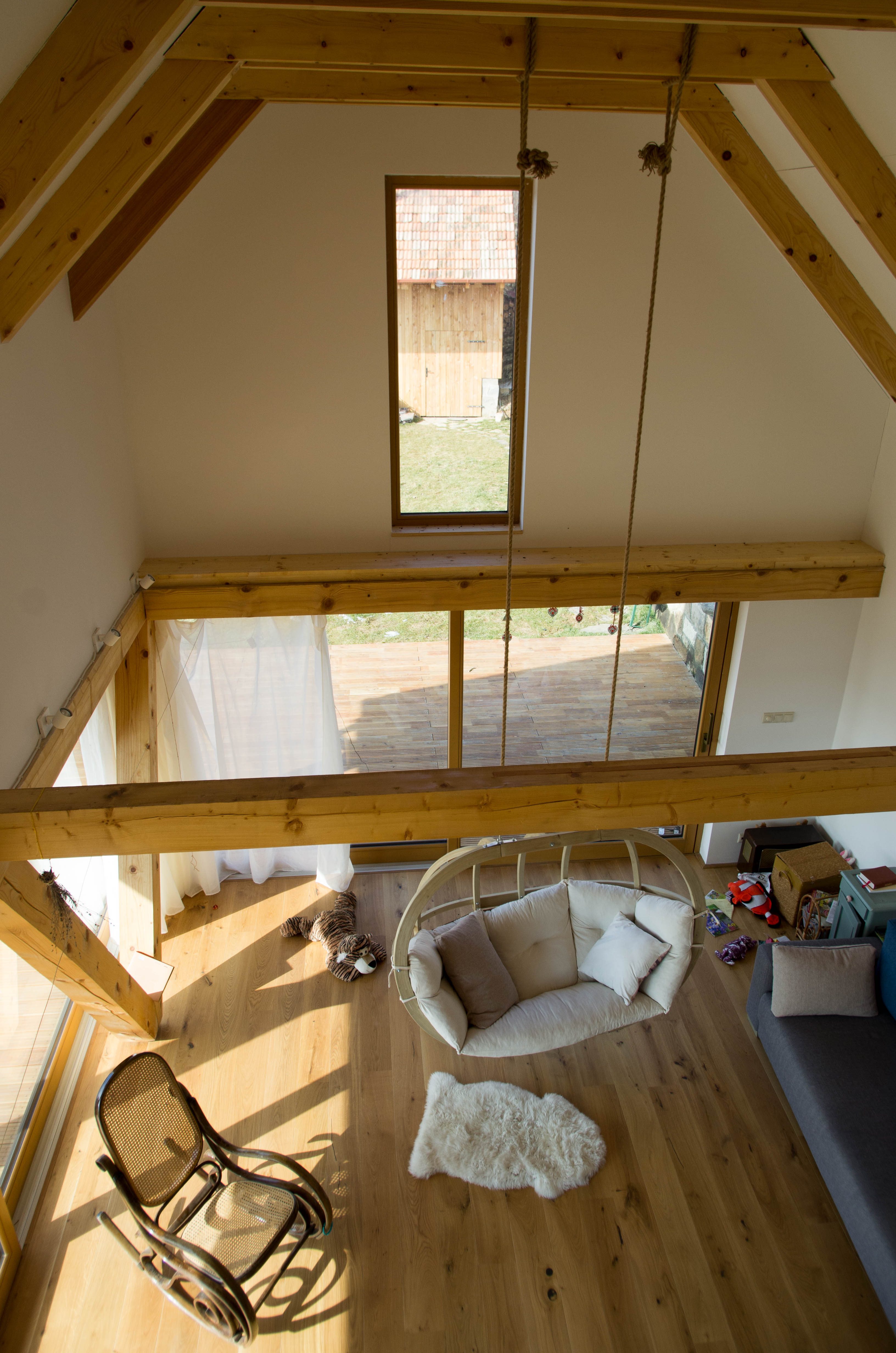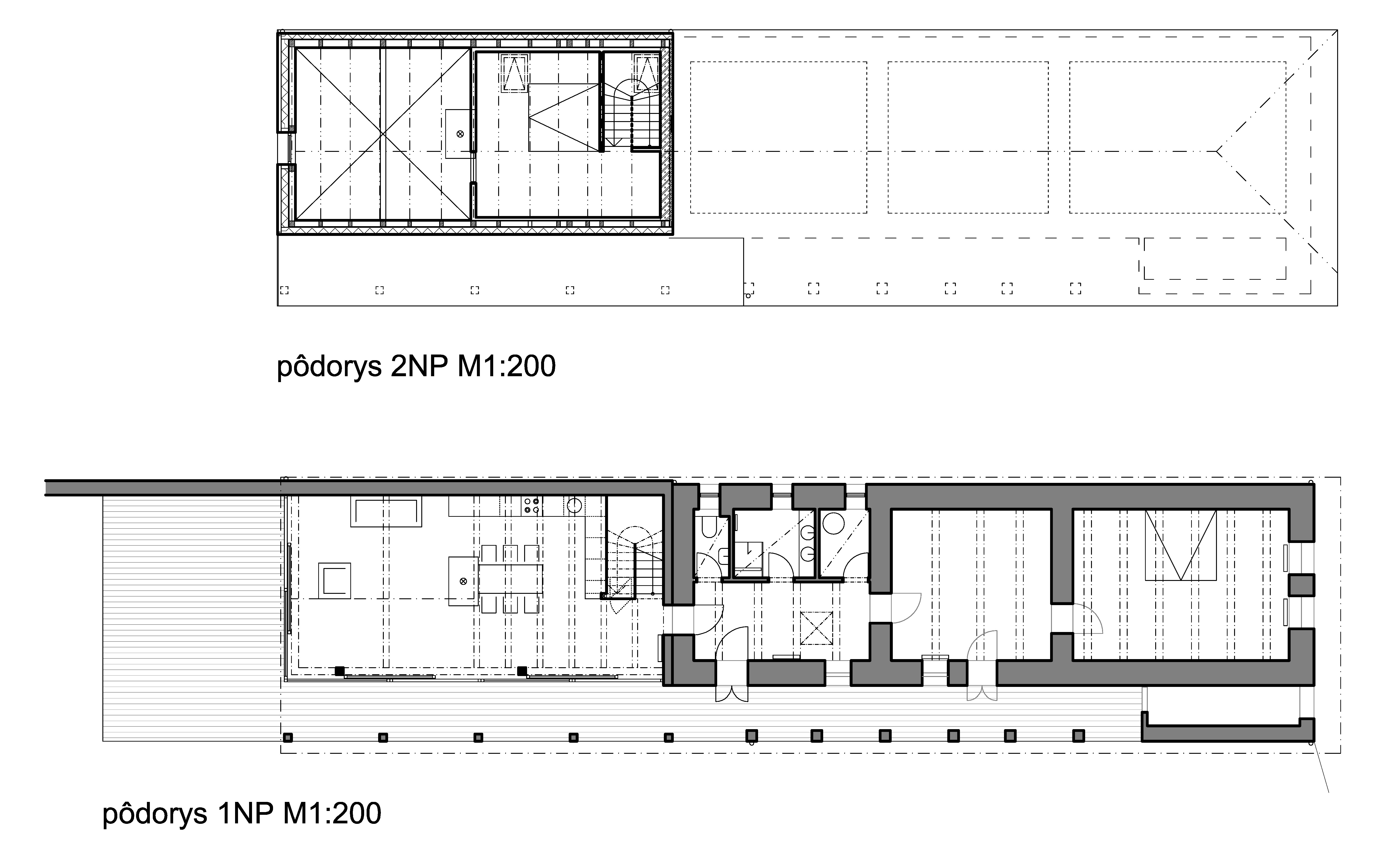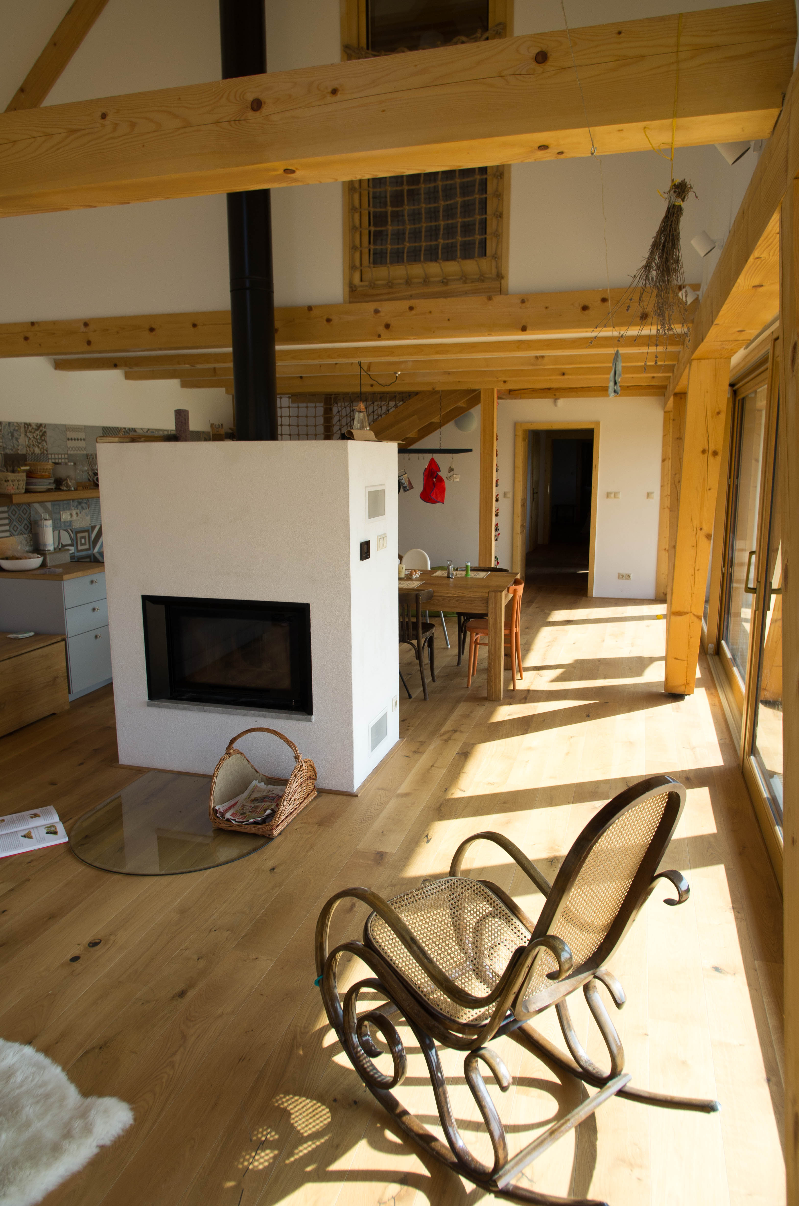 Napravo sú miestnosti starého domu, ktoré sme ponechali bez zmeny. Naľavo je nová prístavba z dreva a skla, až prekvapivo útulná a presvetlená. Priestor jedálne a kuchyne je znížený, nad ním je v podkroví situovaná hosťovská izba s výhľadom do obývačky. Obytná - denná zóna je na samom konci domu v dotyku so záhradou. Tvorí ju prevýšený priestor, v ktorom je čitateľná konštrukcia pôvodného krovu. Priestor je opticky prepojený s kuchyňou, predelený len objemom krbu. V-stĺpy tvoria optickú bariéru, budú vyplnené knihami, čím sa stanú výrazným prvkom interiéru.