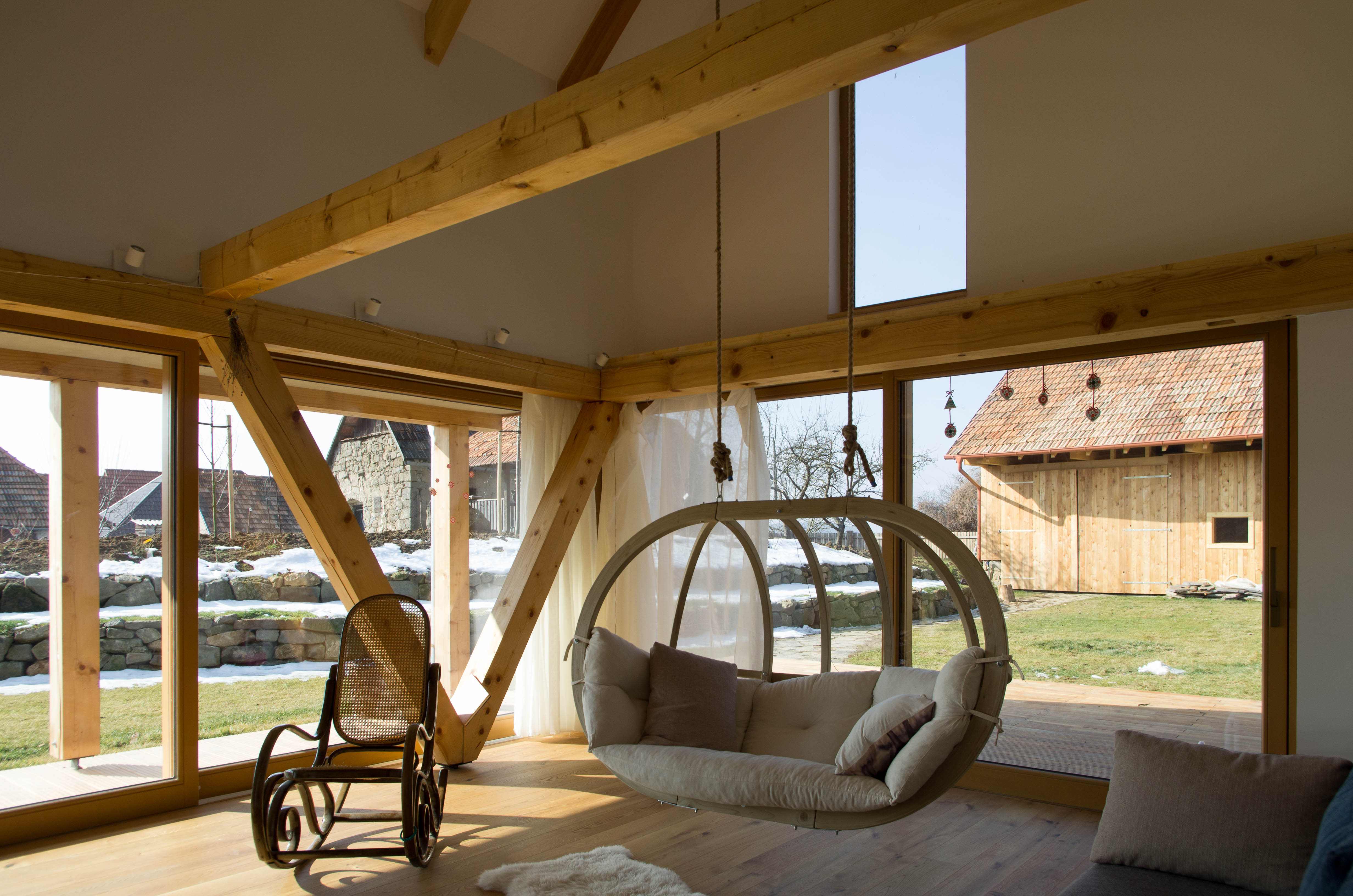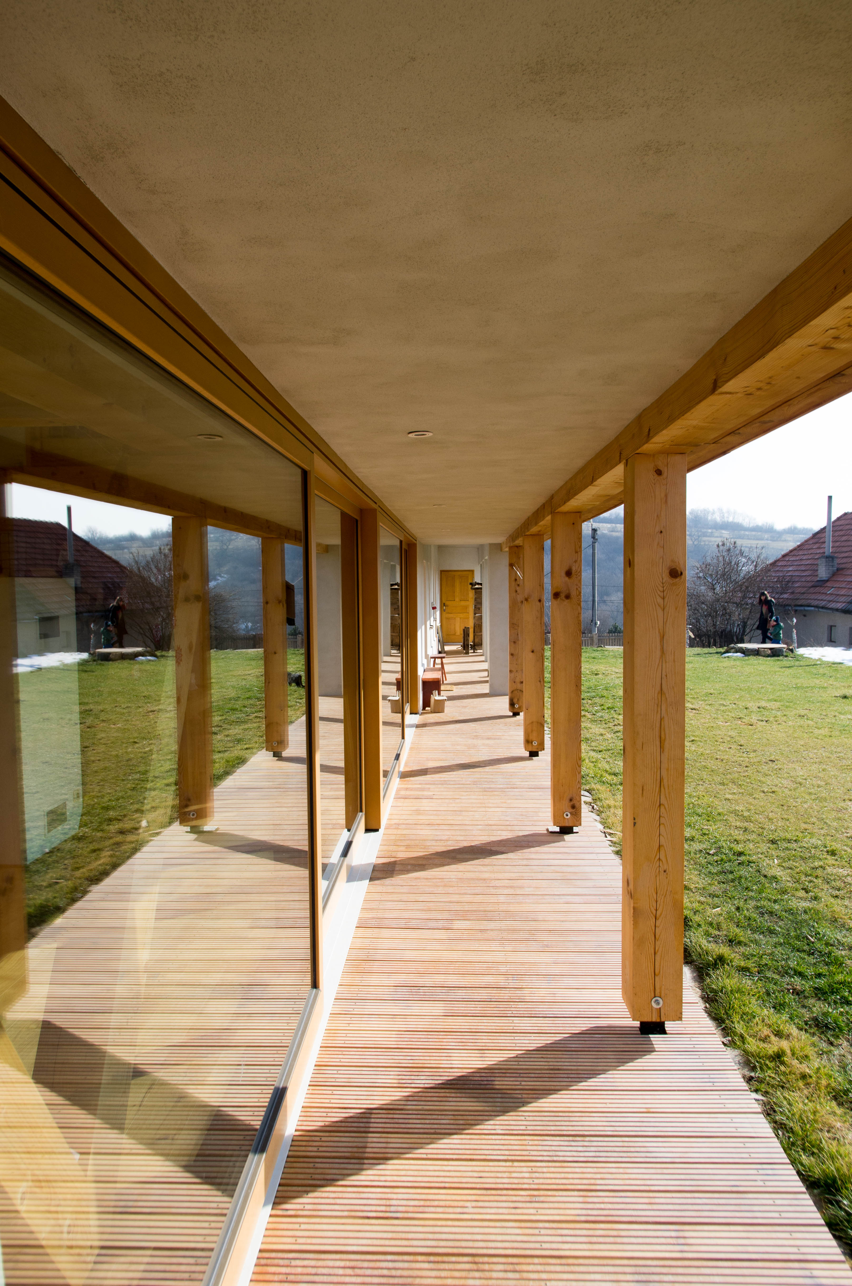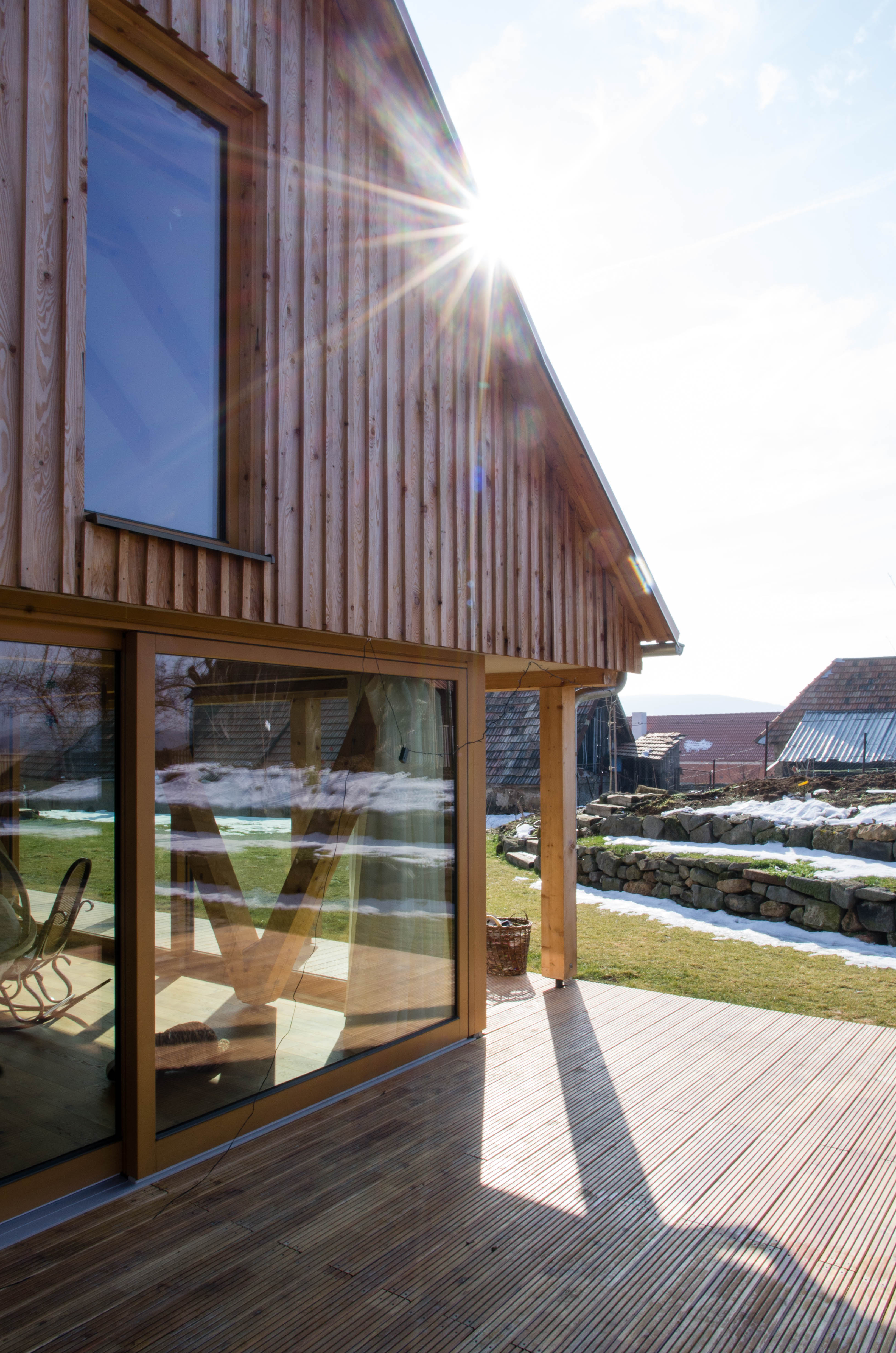 Napravo sú miestnosti starého domu, ktoré sme ponechali bez zmeny. Naľavo je nová prístavba z dreva a skla, až prekvapivo útulná a presvetlená. Priestor jedálne a kuchyne je znížený, nad ním je v podkroví situovaná hosťovská izba s výhľadom do obývačky. Obytná - denná zóna je na samom konci domu v dotyku so záhradou. Tvorí ju prevýšený priestor, v ktorom je čitateľná konštrukcia pôvodného krovu. Priestor je opticky prepojený s kuchyňou, predelený len objemom krbu. V-stĺpy tvoria optickú bariéru, budú vyplnené knihami, čím sa stanú výrazným prvkom interiéru.