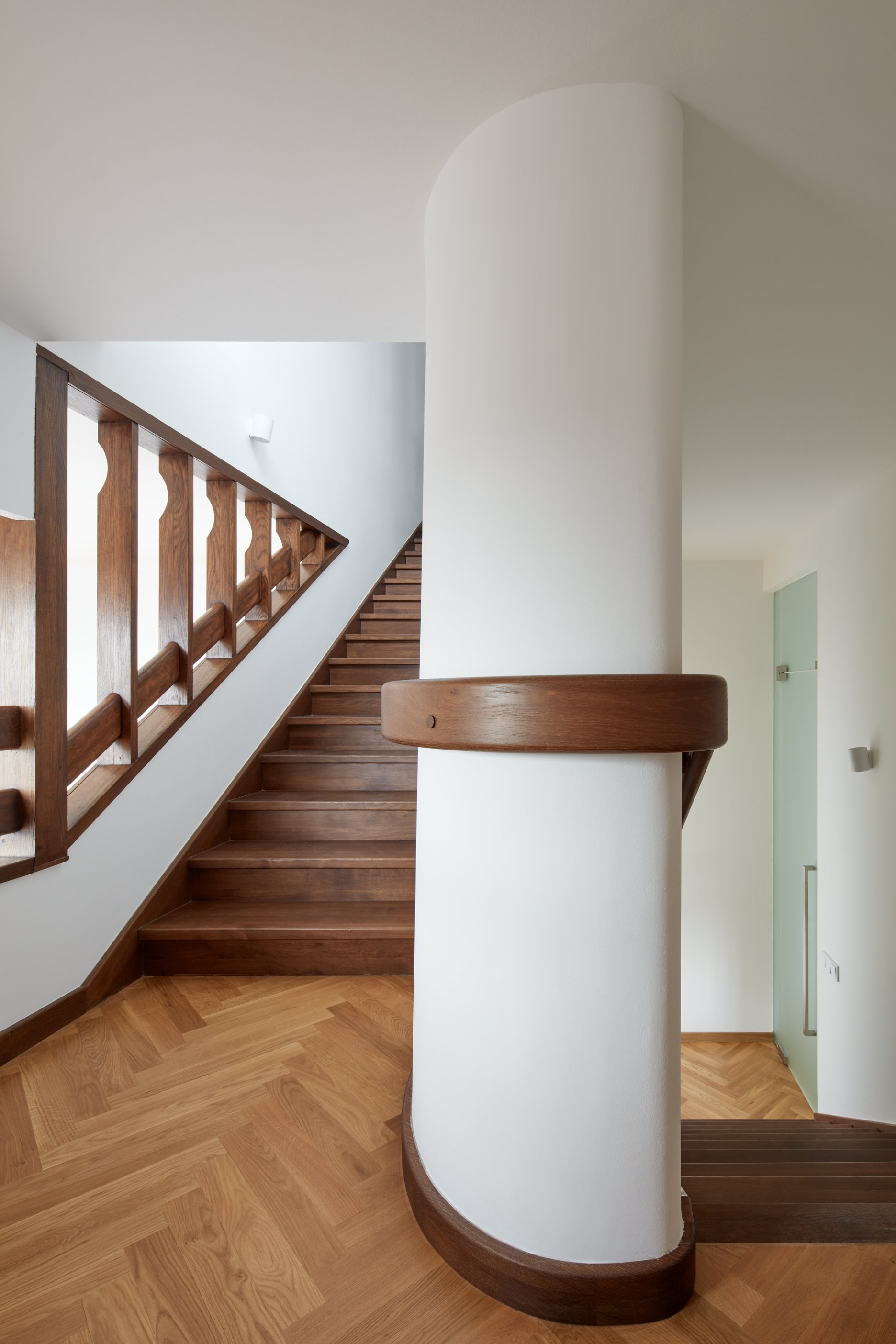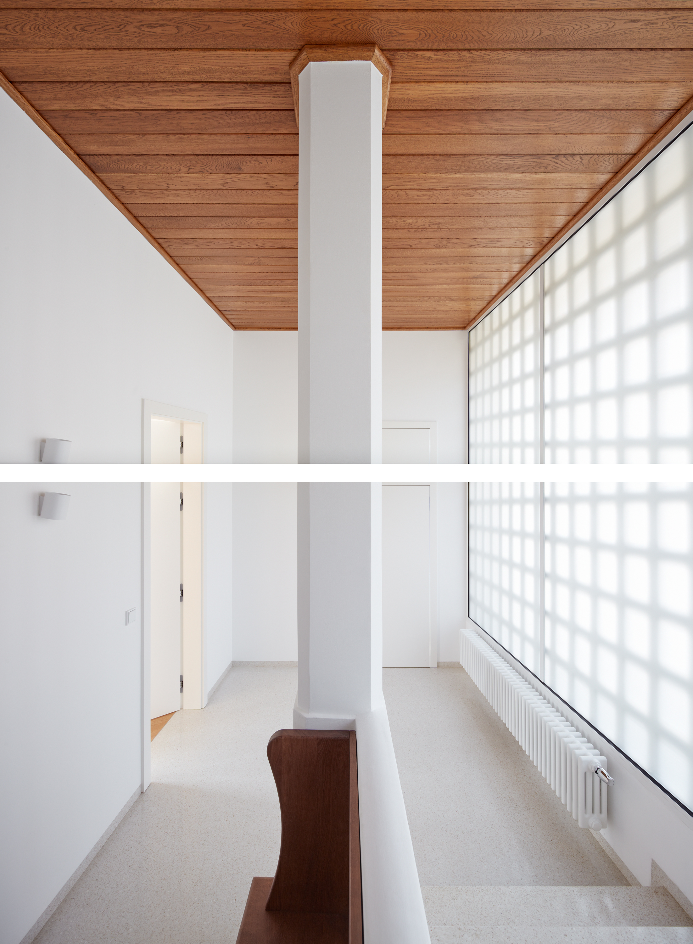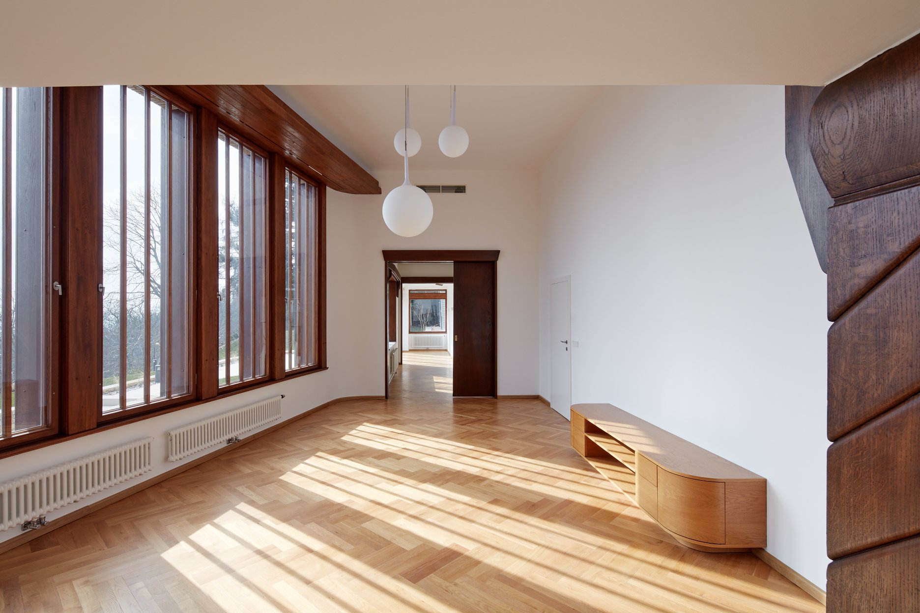 Interiér domu trpel "kreativitou" majiteľov z druhej polovice 20. storočia. “Usilovali jsme o odstranění těchto naplavenin a zdůraznění originálního konceptu, který byl jednoduchý a přitom velmi působivý, změny dispozic oproti původnímu řešení jsme prováděli pouze minimálně, s ohledem na současné provozní nároky,” vysvetľujú architekti.