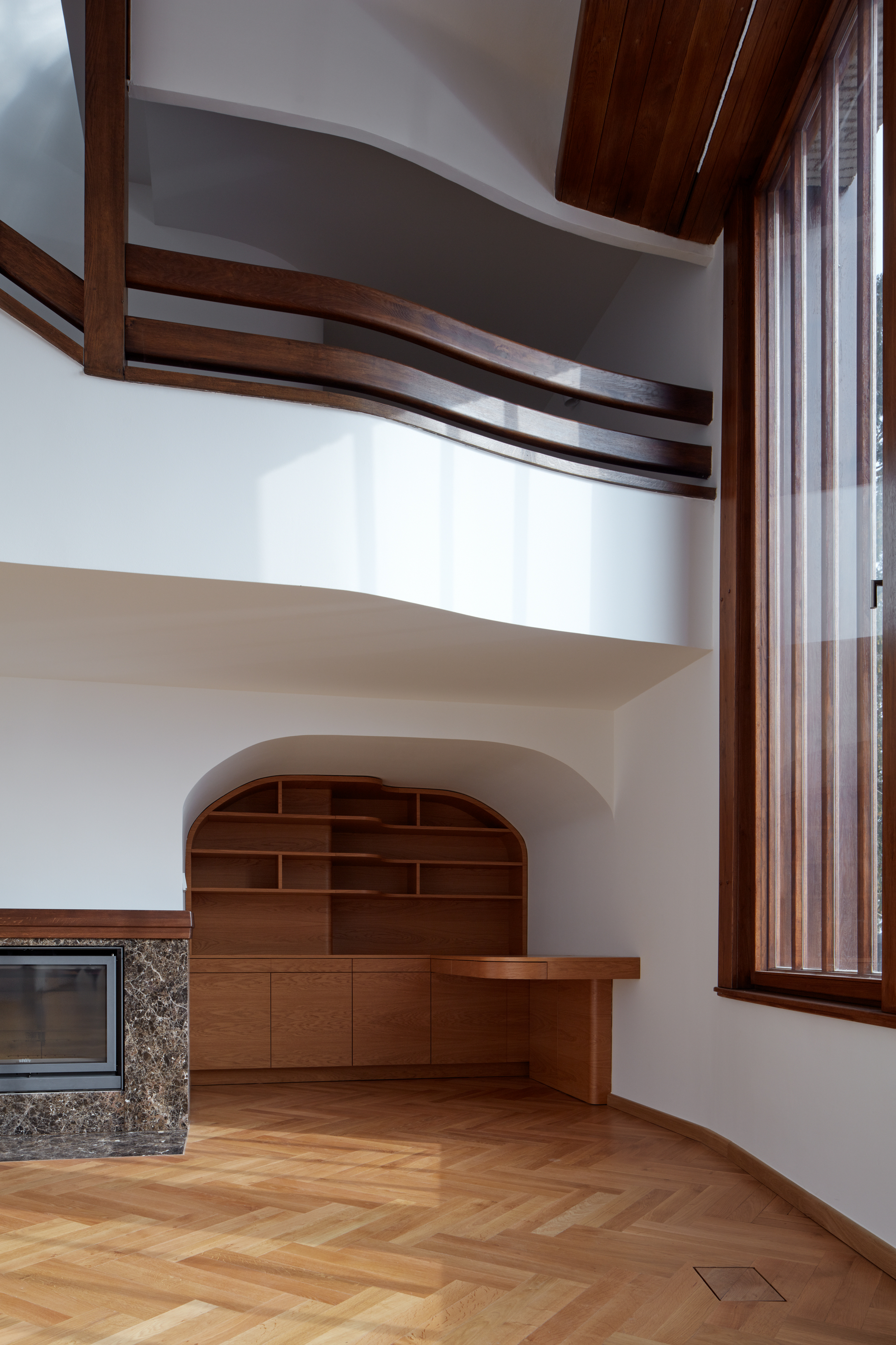Architektúru podčiarkujú drevené prvky, zvyčajne z tmavo moreného dubu. Detaily, ktoré odkazujú na spomínané americké inšpirácie, sa podarilo zachovať. Či už ide o veľké posuvné dvere s unikátnym kovaním, ktoré sa zasúvajú do puzdra v stene, alebo detaily zábradlia, krbu a rámov okien.
