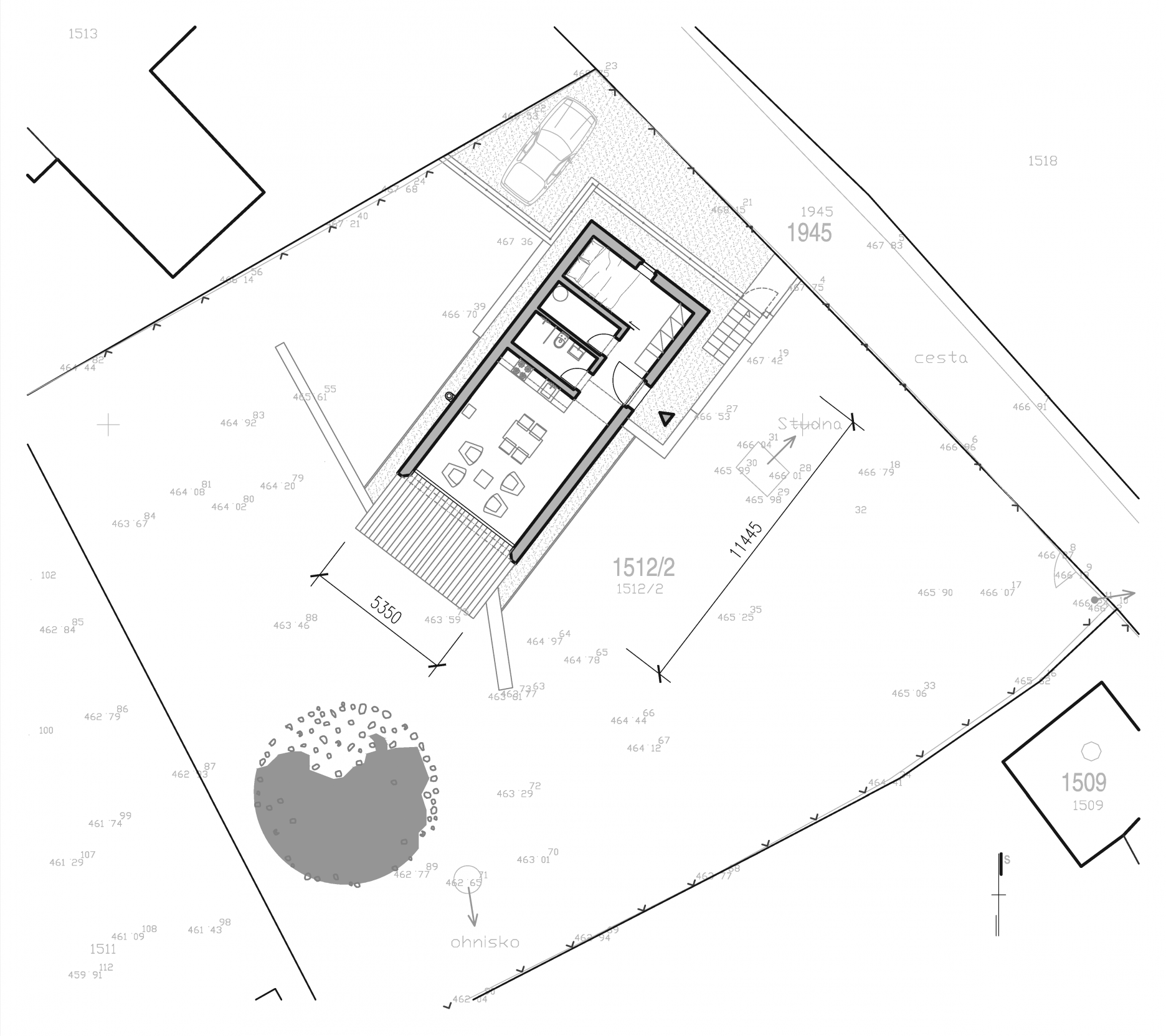 Príjazdová cesta, ktorá vedie k hornej hranici pozemku sa v mieste stavby rozširuje na odstavné parkovisko. Z predpolia objektu klesá niekoľko schodov k vstupu na juhovýchodnej strane chaty. Lineárna stavba je v teréne orientovaná v severo-južnej osi.