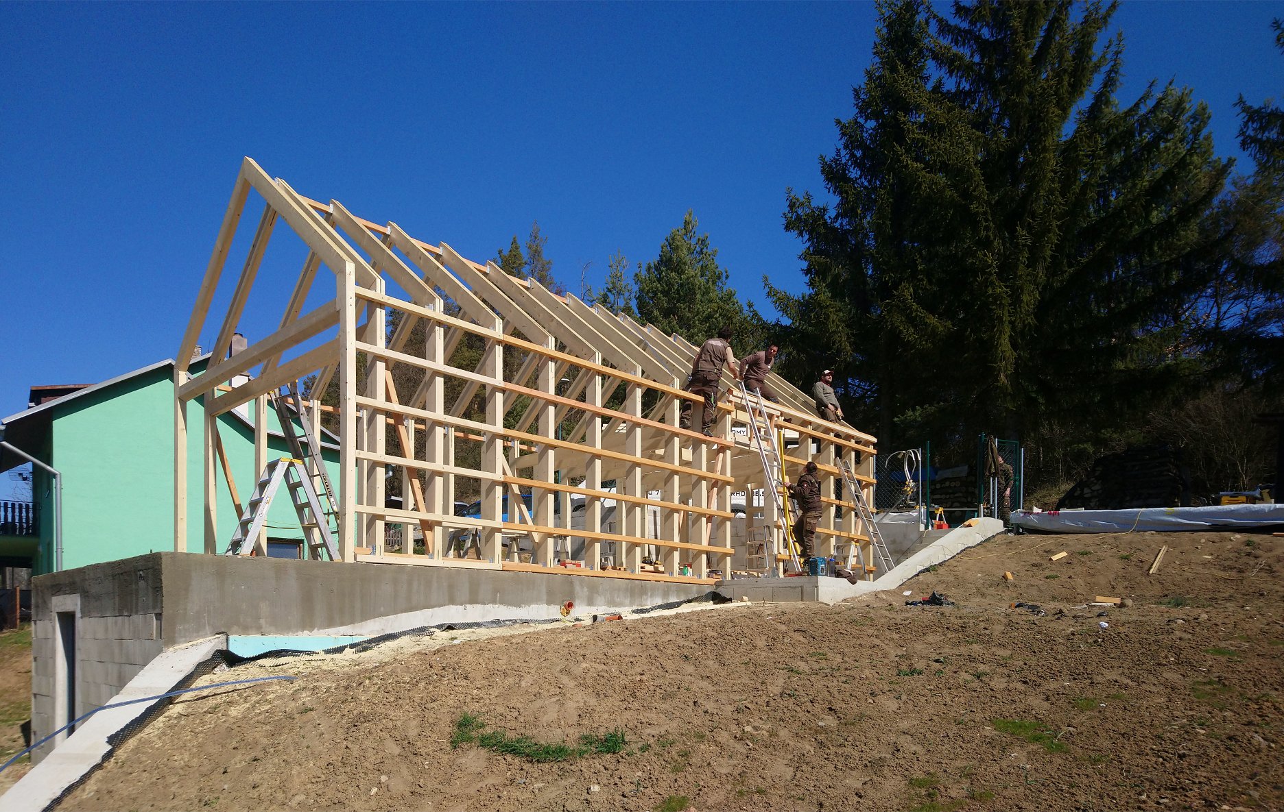 Na monolitickom funduse suterénu, doplnenom betónovými debniacimi tvarovkami, stojí drevená rámová konštrukcia, spájaná oceľovými rohovými prvkami. Na nosné rámy nadväzuje sekundárny drevený rošt, nesúci MFP drevené dosky ohraničujúce obvodový plášť objektu. Hlavný nosný drevený rám tvoria drevené profily s rozmerom 100 x 220mm. Sekundárny rám využíva hranoly s prierezom 70 x 70mm. Ako výplne otvorov architekt zvolil plastové viackomorové okná, zasklené izolačným trojsklom a sendvičové hliníkové vstupné dvere. Pohľadová vrstva obvodového plášťa je realizovaná ako trojzložkový polyuretánový nástrek, aplikovaný priamo na drevenú podkladovú vrstvu z MFP dosiek. Sadrokartónové dosky, ktoré tvoria finálny povrch zo strany interiéru, sú predsadené pred podkladovú vrstvu z MFP dosiek.