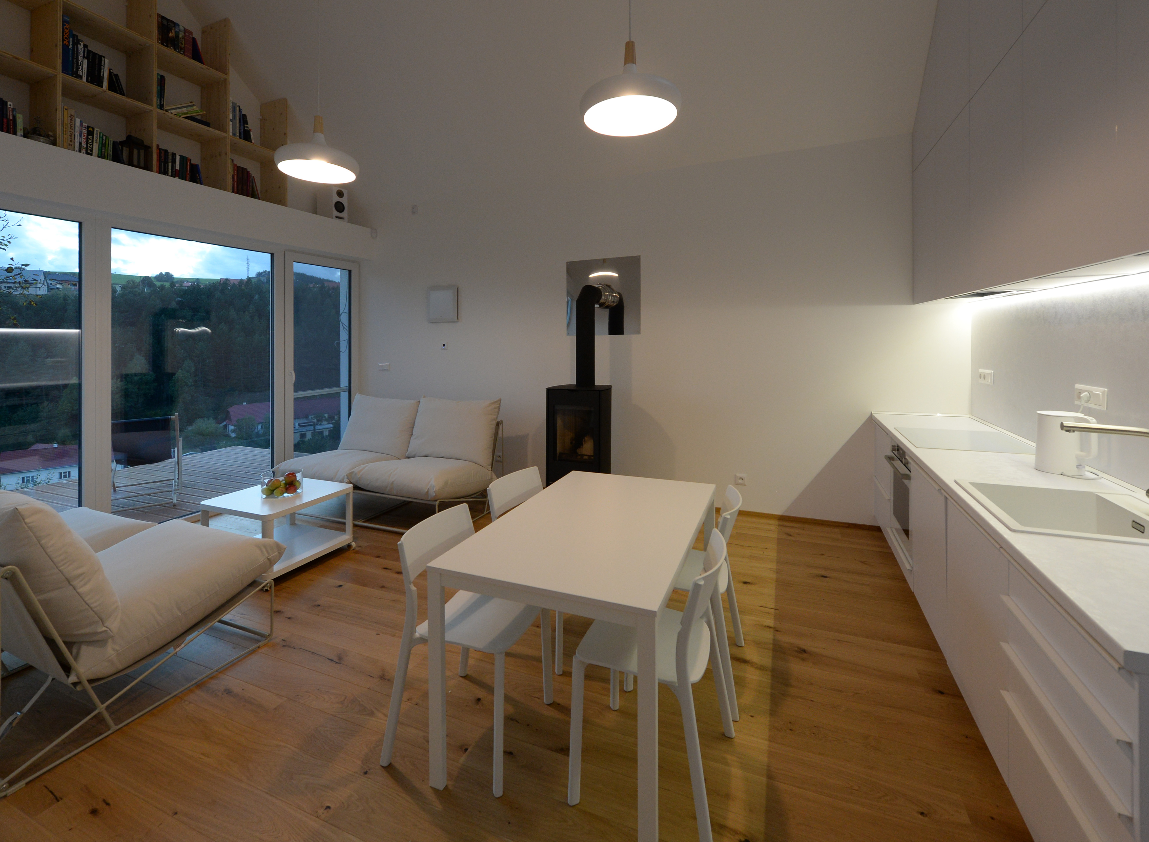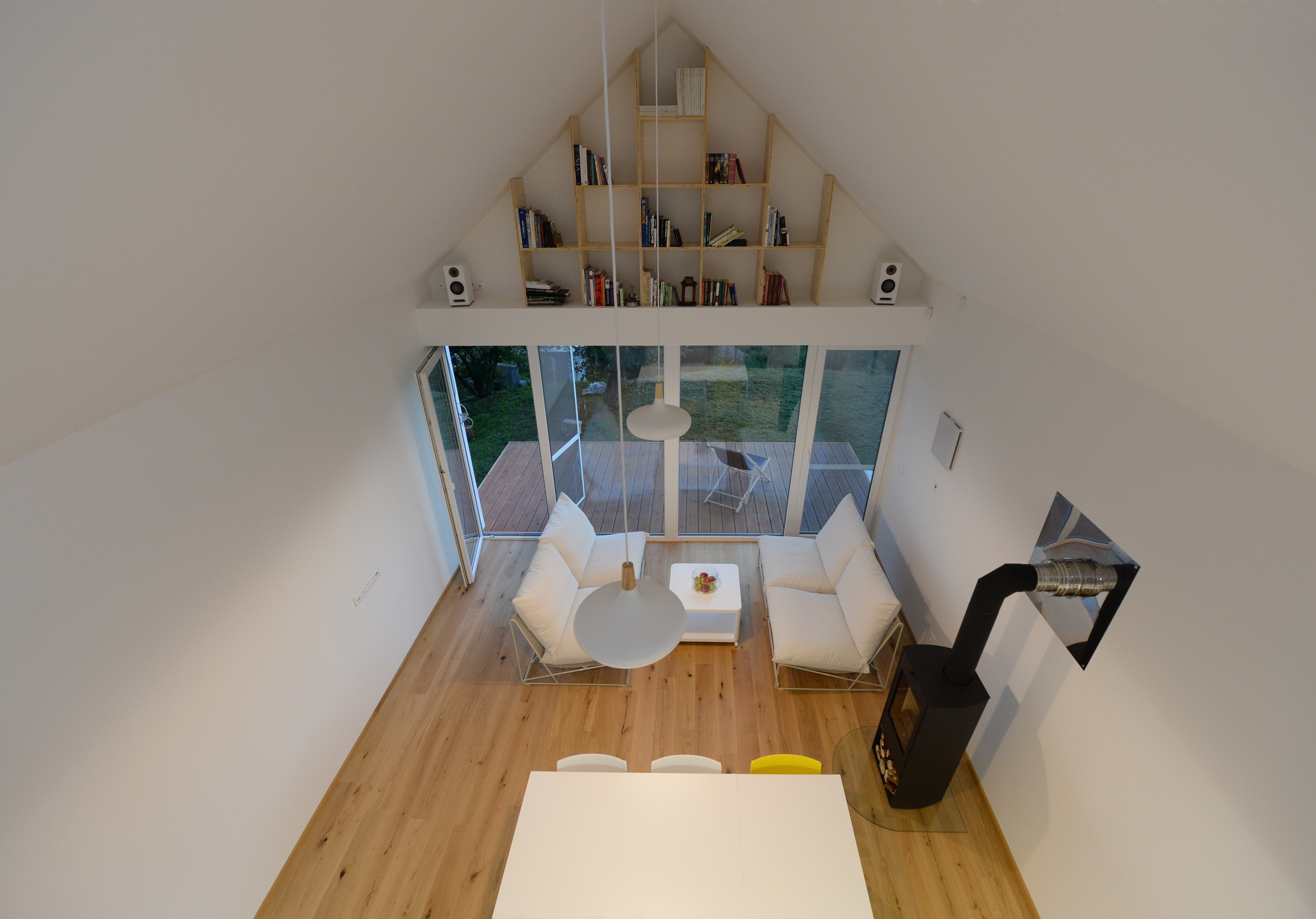 Obývacia izba, otvorená až po hrebeň strechy je na južnej strane opticky prepojená so záhradou. Zasklenie zaberá veľkú časť štítovej steny. Svetlá výška v interiéri sa pohybuje v rozmedzí od 2930 až po 4765 mm.