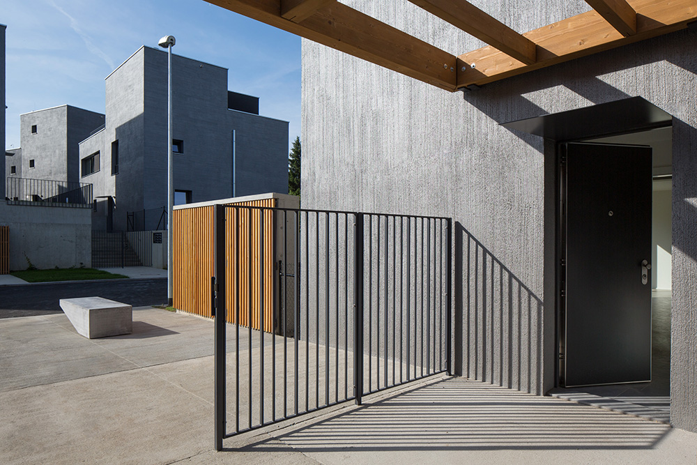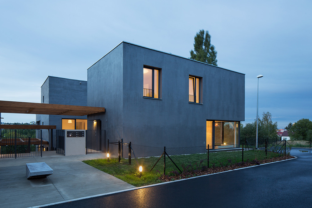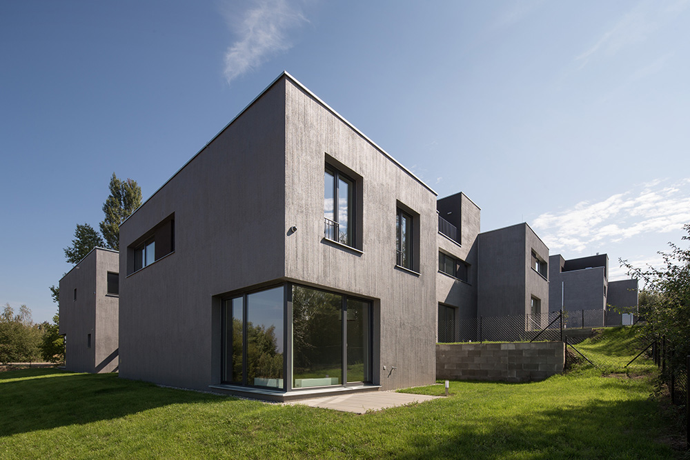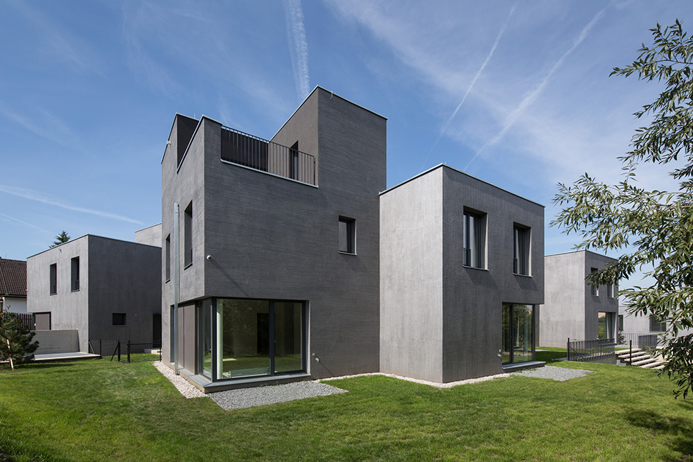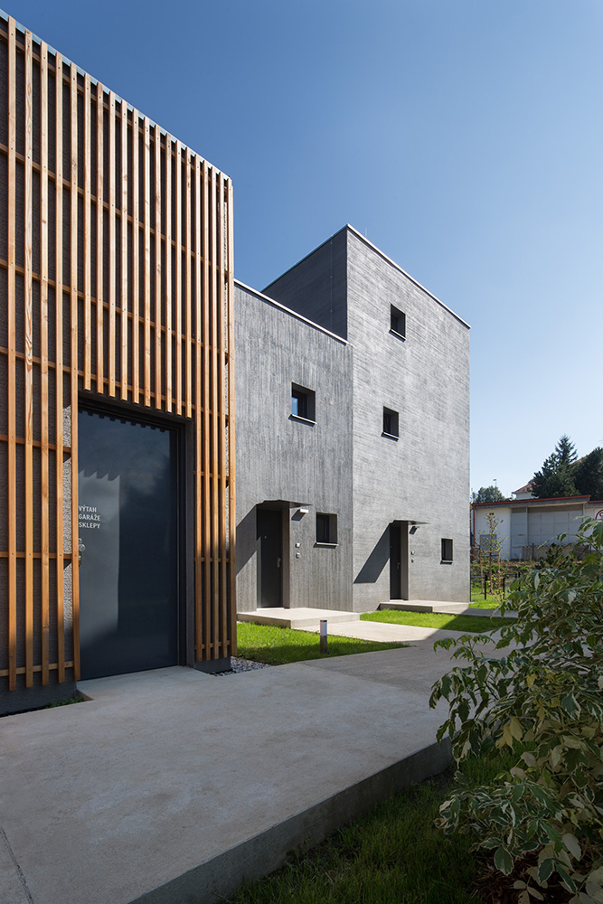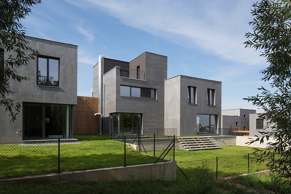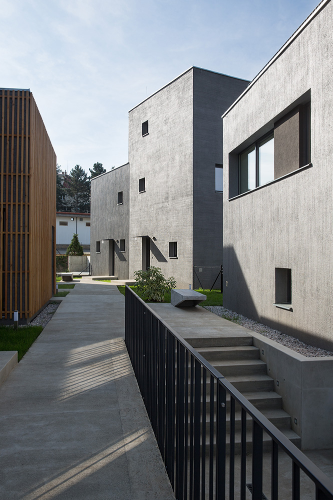 Nad spoločným podzemným podlažím stojí trinásť bytových jednotiek rozložených do viacerých úrovní. Pri pohľade zvonku preto jednotky vyzerajú ako polovice dvojdomov či samostatné rodinné domy. Každý byt má vlastnú záhradu s vonkajšou terasou. Trojpodlažné byty sú navyše na druhom poschodí doplnené o terasou.