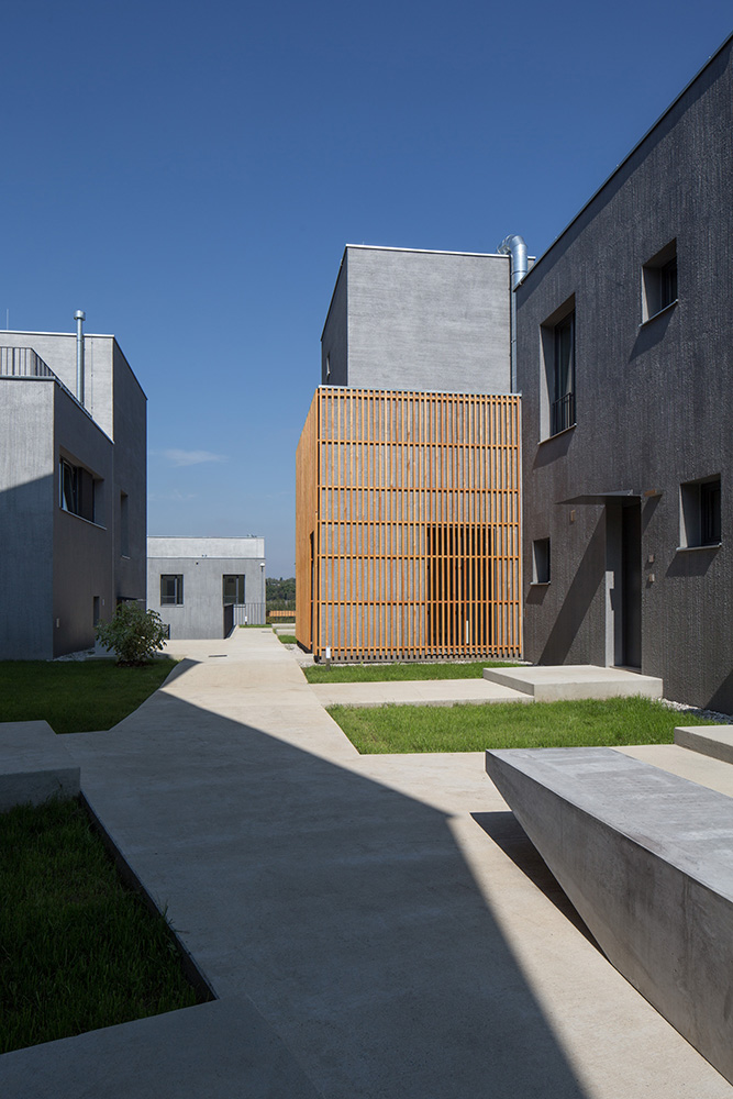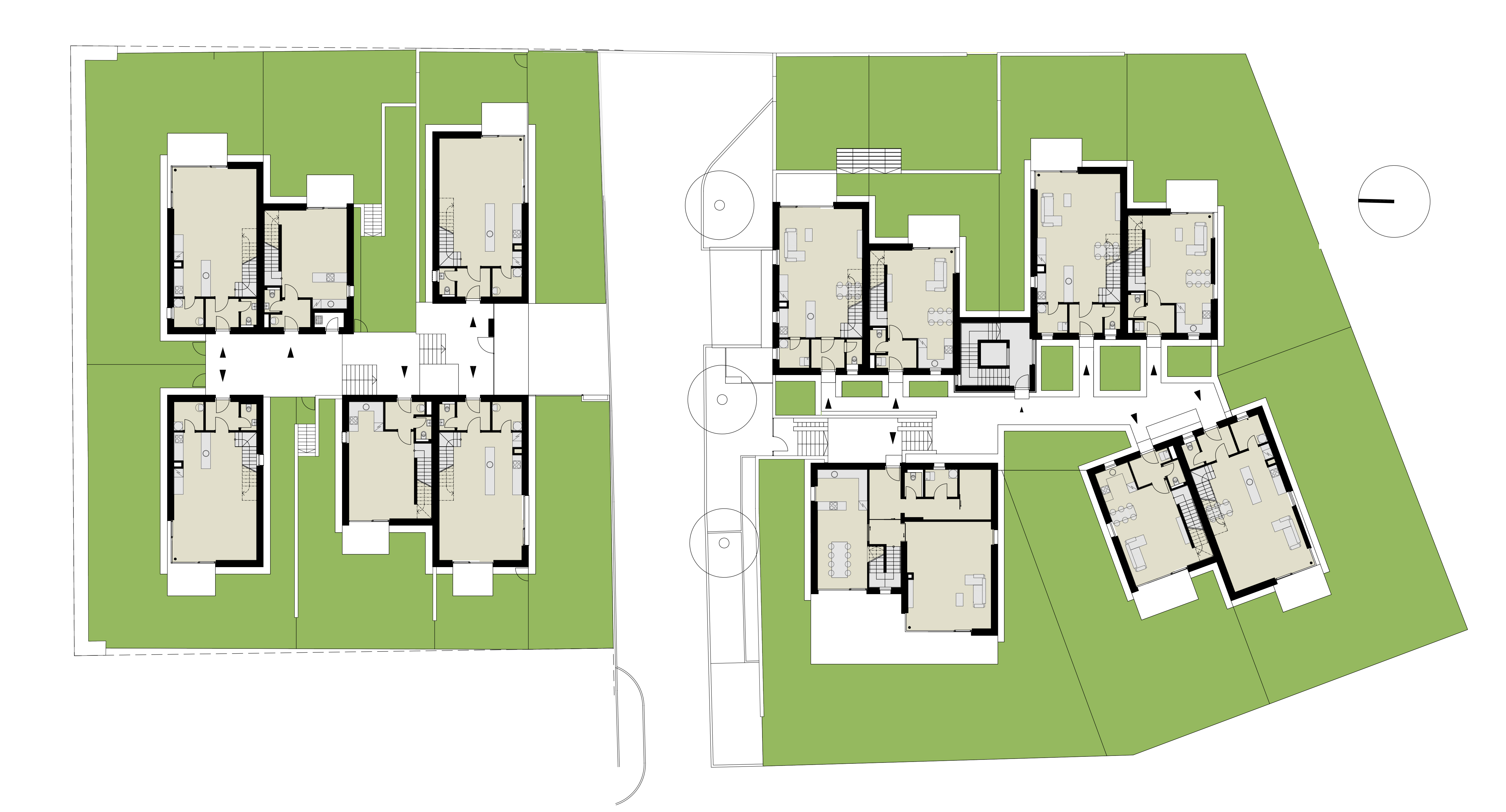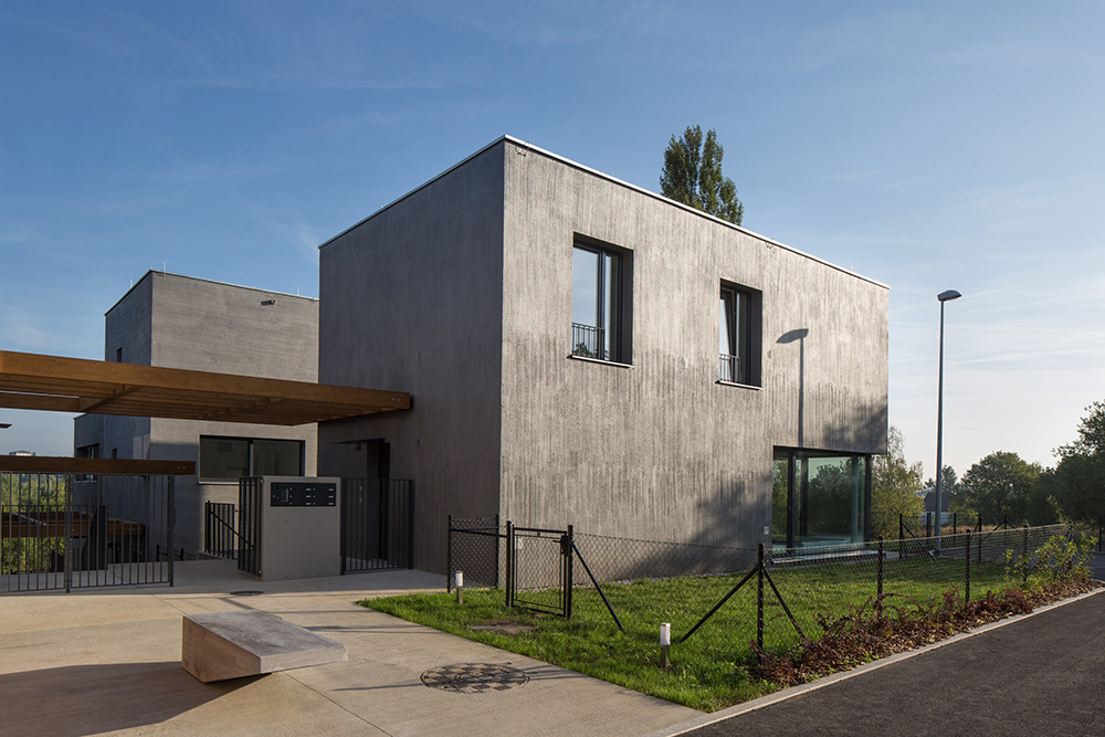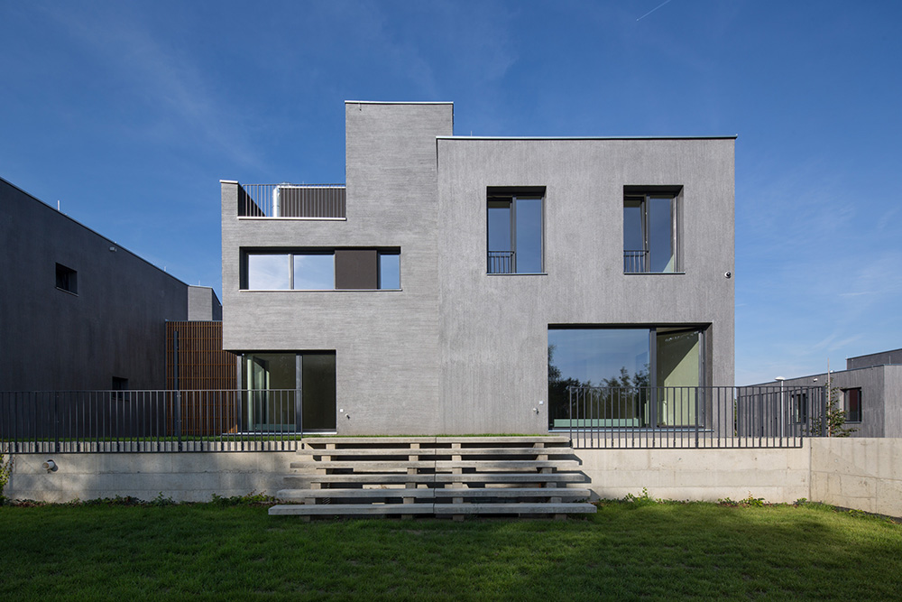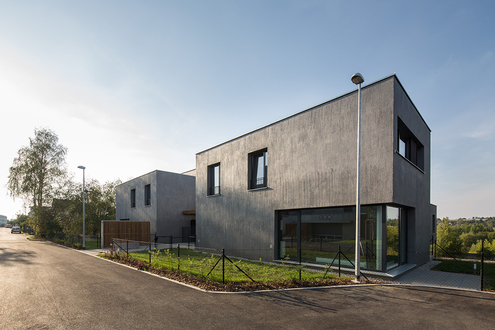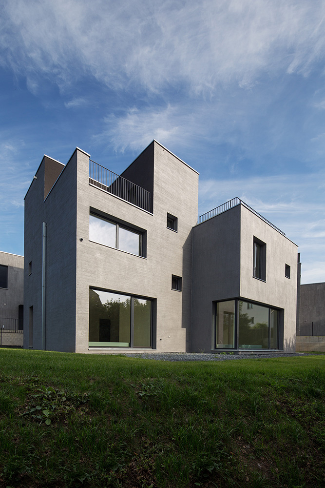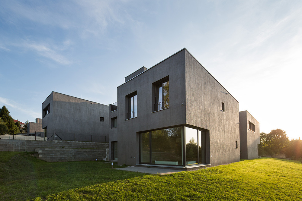 Nad spoločným podzemným podlažím stojí trinásť bytových jednotiek rozložených do viacerých úrovní. Pri pohľade zvonku preto jednotky vyzerajú ako polovice dvojdomov či samostatné rodinné domy. Každý byt má vlastnú záhradu s vonkajšou terasou. Trojpodlažné byty sú navyše na druhom poschodí doplnené o terasou.