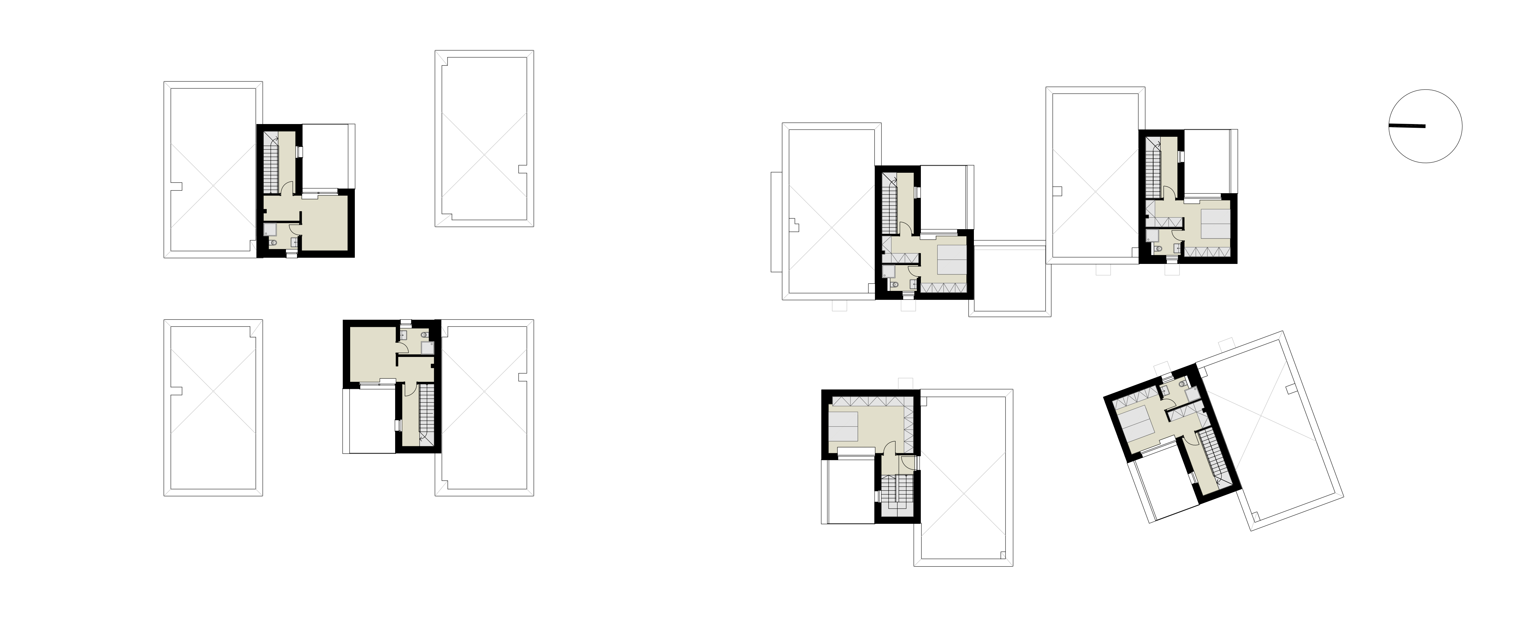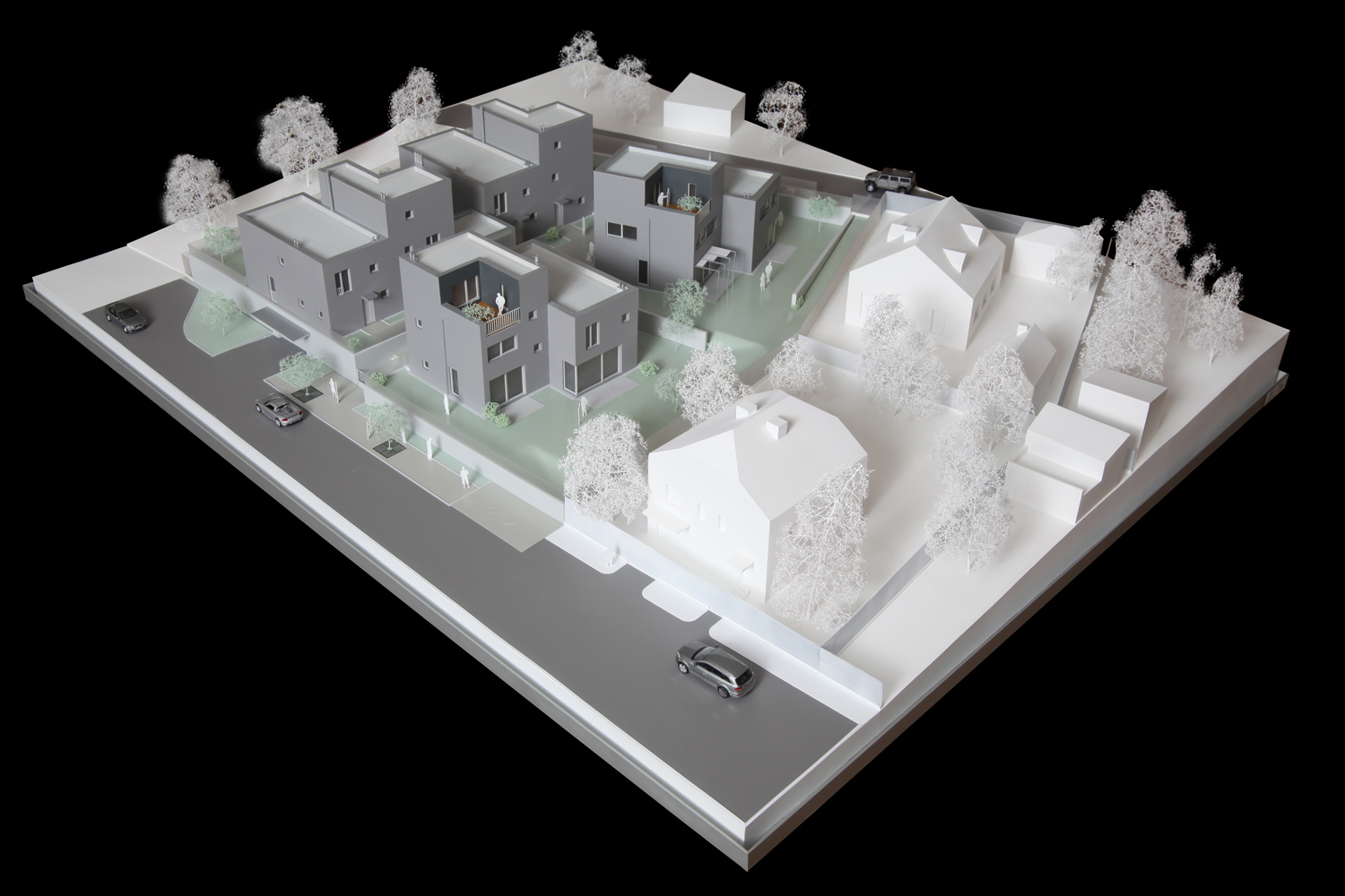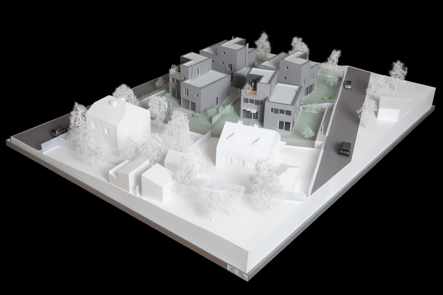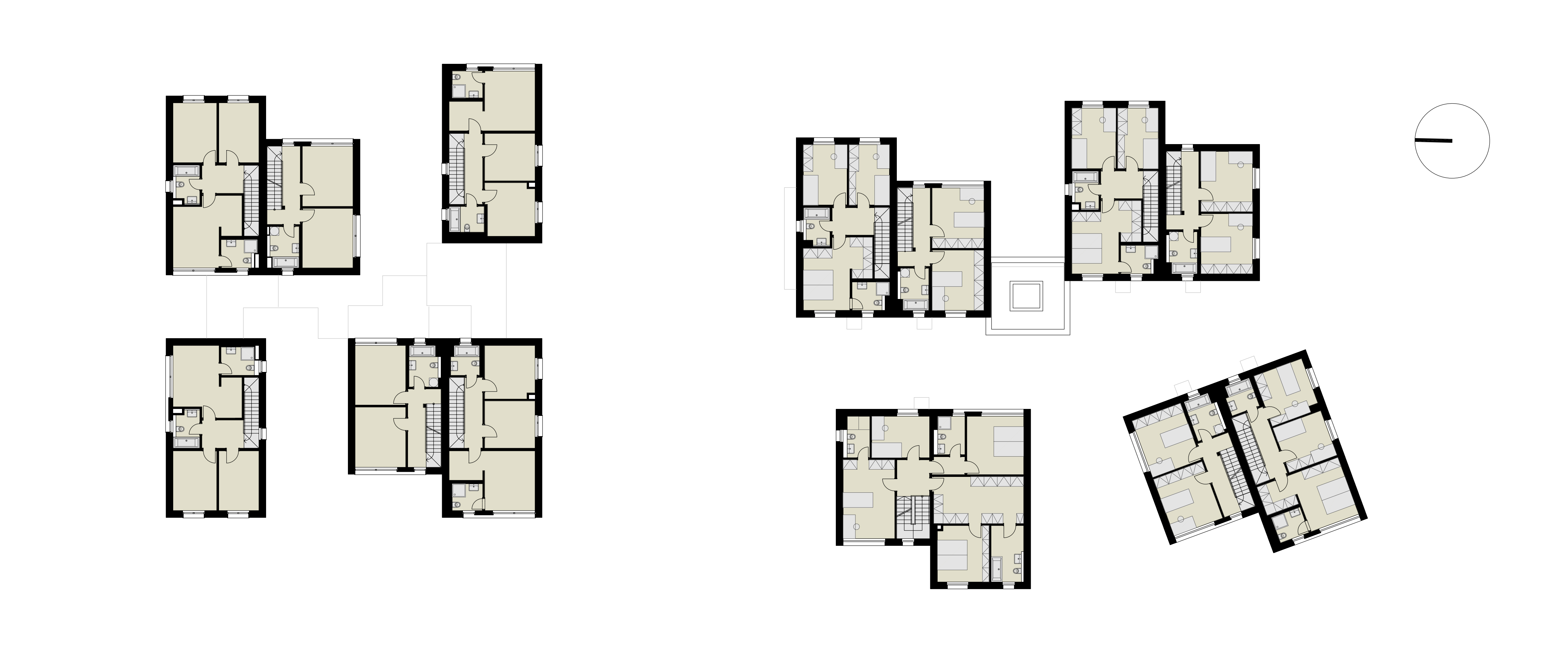 Nad spoločným podzemným podlažím stojí trinásť bytových jednotiek rozložených do viacerých úrovní. Pri pohľade zvonku preto jednotky vyzerajú ako polovice dvojdomov či samostatné rodinné domy. Každý byt má vlastnú záhradu s vonkajšou terasou. Trojpodlažné byty sú navyše na druhom poschodí doplnené o terasou.
