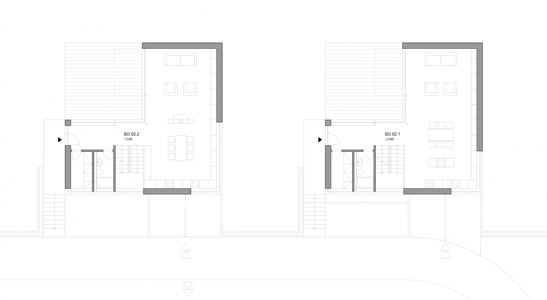 Základné výškové usporiadanie využíva princíp dvoch nadzemných podlaží. Na prízemie situovali architekti dennú časť domu s priamou väzbou na terasu. Poschodie zastrešuje nočnú zónu. Urbanistická koncepcia zabezpečuje dostatočný odstup pre zabezpečenie súkromia aj preslnenia.