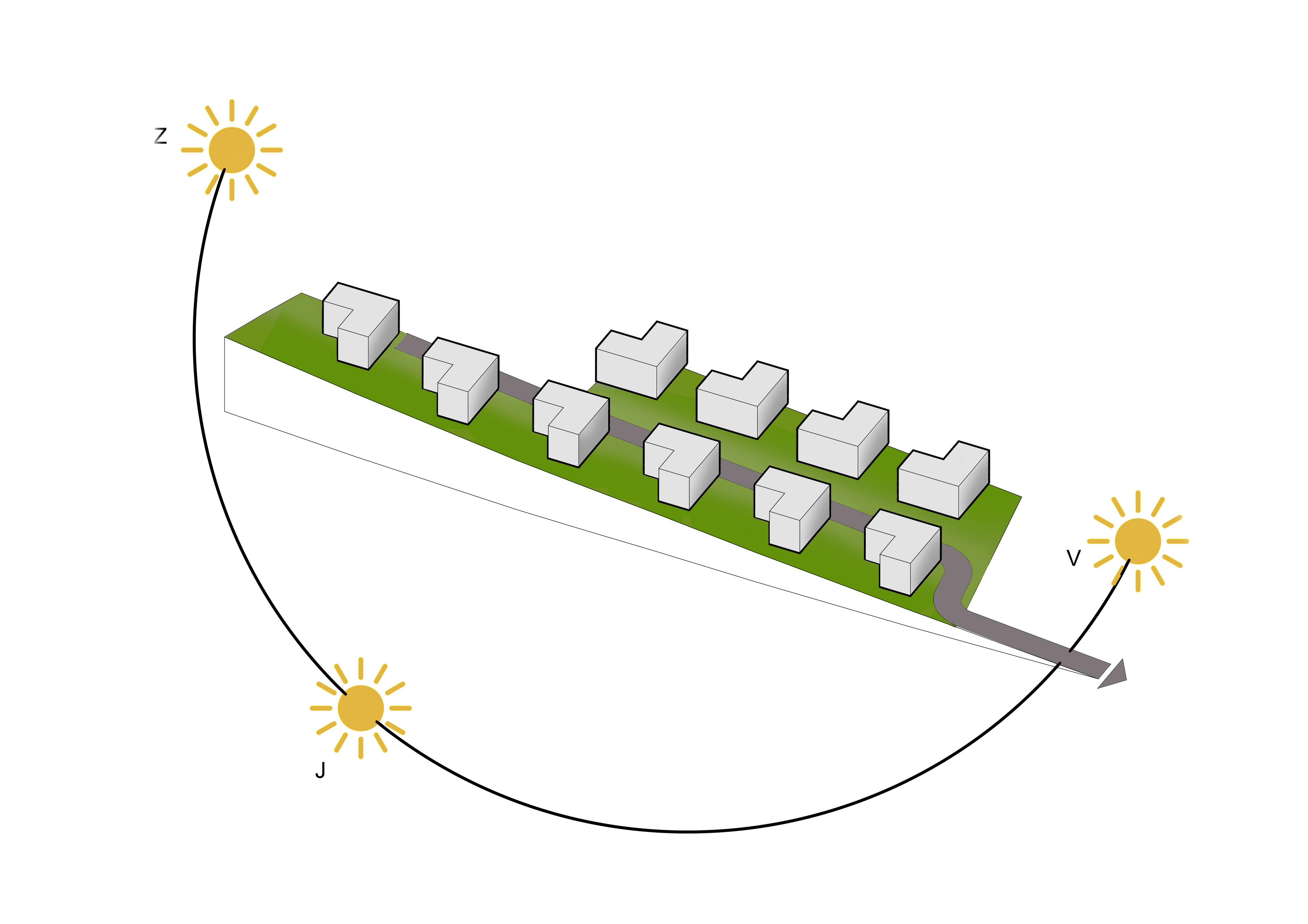 Obytný súbor tvorí zostava piatich rodinných dvojdomov. Objekty, ktoré na prvý pohľad pôsobia ako solitéry, spája spoločný suterén. Hmoty s pôdorysom tvaru “L” sú koncipované tak, aby vytvárali uzavreté obytné átriá s priaznivou orientáciou vnútorných priestorov na juhozápad, alebo juhovýchod. Chrbticou kompozície je komunikácia vedená medzi domami v ťažisku parcely. Každý z domov tak má rovnocenné podmienky na príjazd aj parkovanie. Zvolená konfigurácia optimalizuje využitie priestoru a umožňuje vytvárať ucelené plochy súkromných záhrad s intímnymi zákutiami. Do átrií „vidia“ iba priľahlé okná obytných miestností a sú dobre chránené pred neželanými pohľadmi zo susedstva.