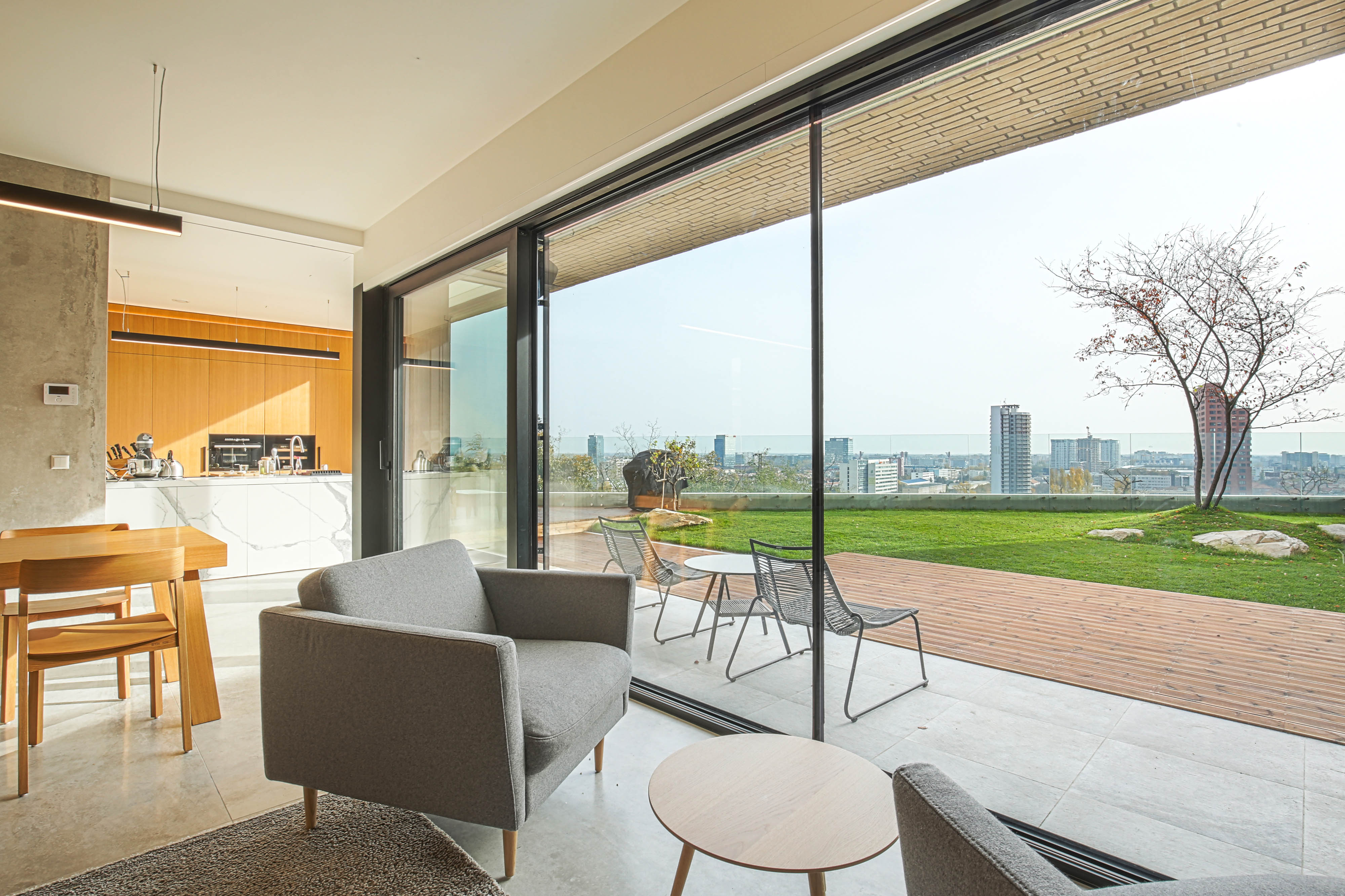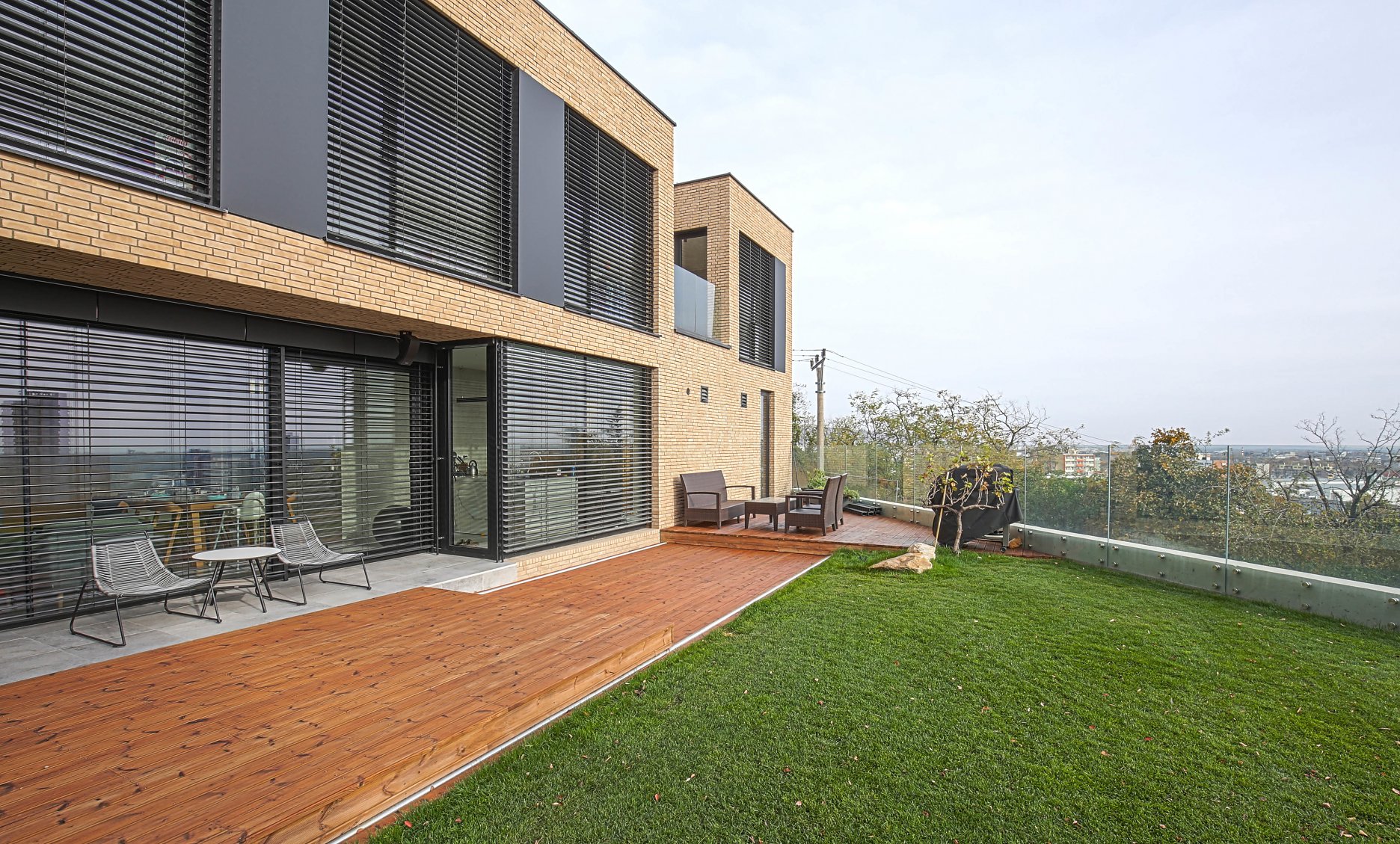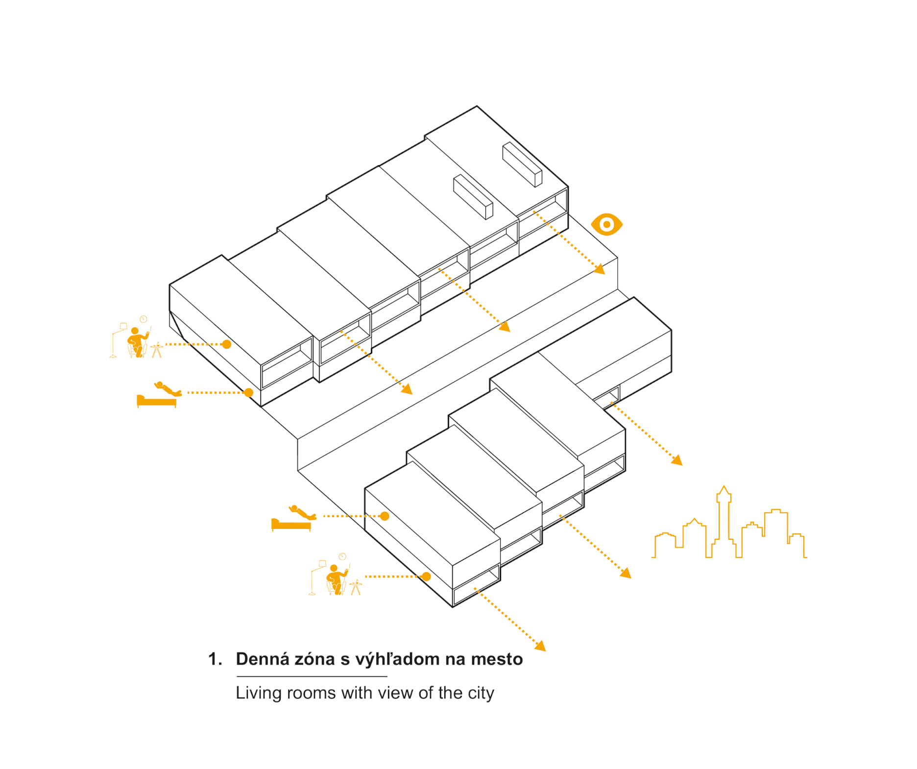 V spodnom rade je denná časť situovaná na nižšom poschodí, v kontakte s terénom a výhľadom na mesto.