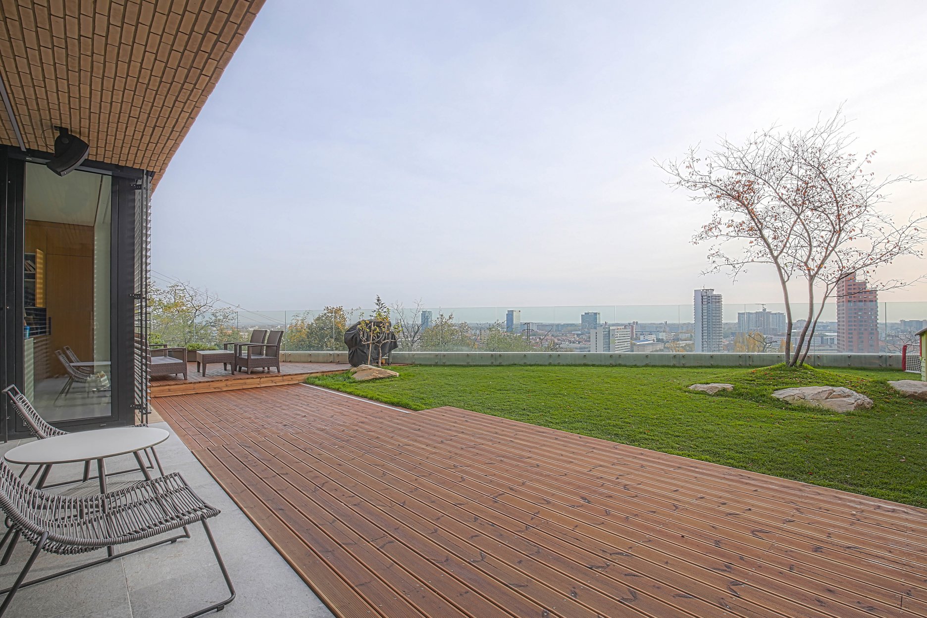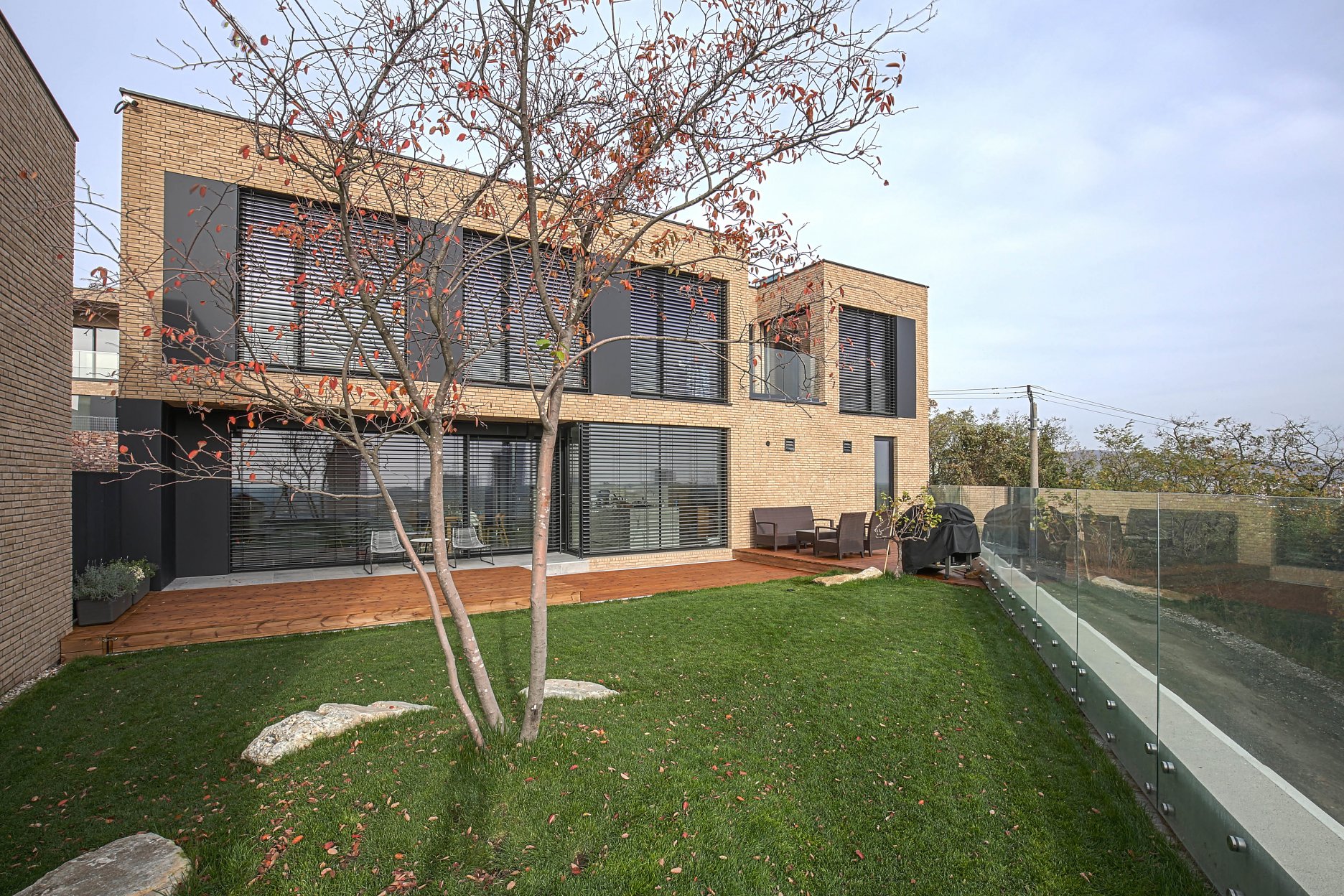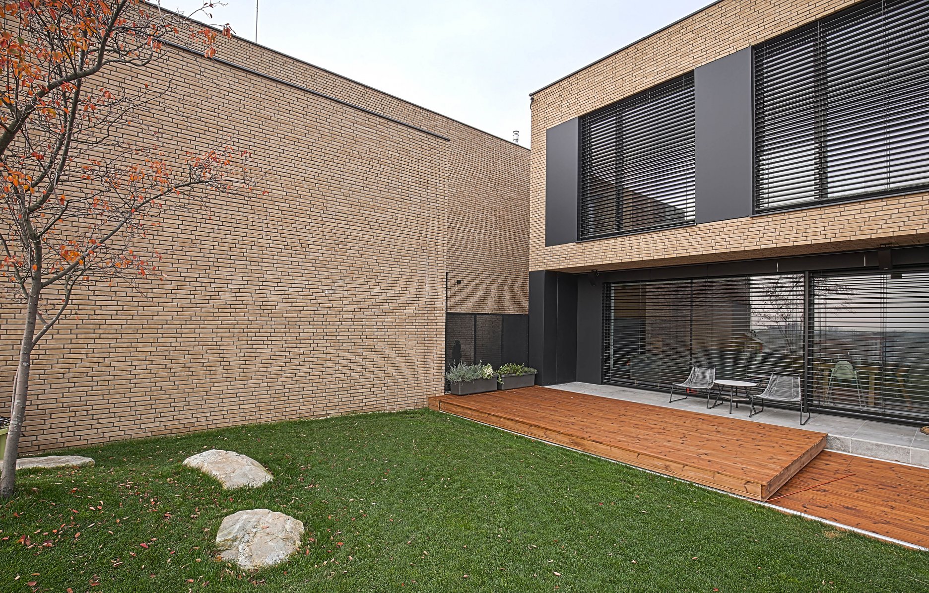 V spodnom rade je denná časť situovaná na nižšom poschodí, v kontakte s terénom a výhľadom na mesto.